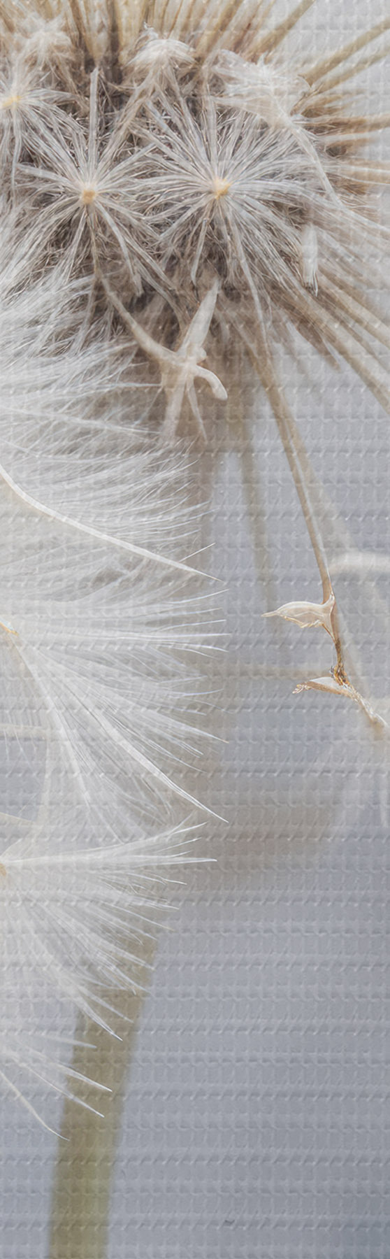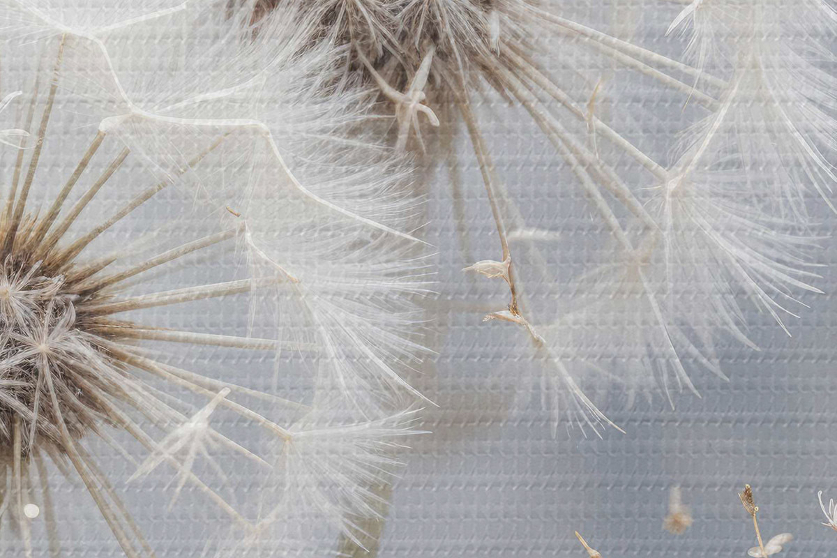 Foto Flores blancas de diente de león con semillas esponjosas sobre fondo gris borroso Nr r40556