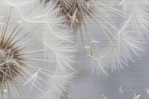 Foto Flores blancas de diente de león con semillas esponjosas sobre fondo gris borroso Nr r40556