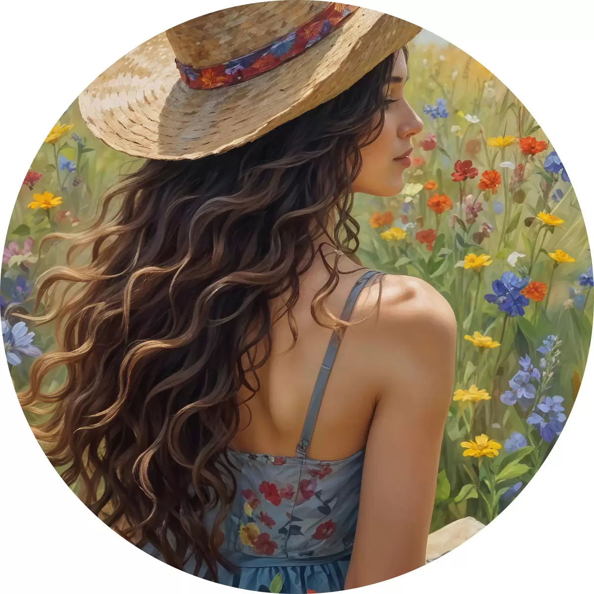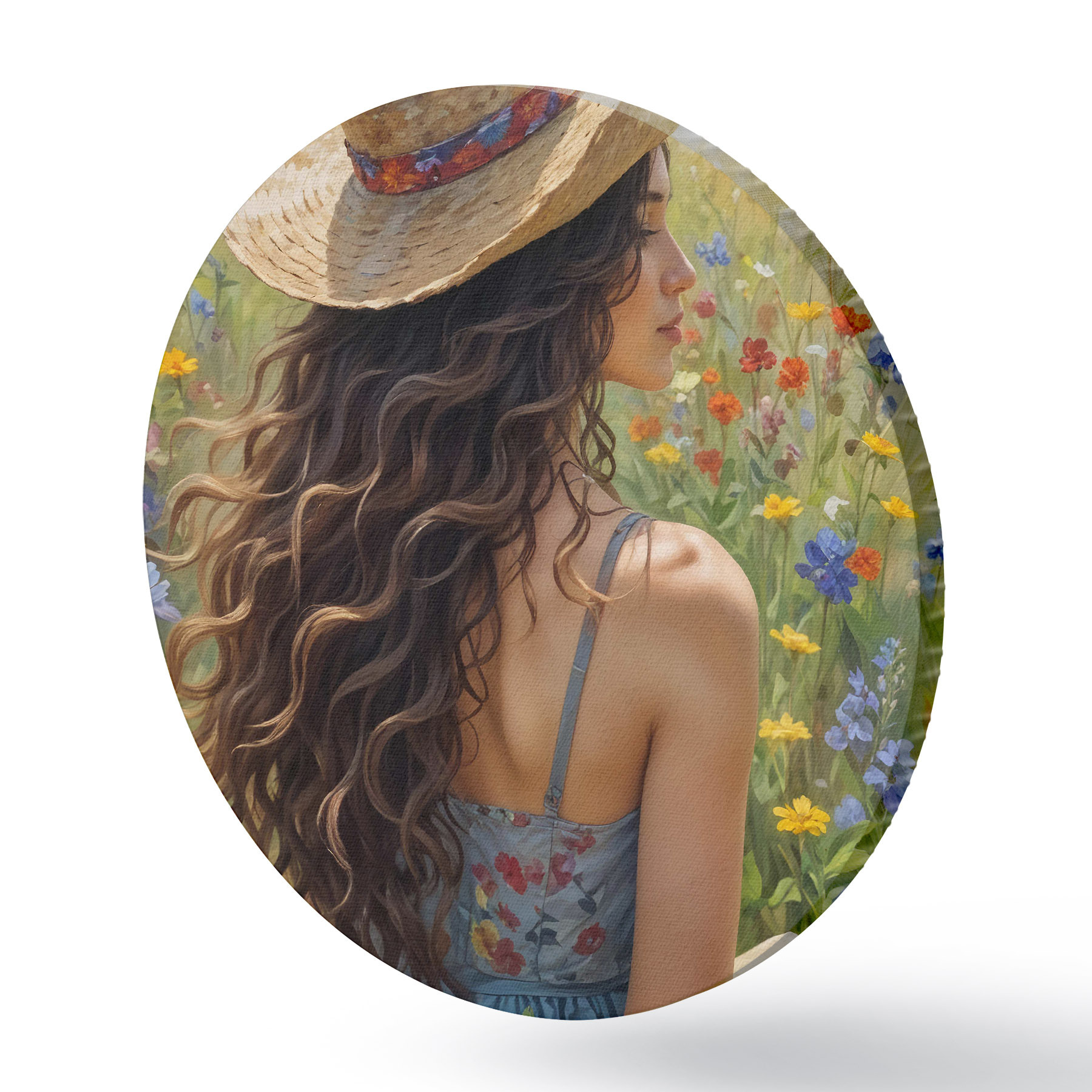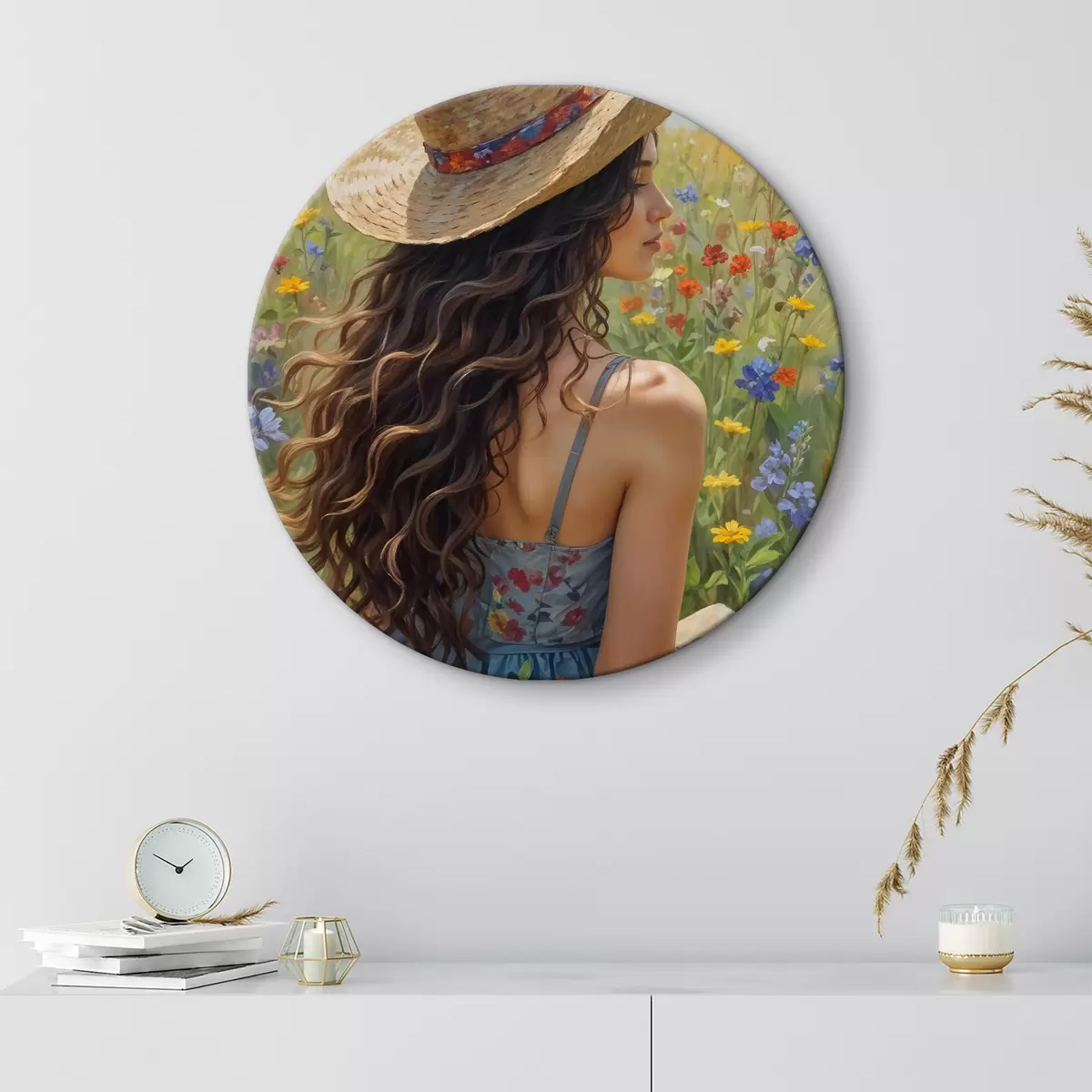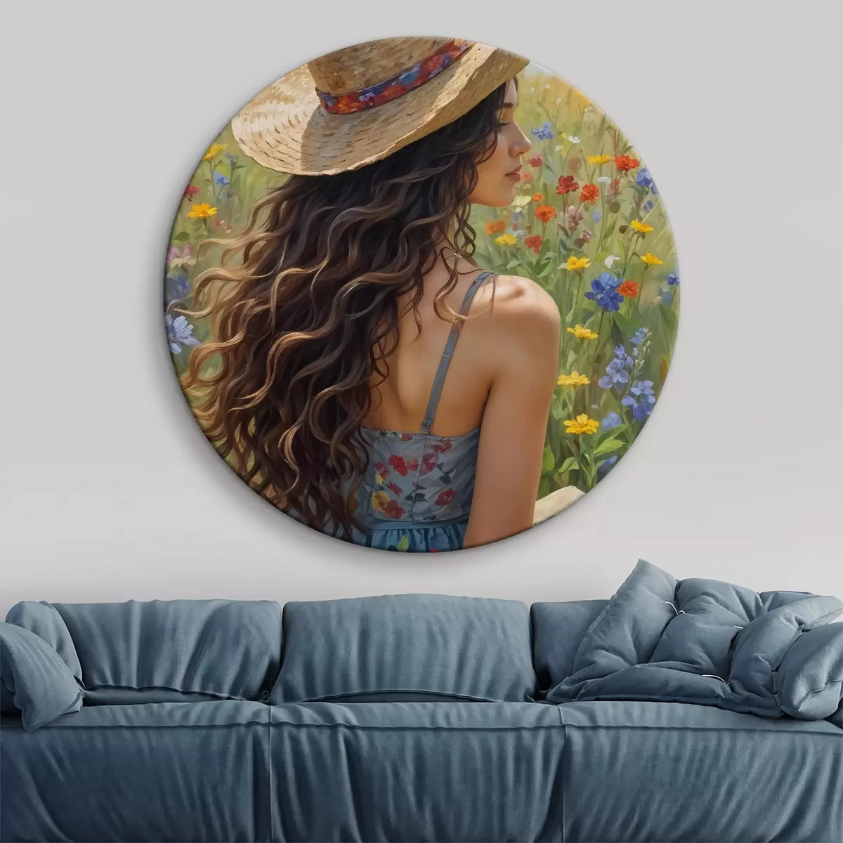 Cuadros redondos Mujer joven con el pelo rizado, llevando un sombrero de paja y un vestido floral, de pie en un campo de flores silvestres r40560