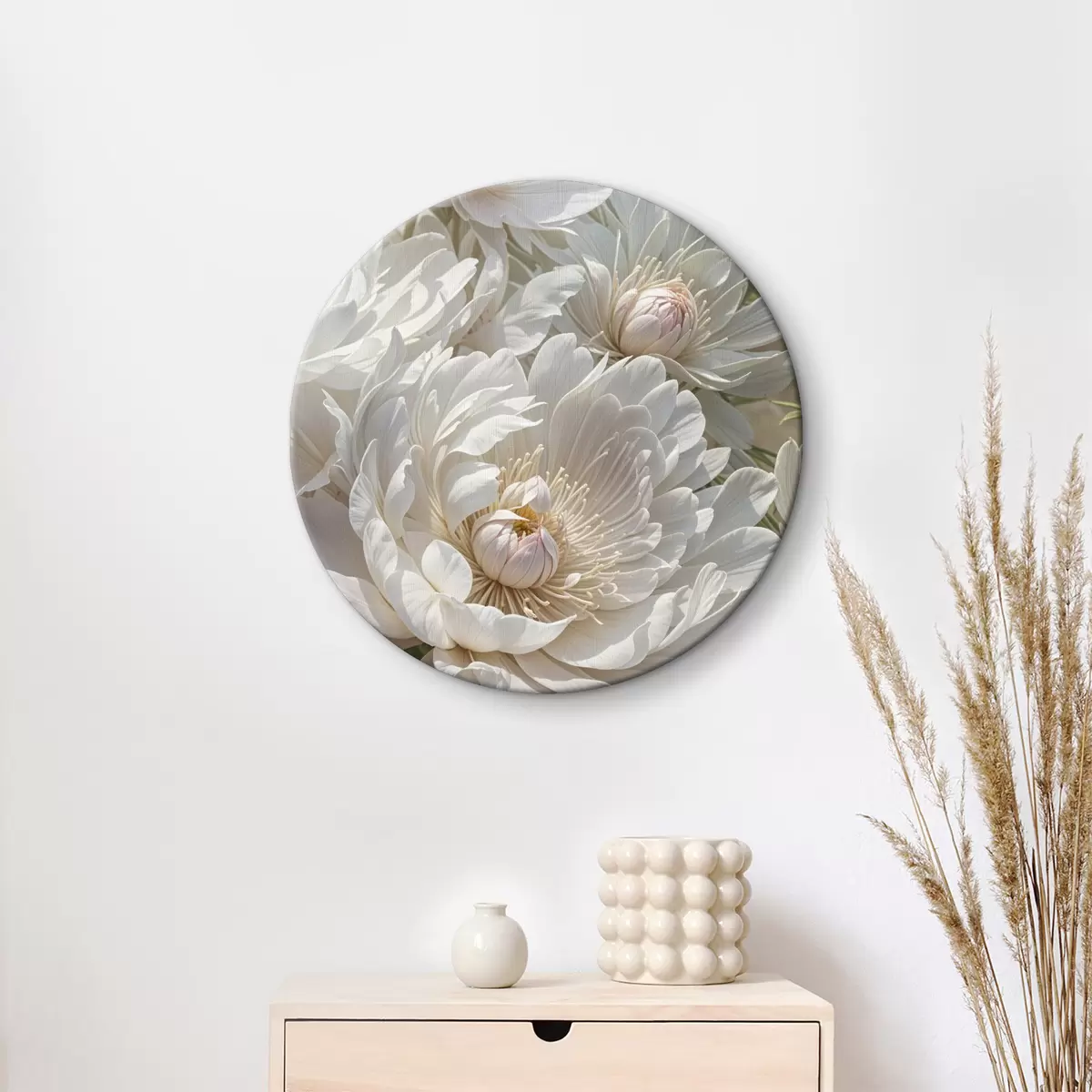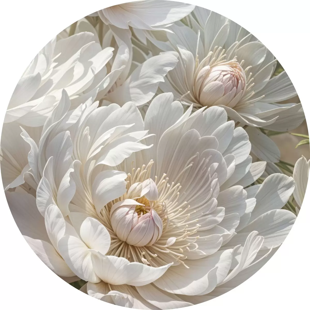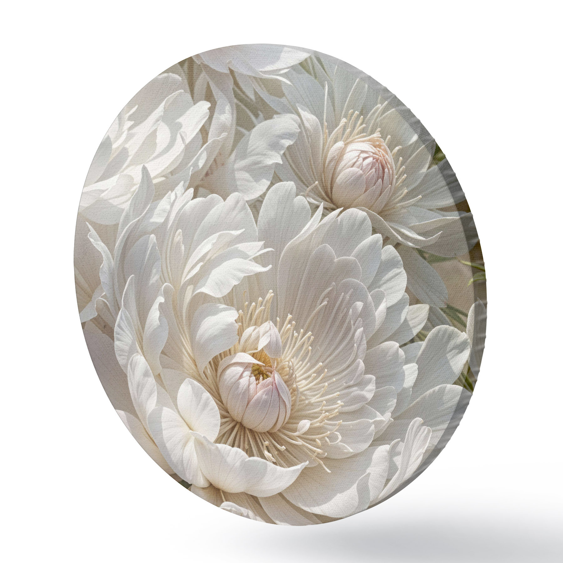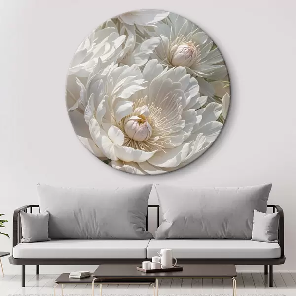 Cuadros redondos Primer plano de varias flores grandes de peonía blanca con pétalos suaves y delicados y centros amarillos brillantes r40575