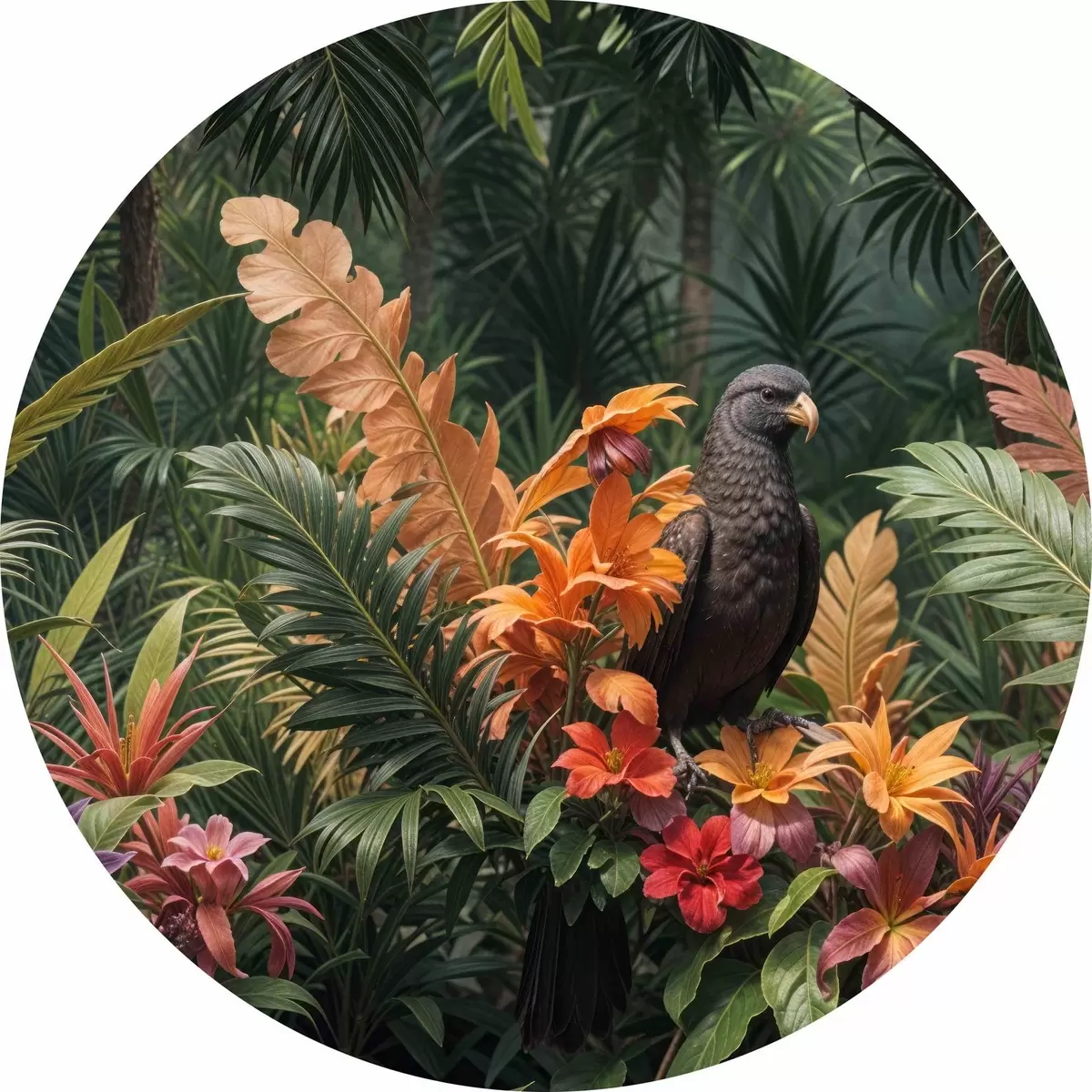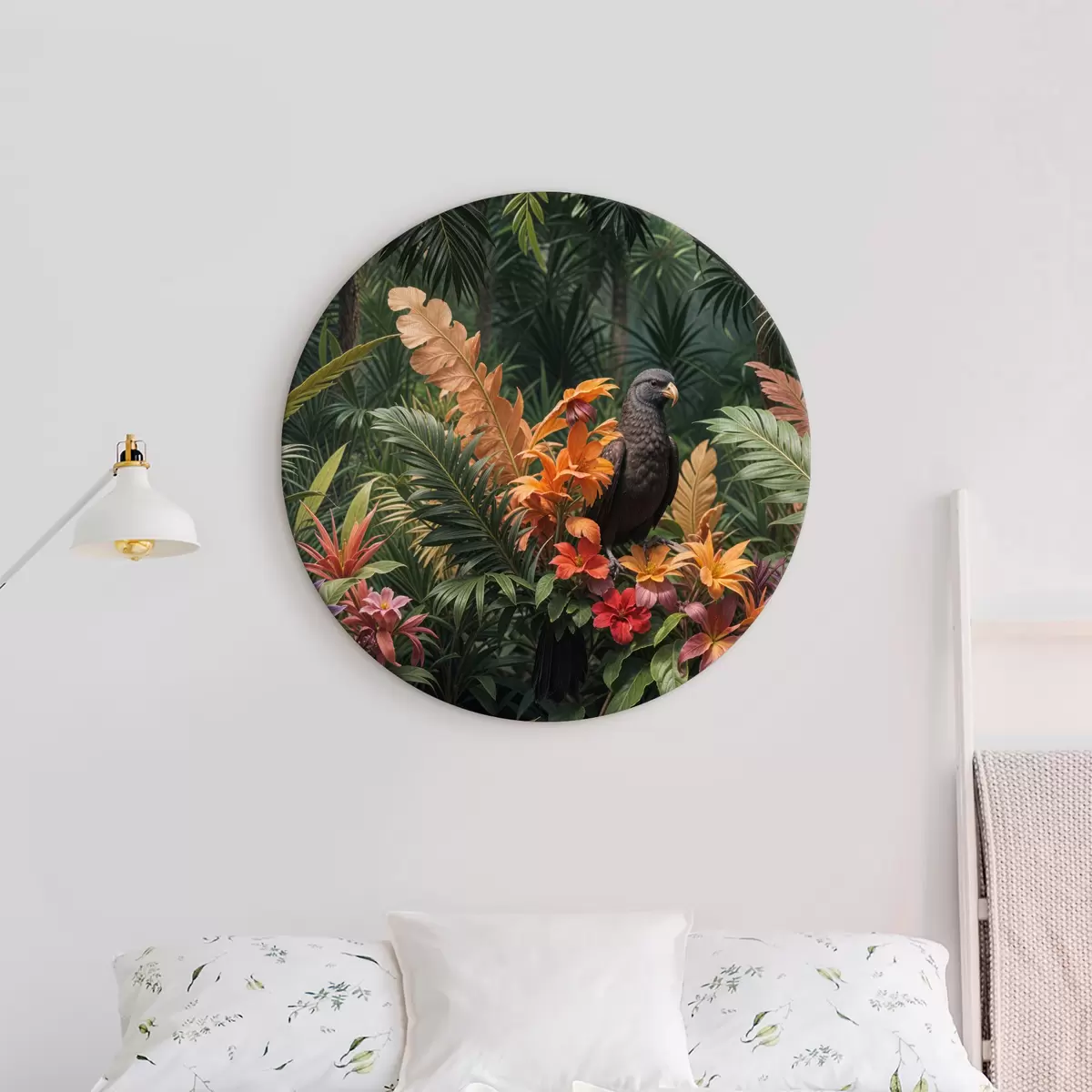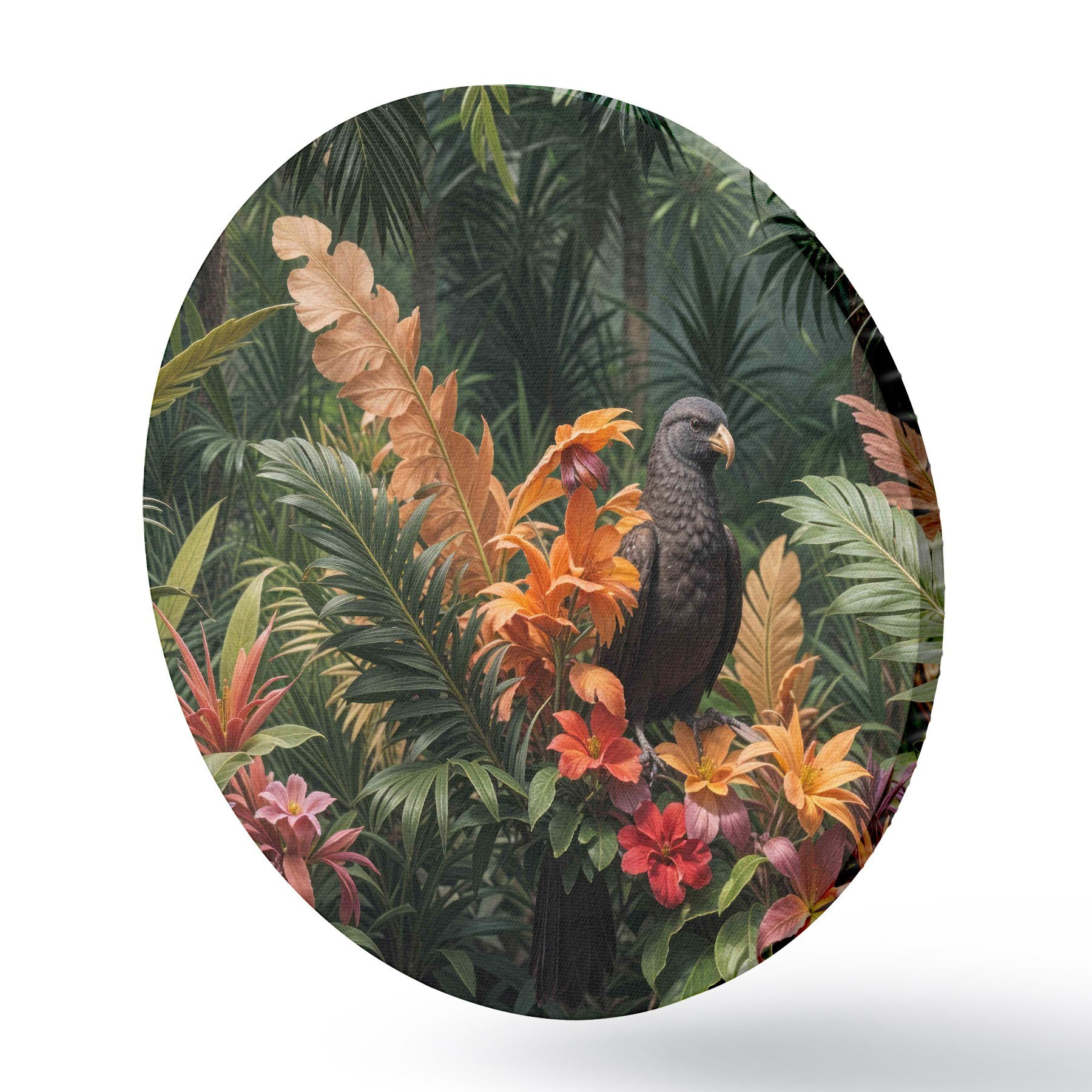 Cuadros redondos Pájaro tropical sentado en una rama rodeado de exuberante vegetación, hojas de palmera, flores y plantas exóticas r40578