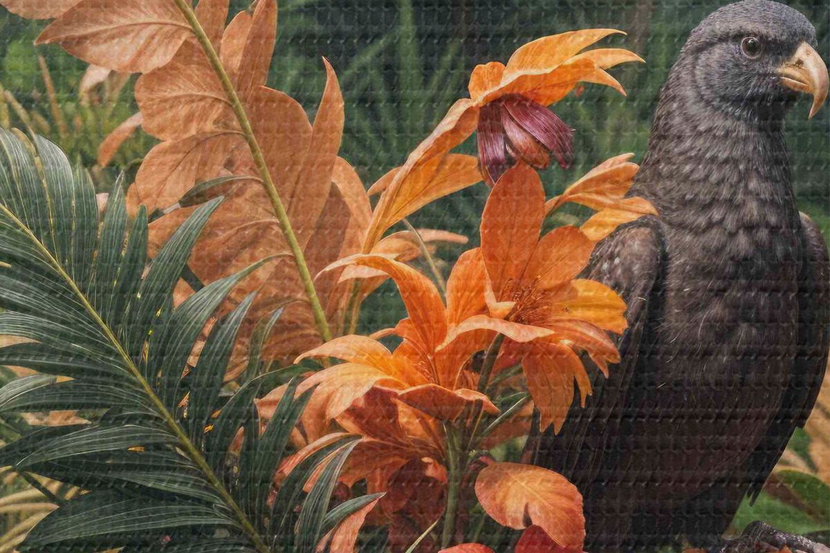 Foto Pájaro tropical sentado en una rama rodeado de exuberante vegetación, hojas de palmera, flores y plantas exóticas Nr r40578