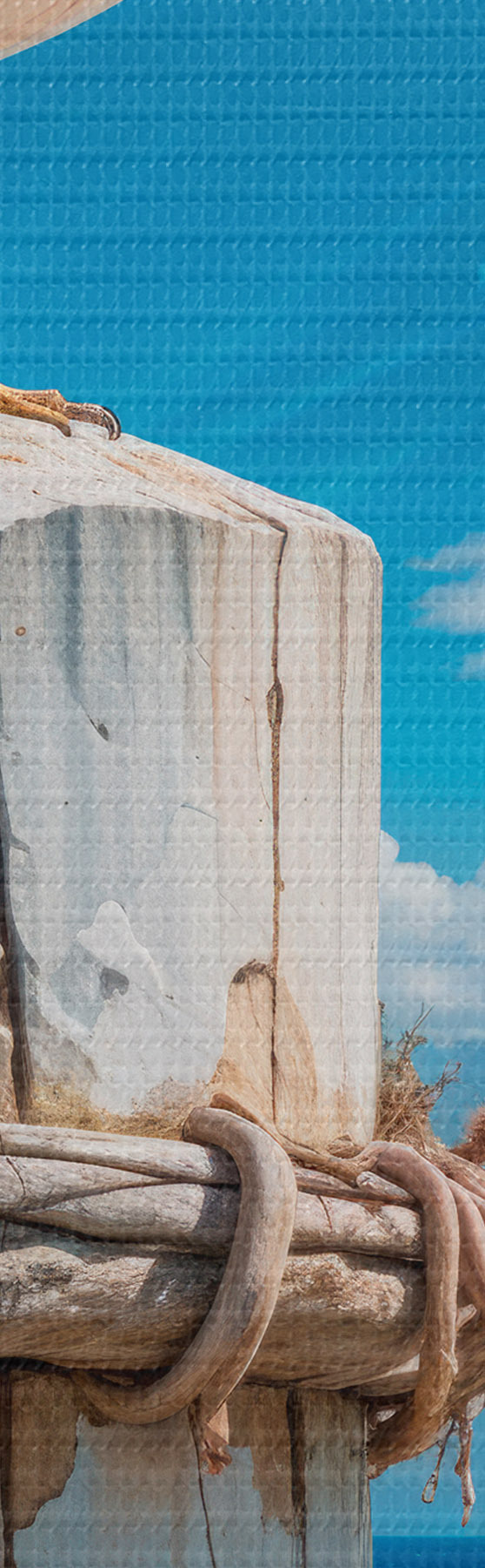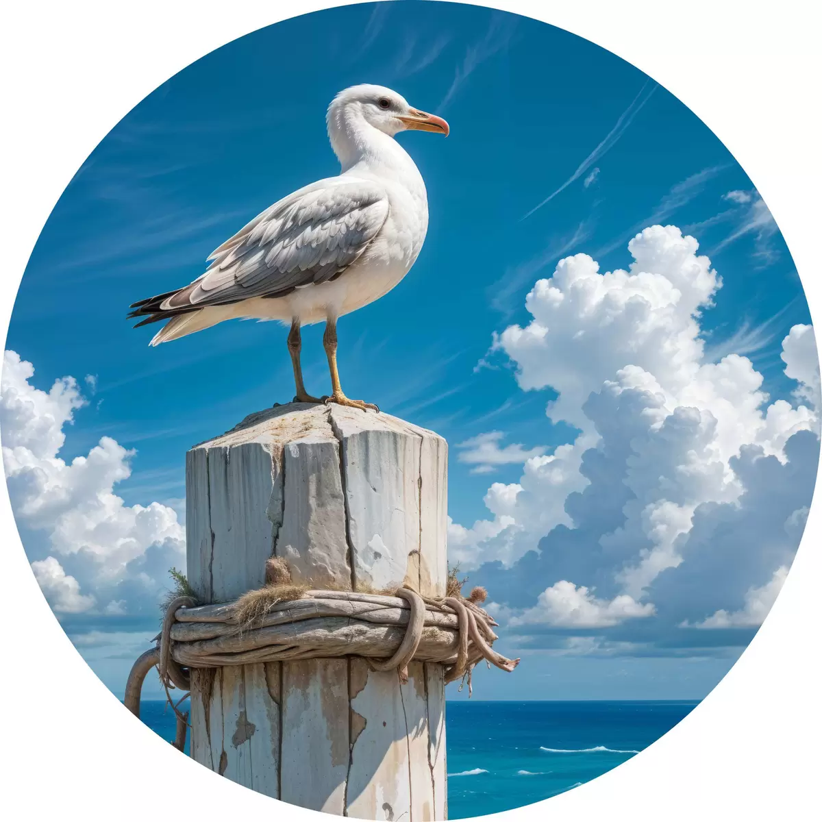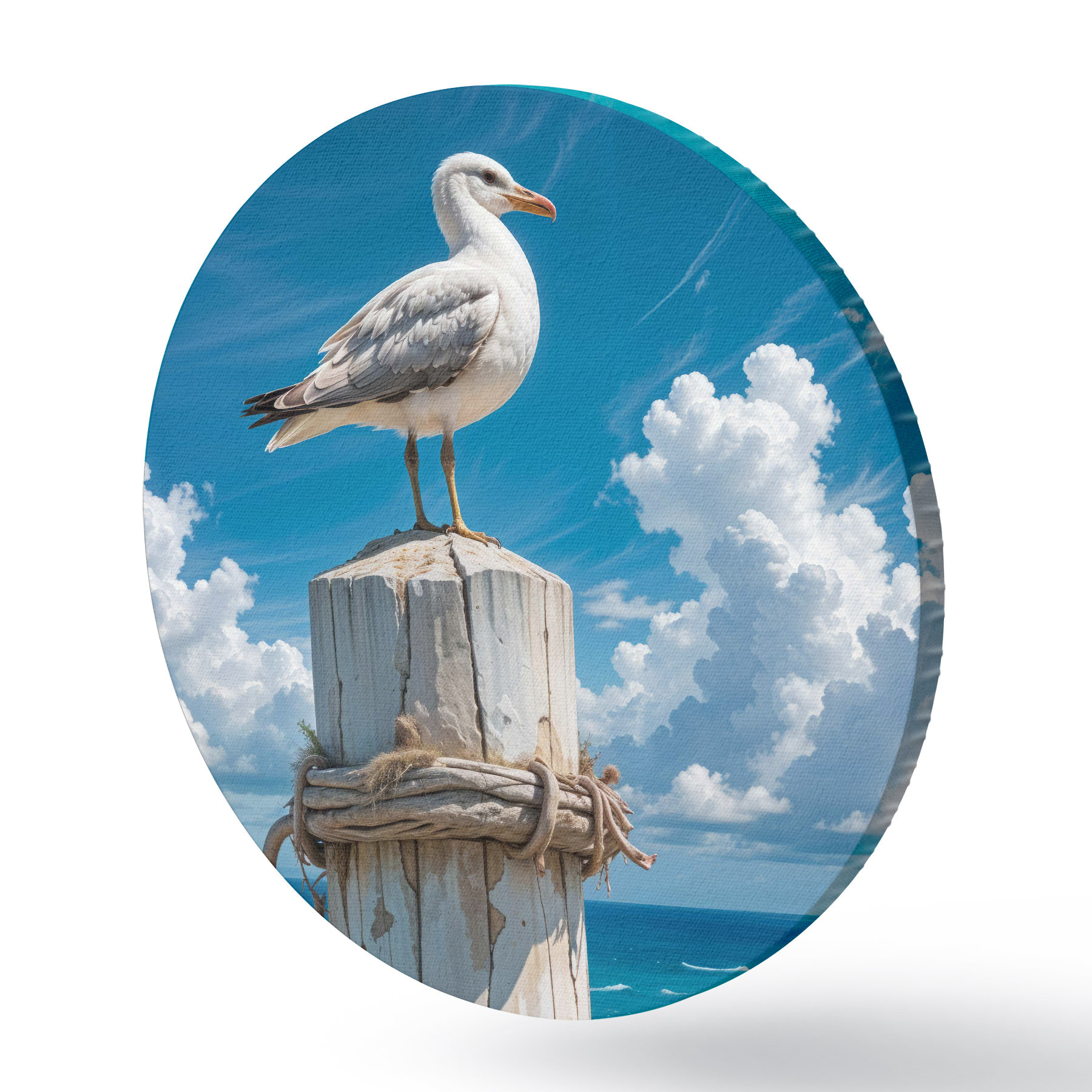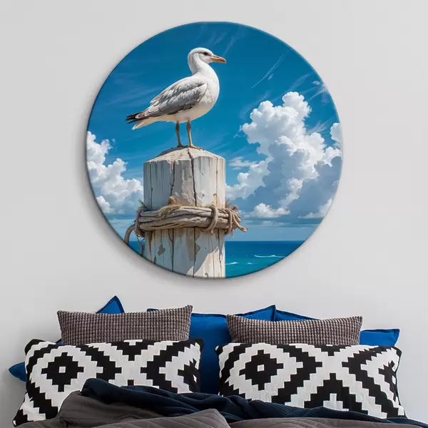 Cuadros redondos Una gaviota blanca sentada en un poste de madera sobre un fondo de cielo azul claro y océano con olas r40590