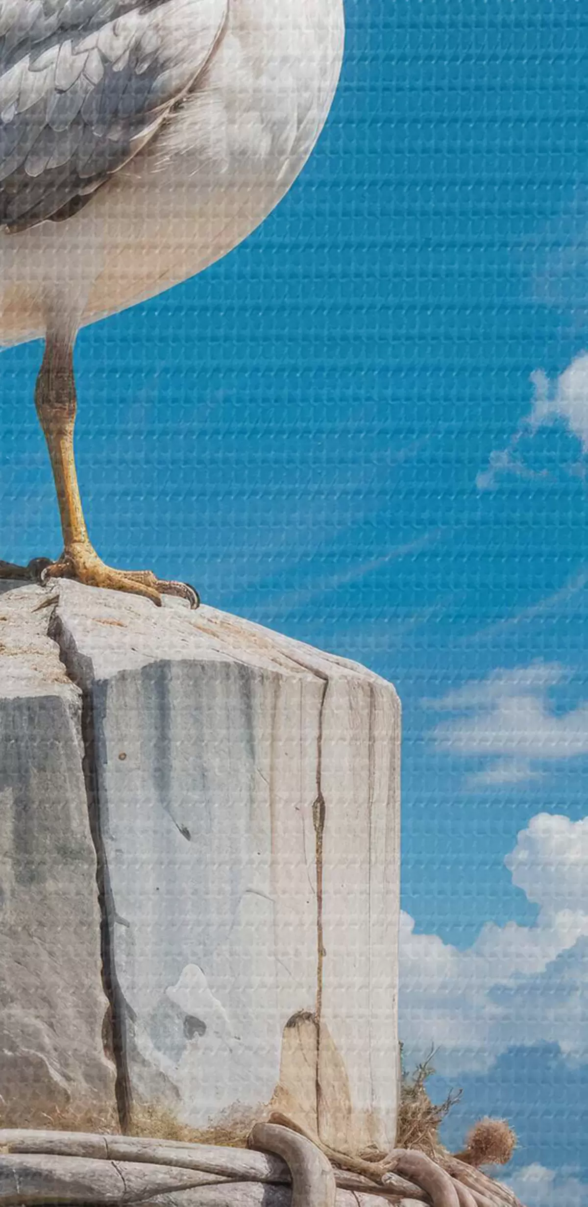 Foto Una gaviota blanca sentada en un poste de madera sobre un fondo de cielo azul claro y océano con olas Nr r40590