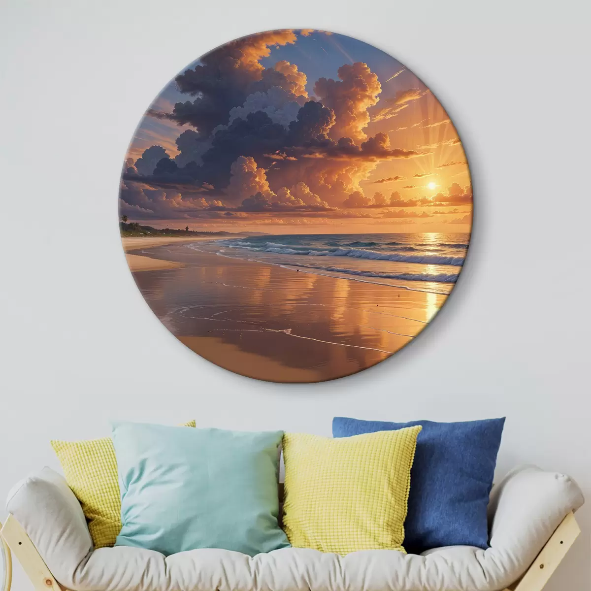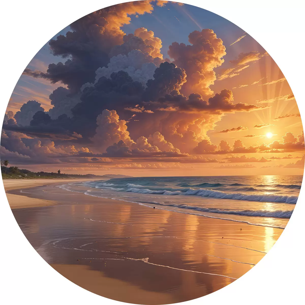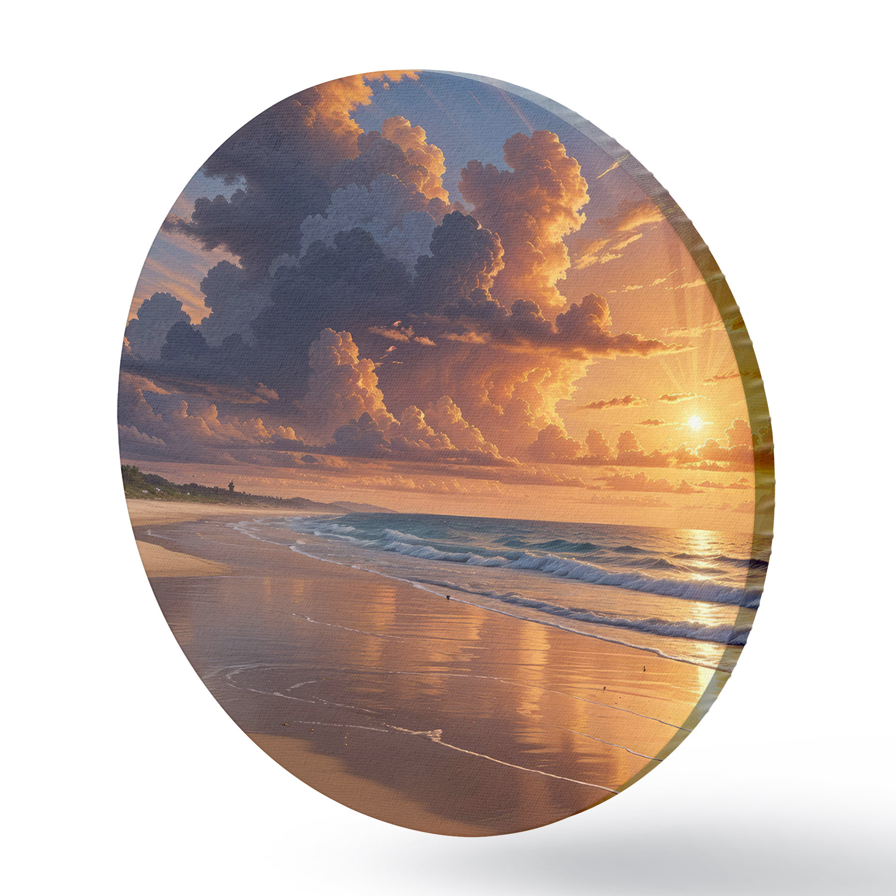 Cuadros redondos Dramática puesta de sol sobre una playa tropical, con vibrantes nubes naranjas y rosas reflejándose en las tranquilas aguas r40599