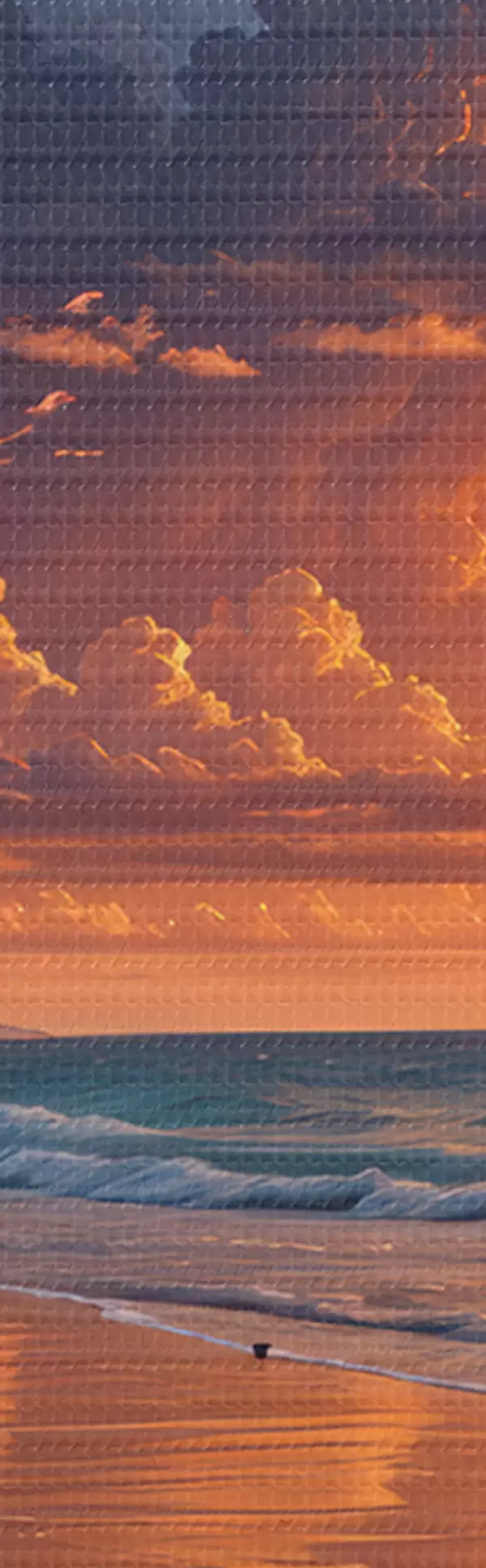 Foto Dramática puesta de sol sobre una playa tropical, con vibrantes nubes naranjas y rosas reflejándose en las tranquilas aguas Nr r40599