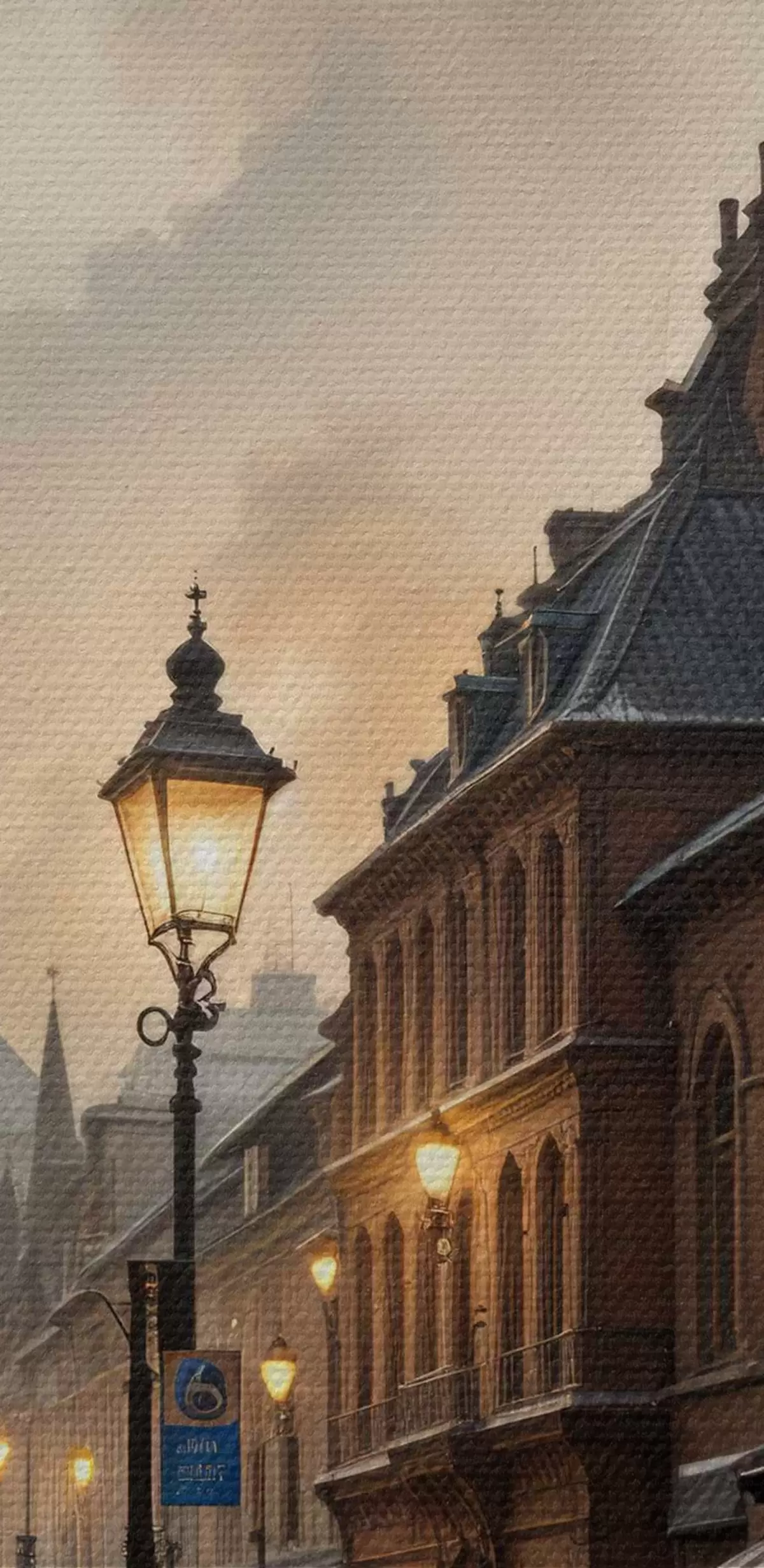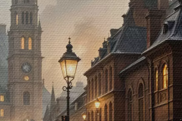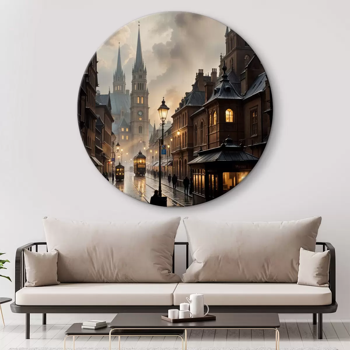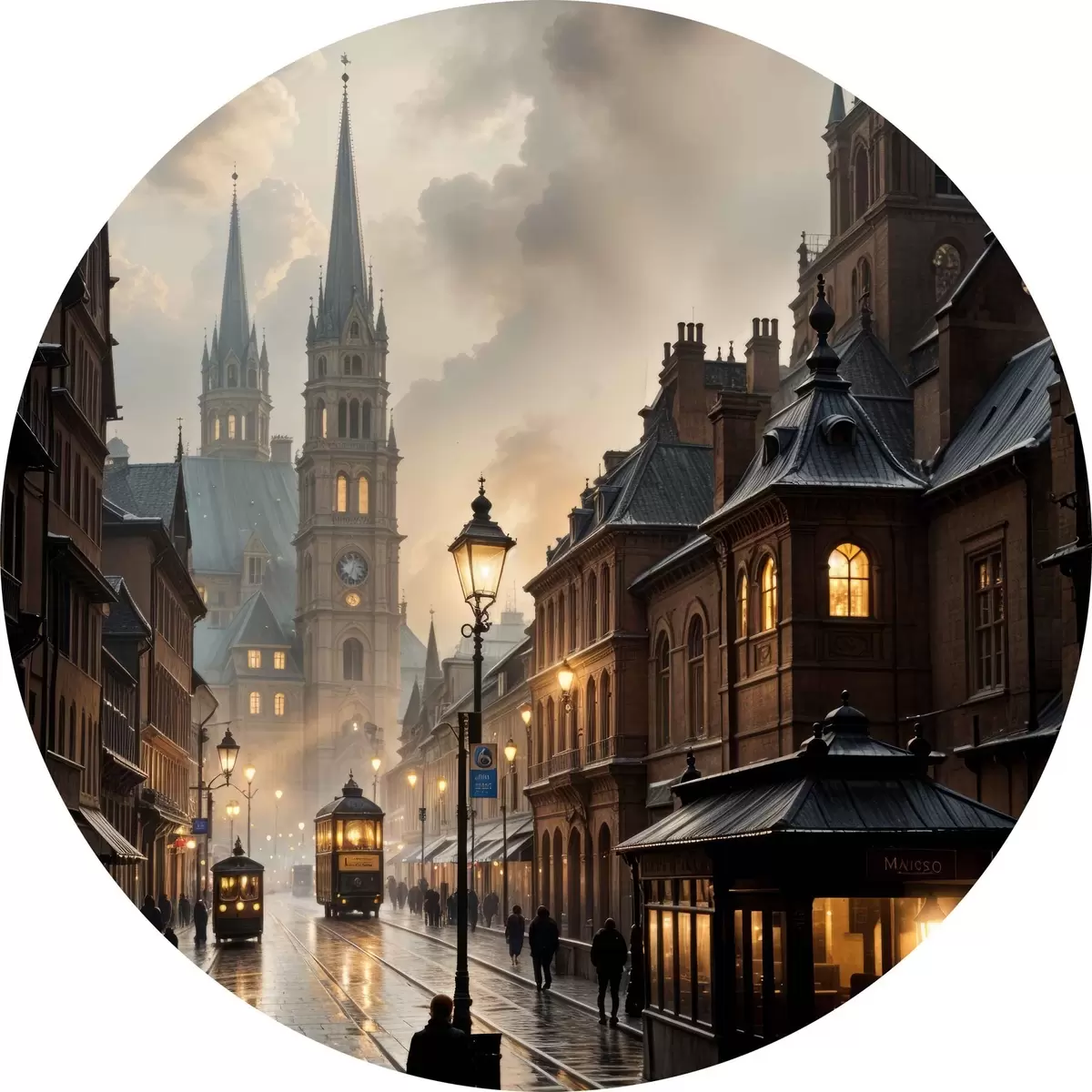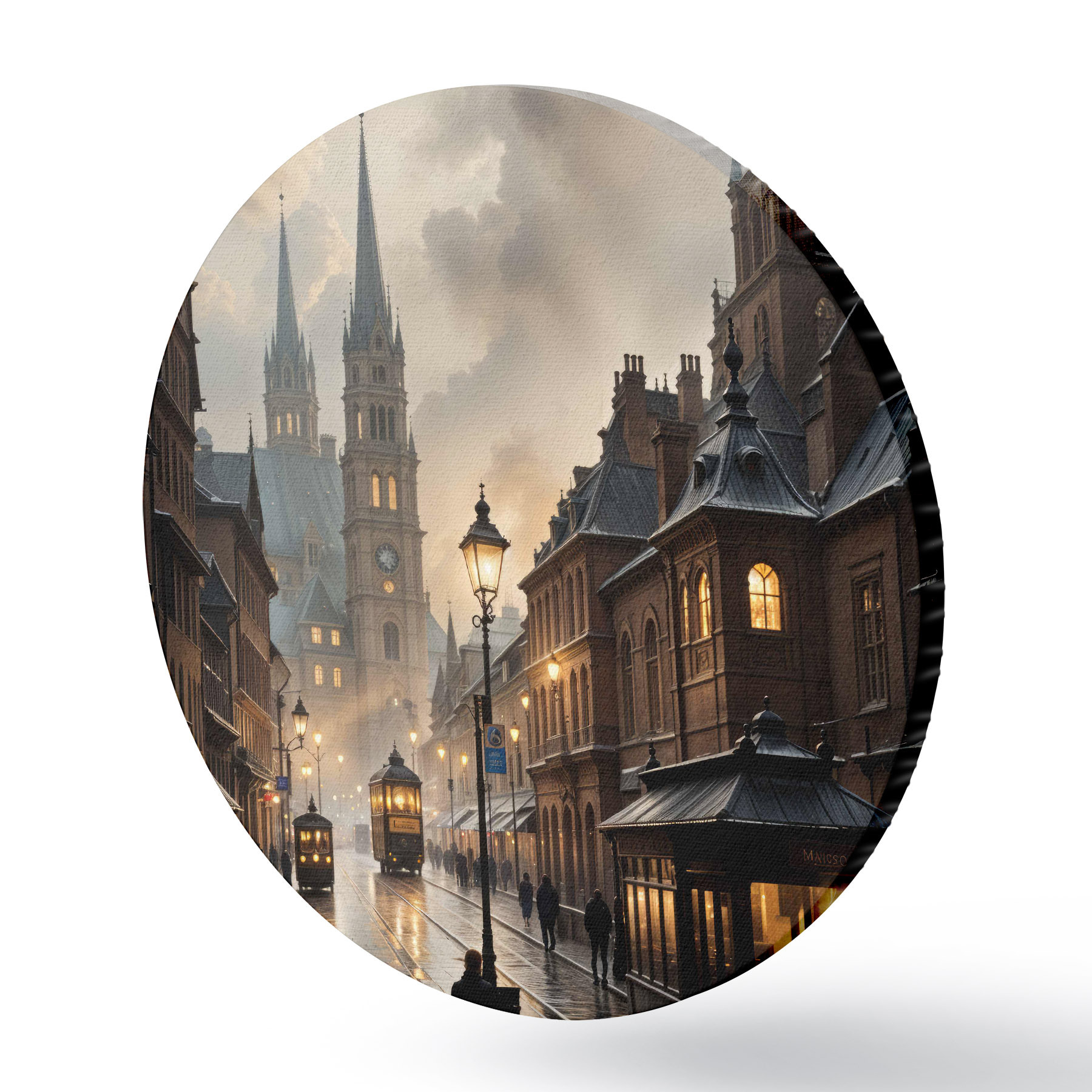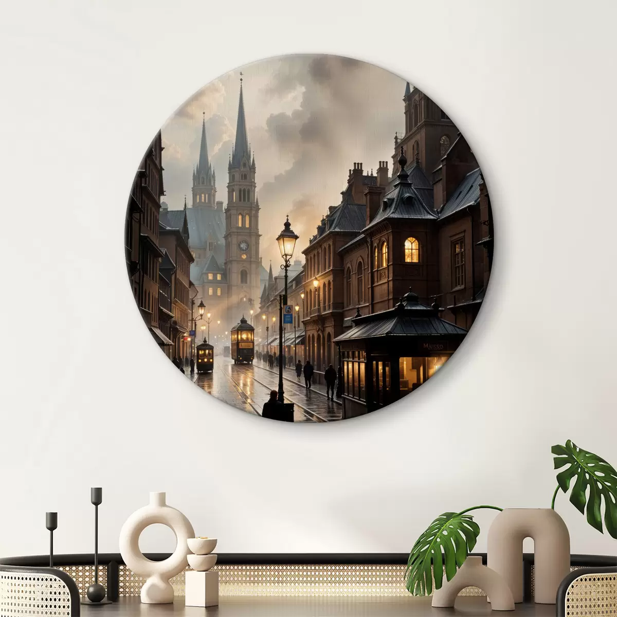 Cuadros redondos Tarde lluviosa en una vieja ciudad europea, con calles empedradas, edificios históricos y un tranvía que pasa r40604