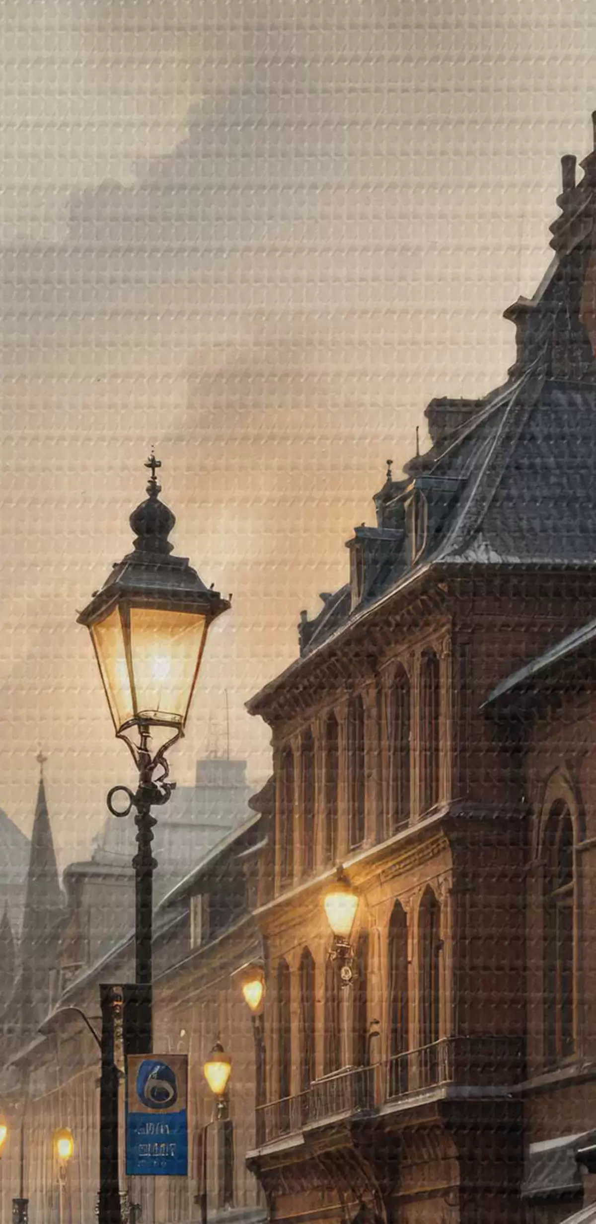 Foto Tarde lluviosa en una vieja ciudad europea, con calles empedradas, edificios históricos y un tranvía que pasa Nr r40604