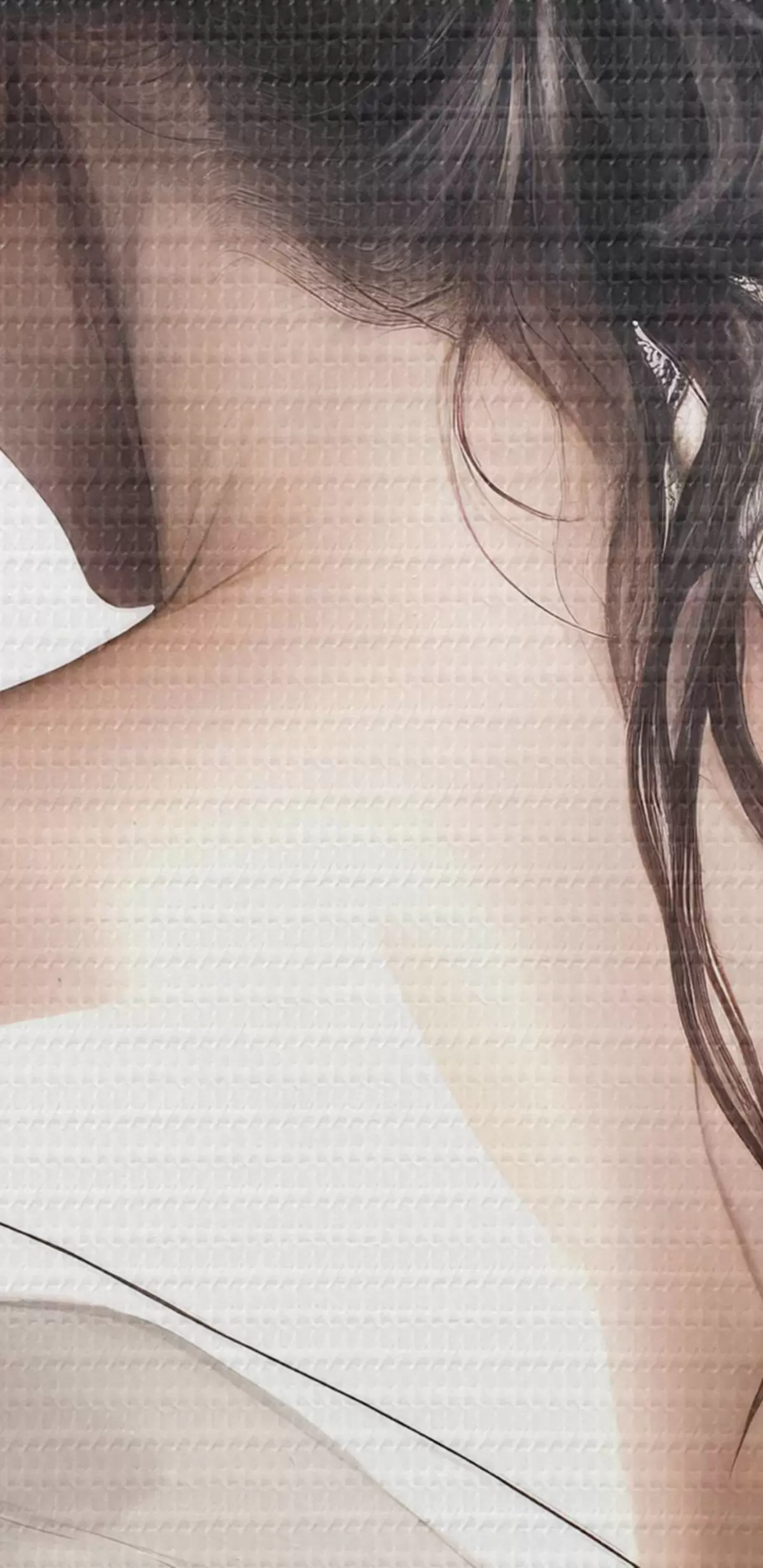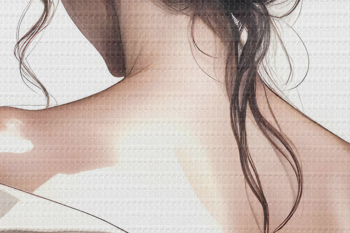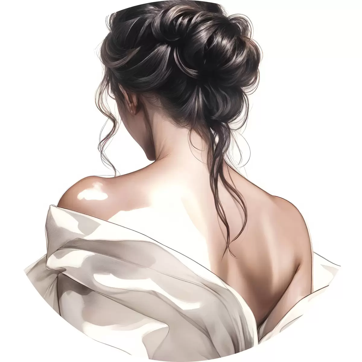 Foto Un cuadro minimalista que representa a una mujer con el pelo largo, oscuro y ondulado, peinado en un elegante recogido y vestida con un albornoz blanco Nr r40605