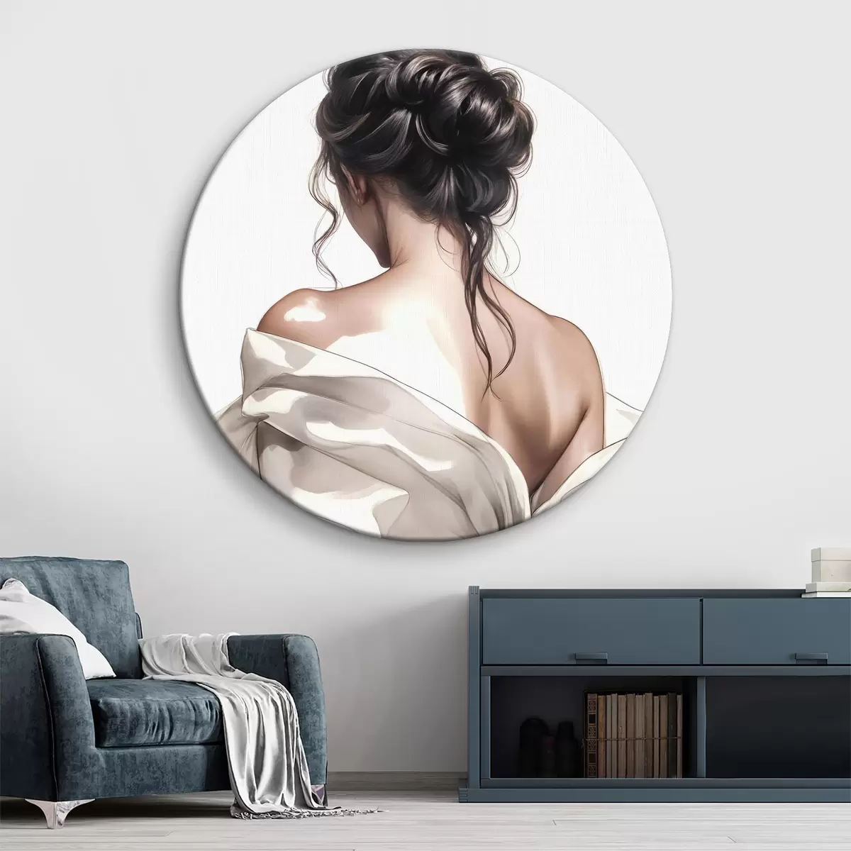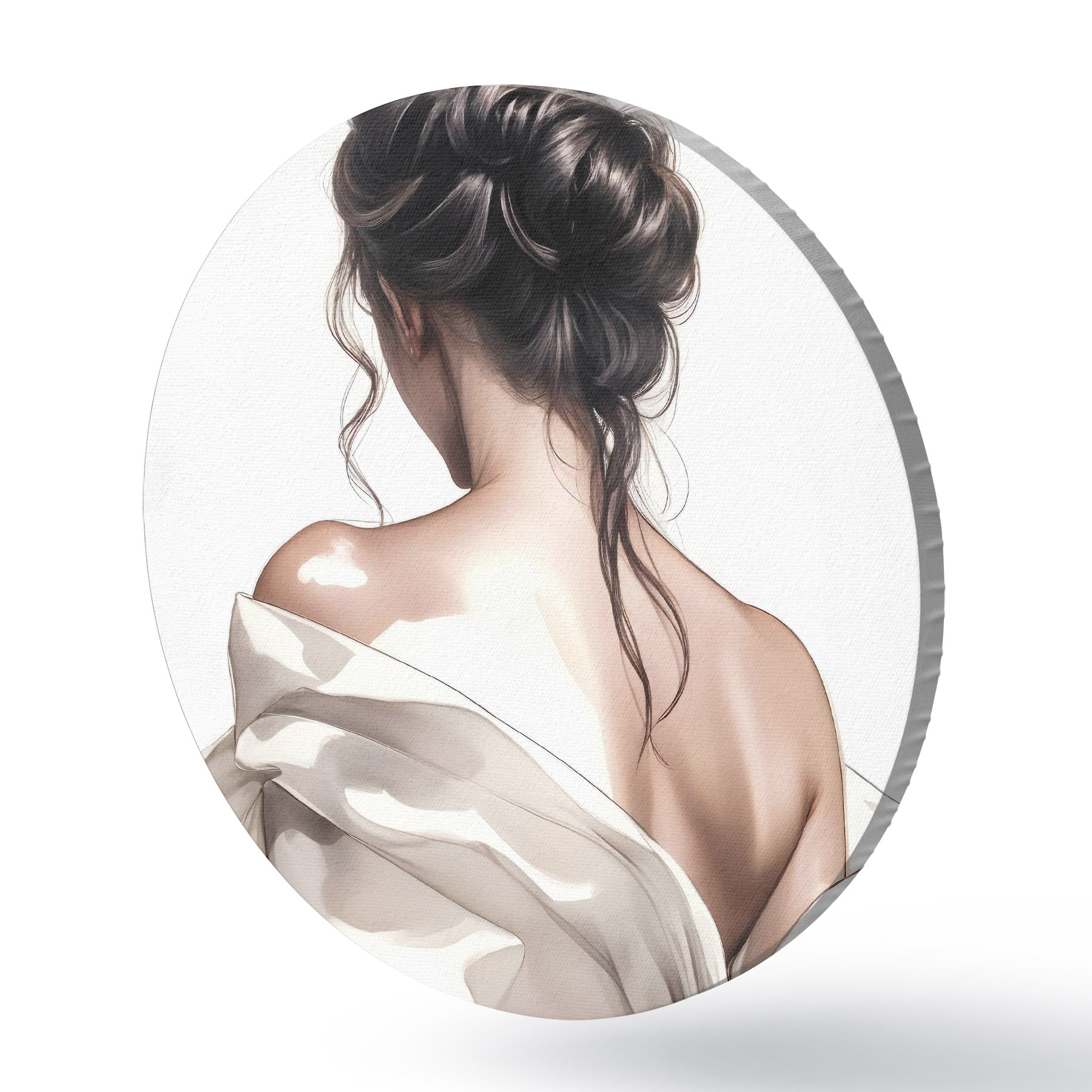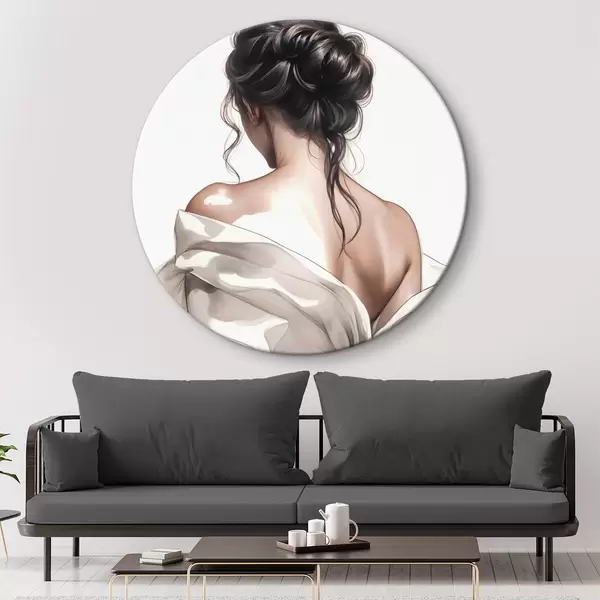Cuadros redondos Un cuadro minimalista que representa a una mujer con el pelo largo, oscuro y ondulado, peinado en un elegante recogido y vestida con un albornoz blanco r40605