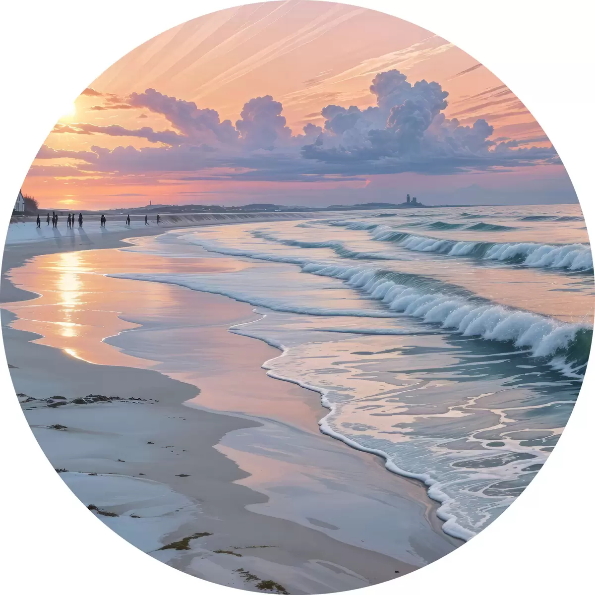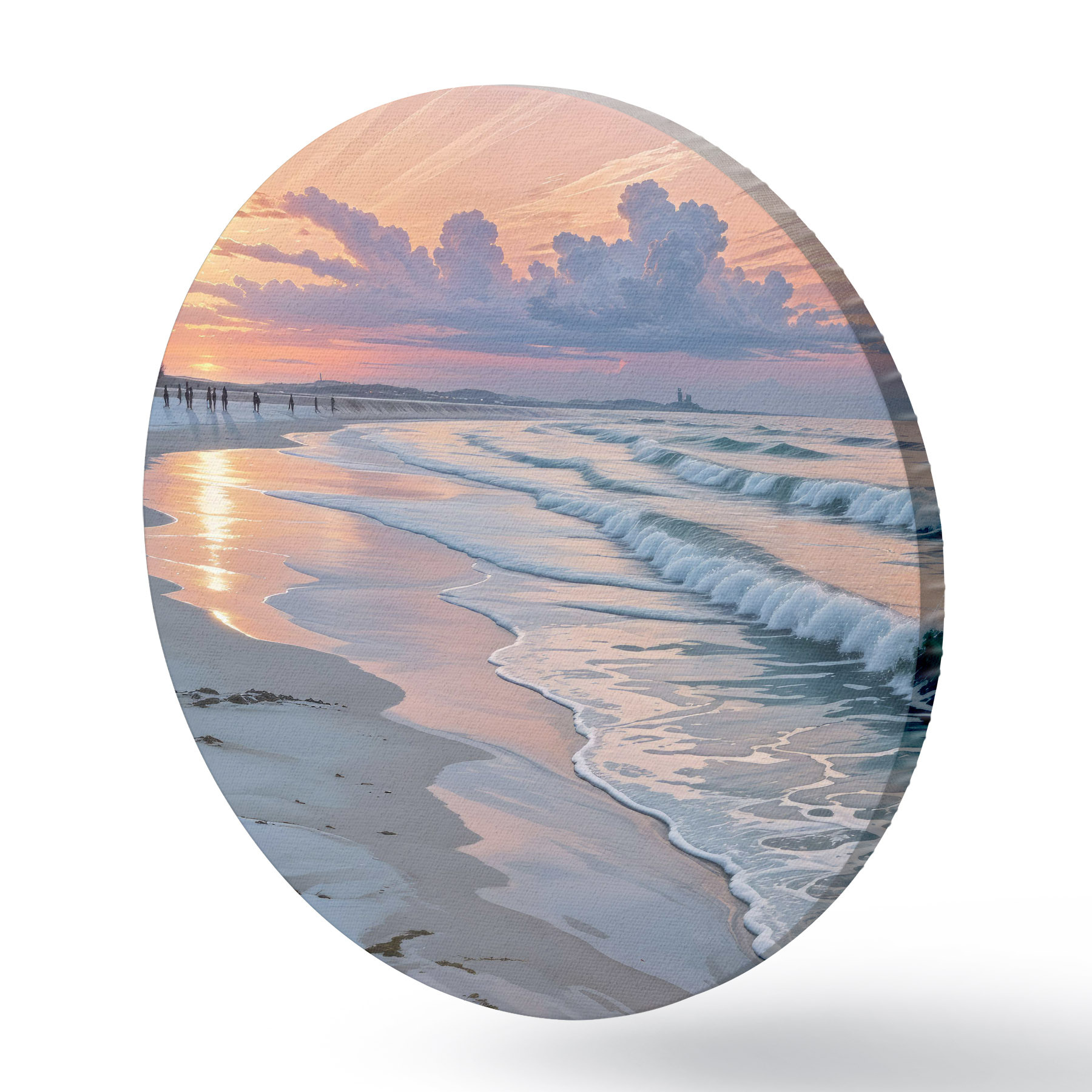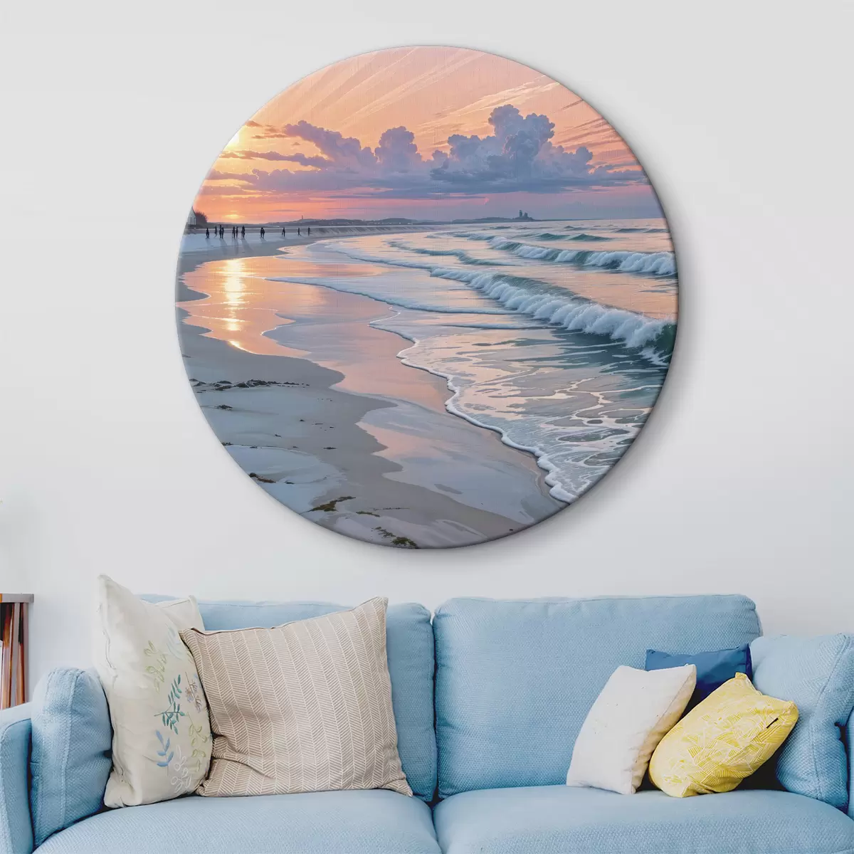 Cuadros redondos Tranquila escena en la playa al atardecer, con suaves olas rompiendo en la orilla arenosa r40606