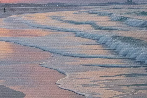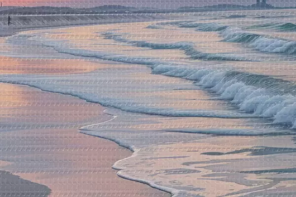 Foto Tranquila escena en la playa al atardecer, con suaves olas rompiendo en la orilla arenosa Nr r40606