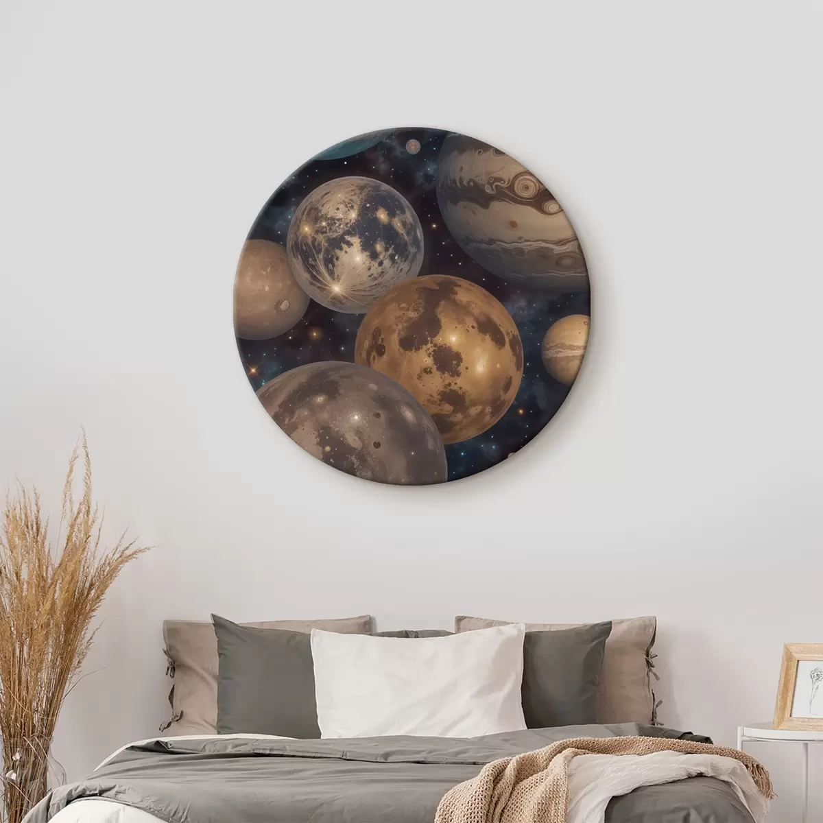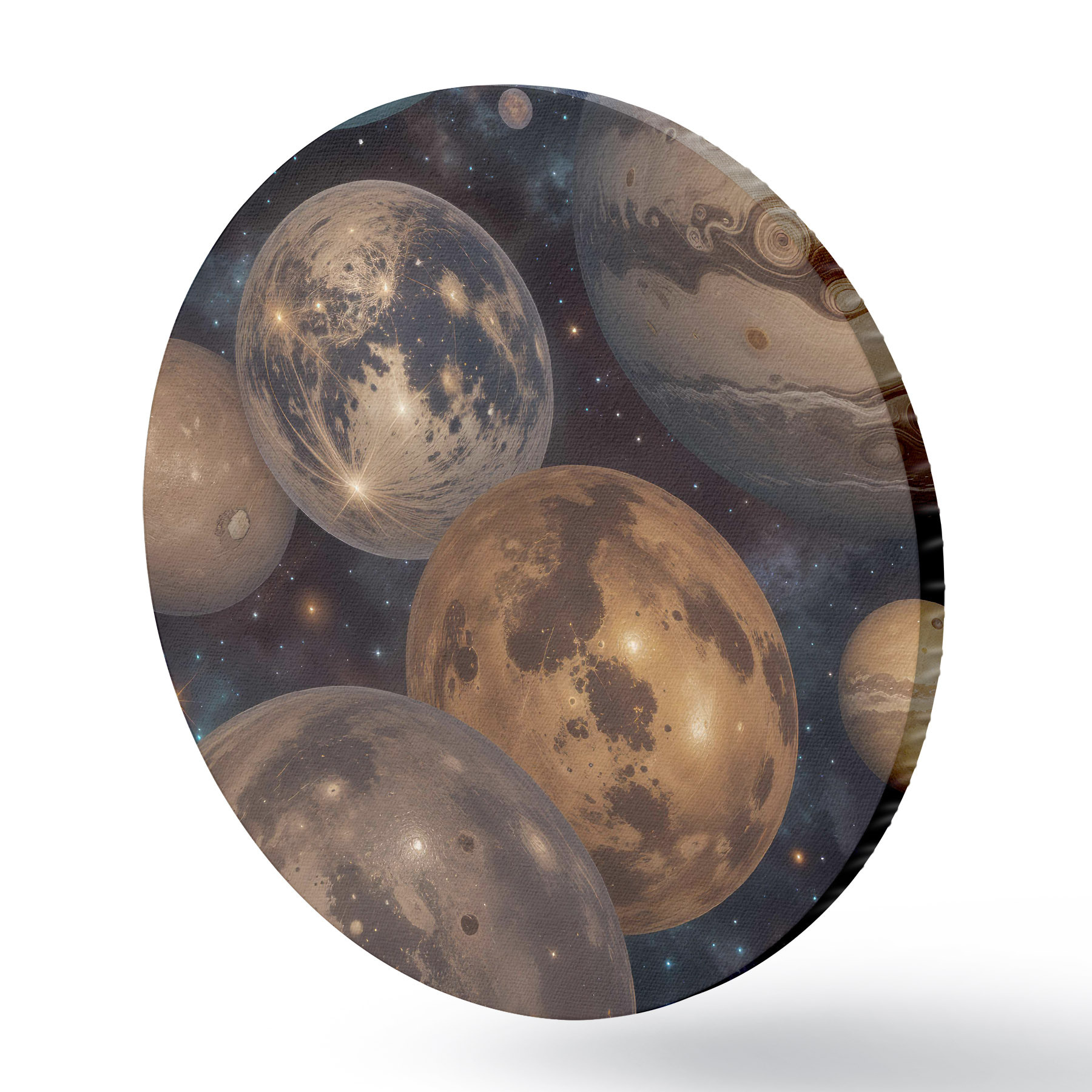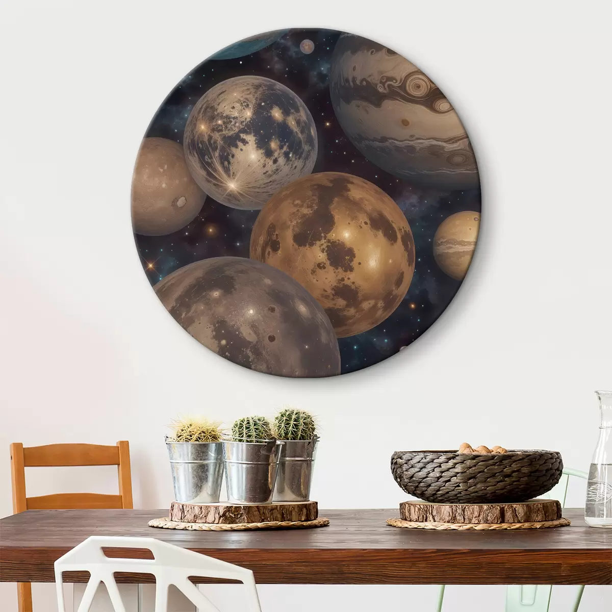 Cuadros redondos Estampado espacial abstracto con coloridos planetas y lunas flotando en el cielo nocturno estrellado r40607