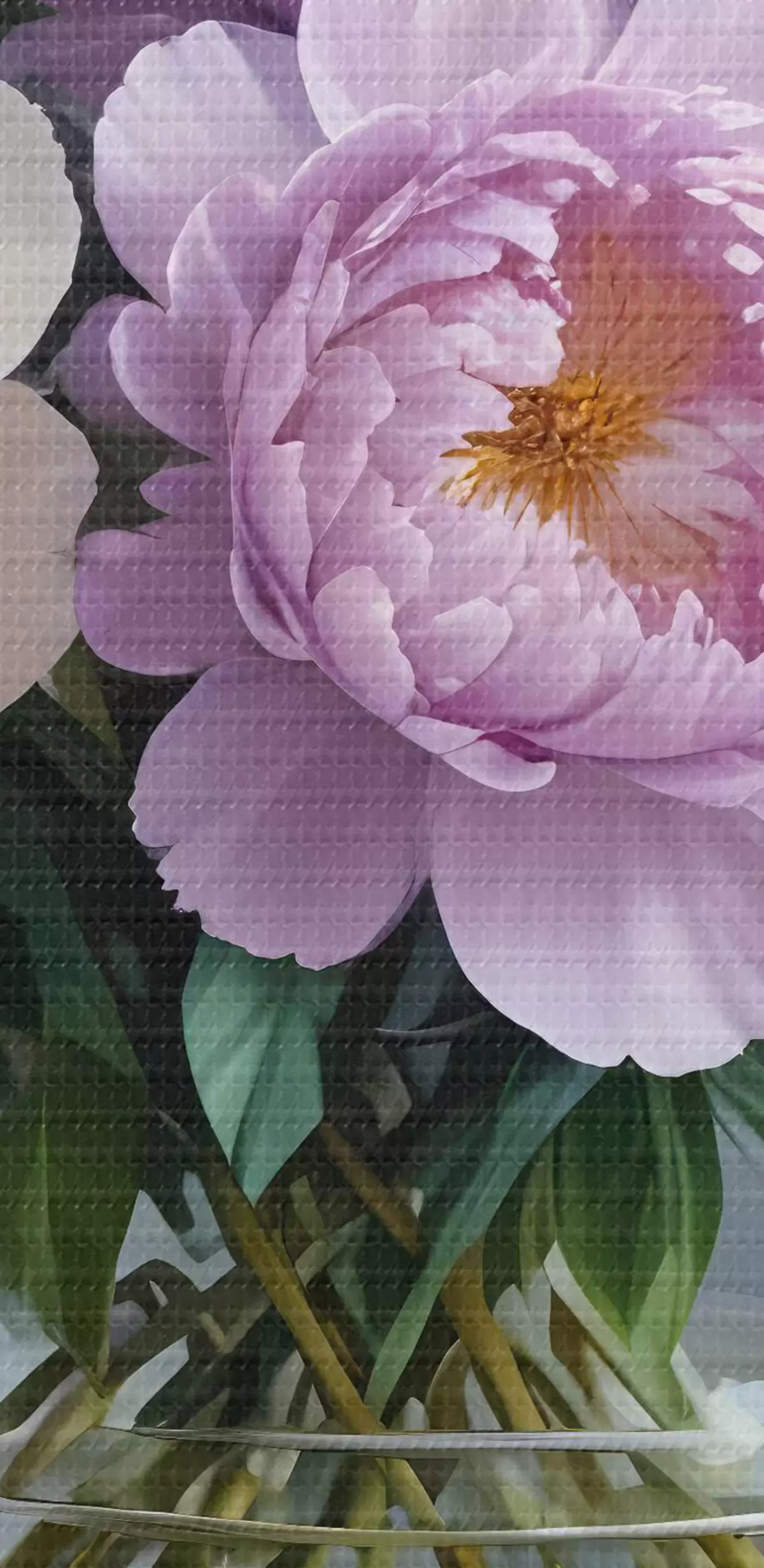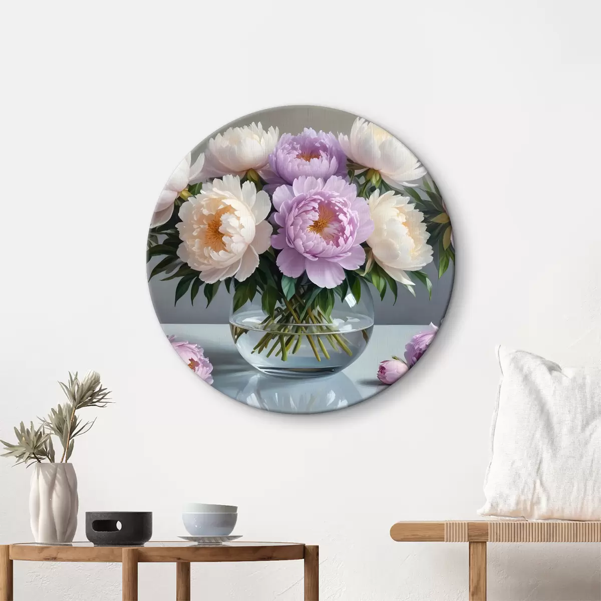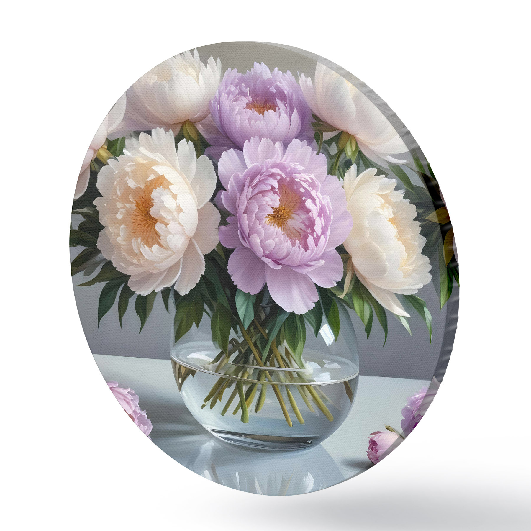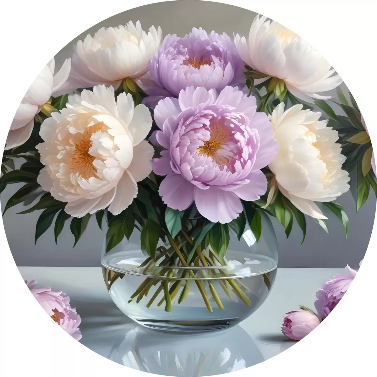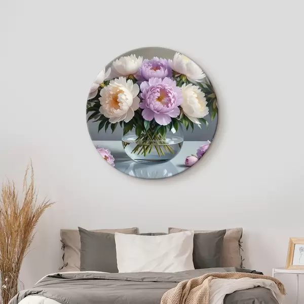 Cuadros redondos Un ramo de grandes y exuberantes peonías blancas y rosas en un jarrón de cristal sobre fondo gris r40610