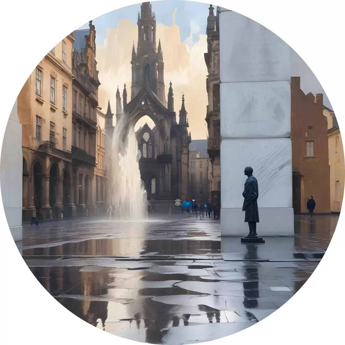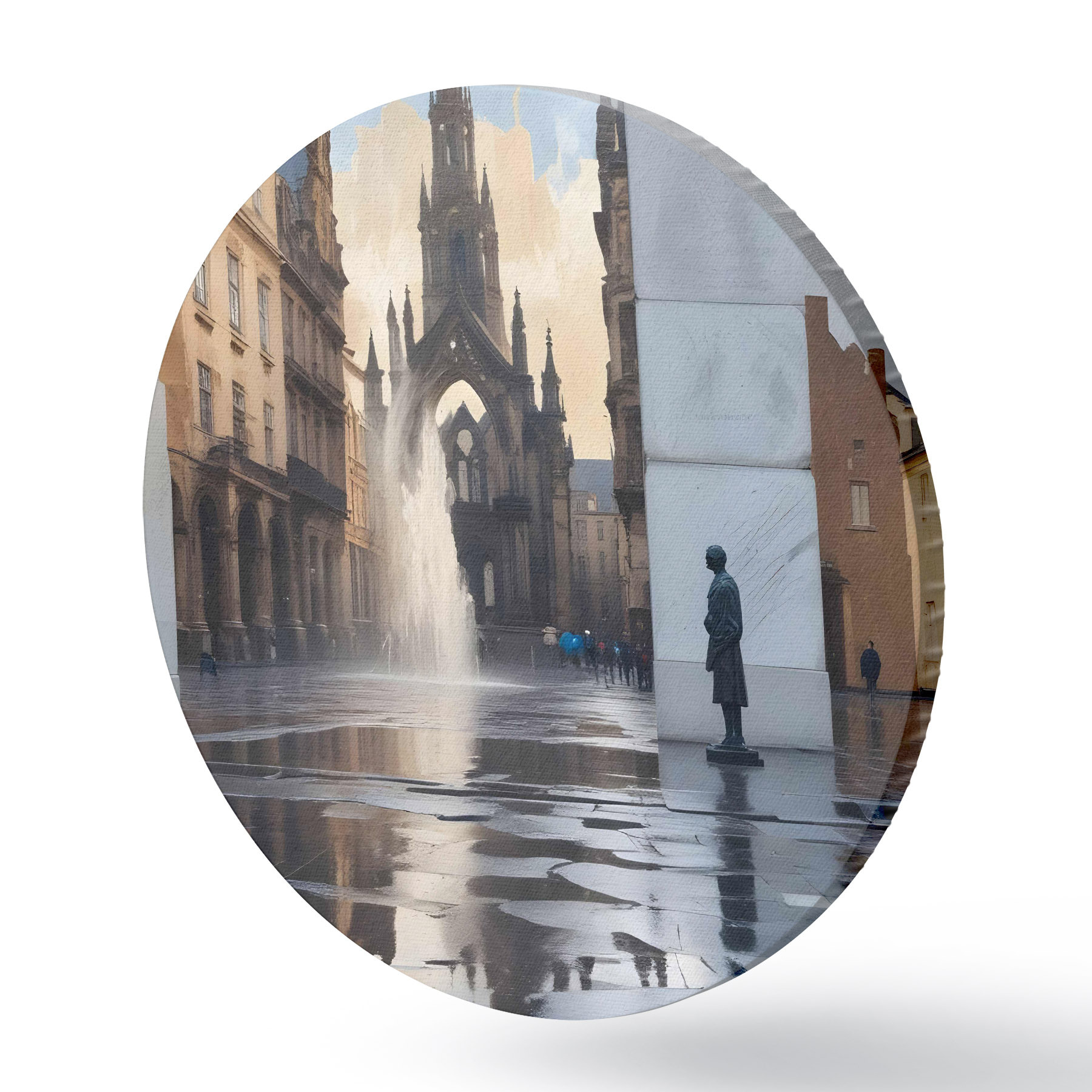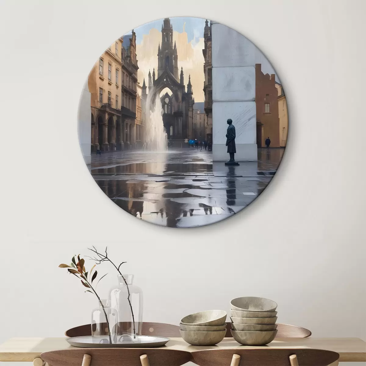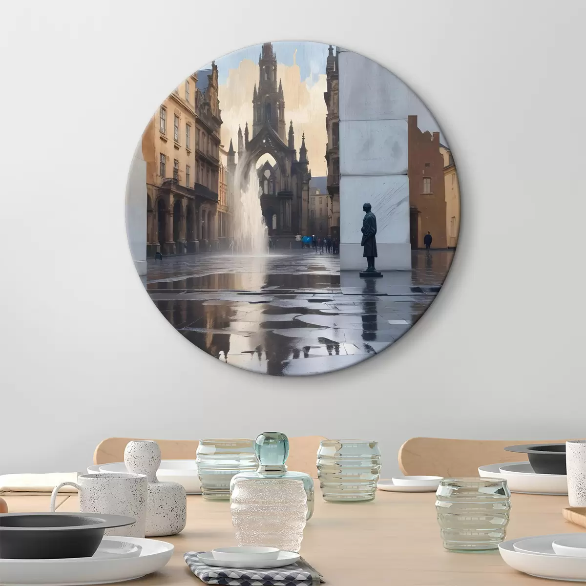 Cuadros redondos Una catedral medieval de arquitectura gótica se alza al fondo, con sus agujas hacia el cielo r40611