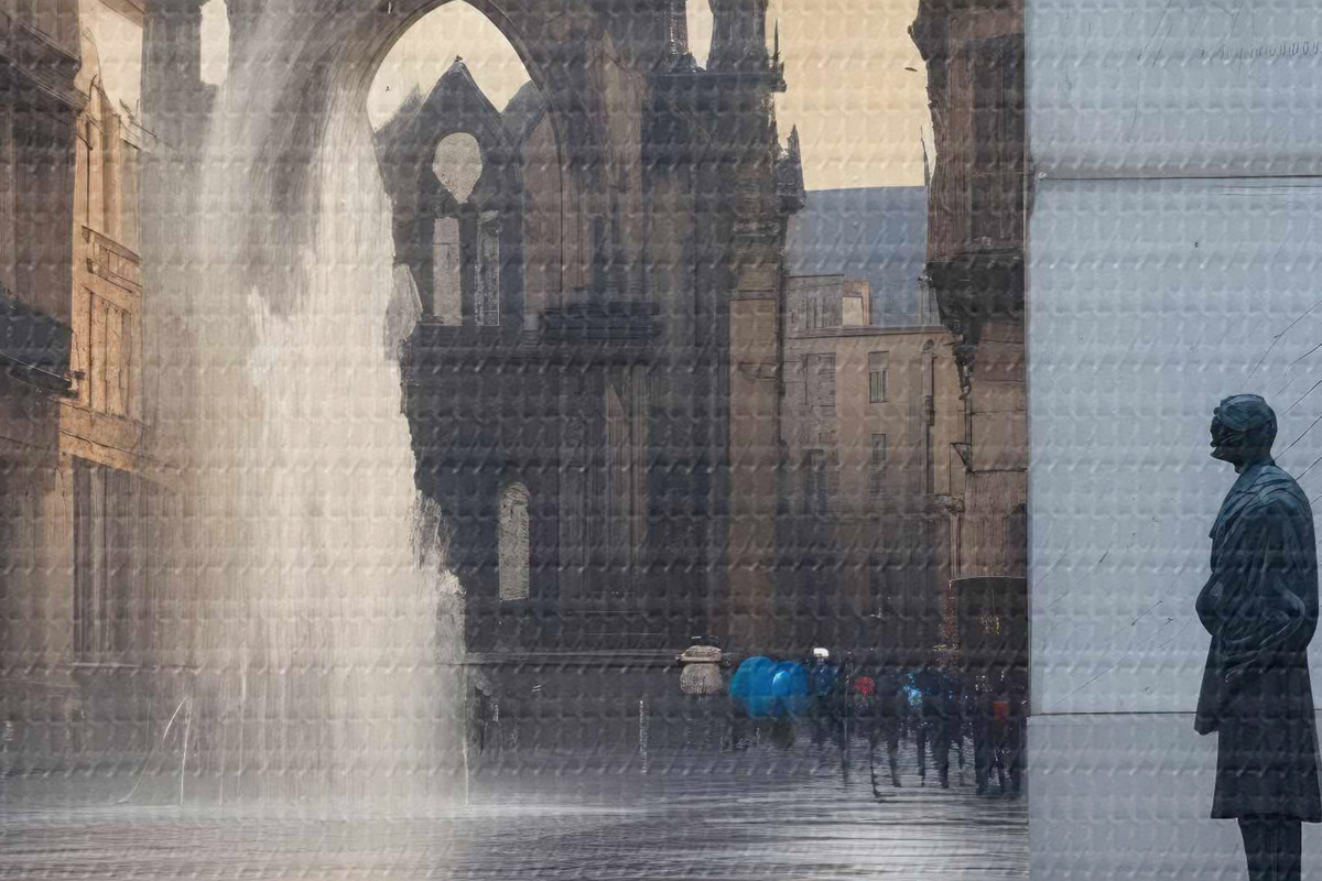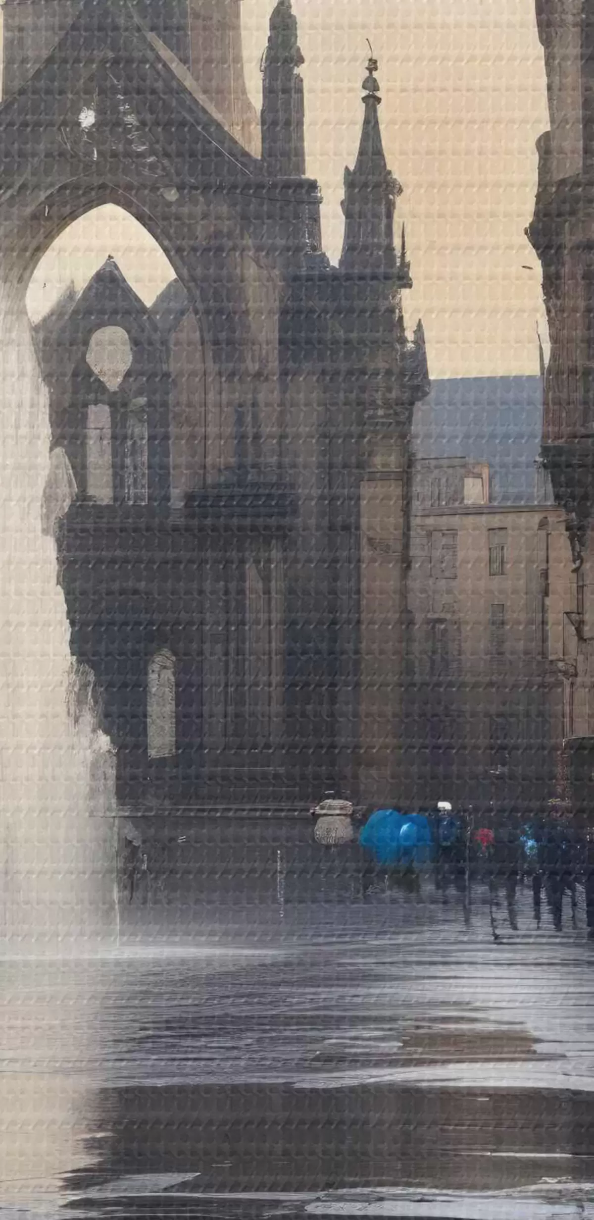 Foto Una catedral medieval de arquitectura gótica se alza al fondo, con sus agujas hacia el cielo Nr r40611