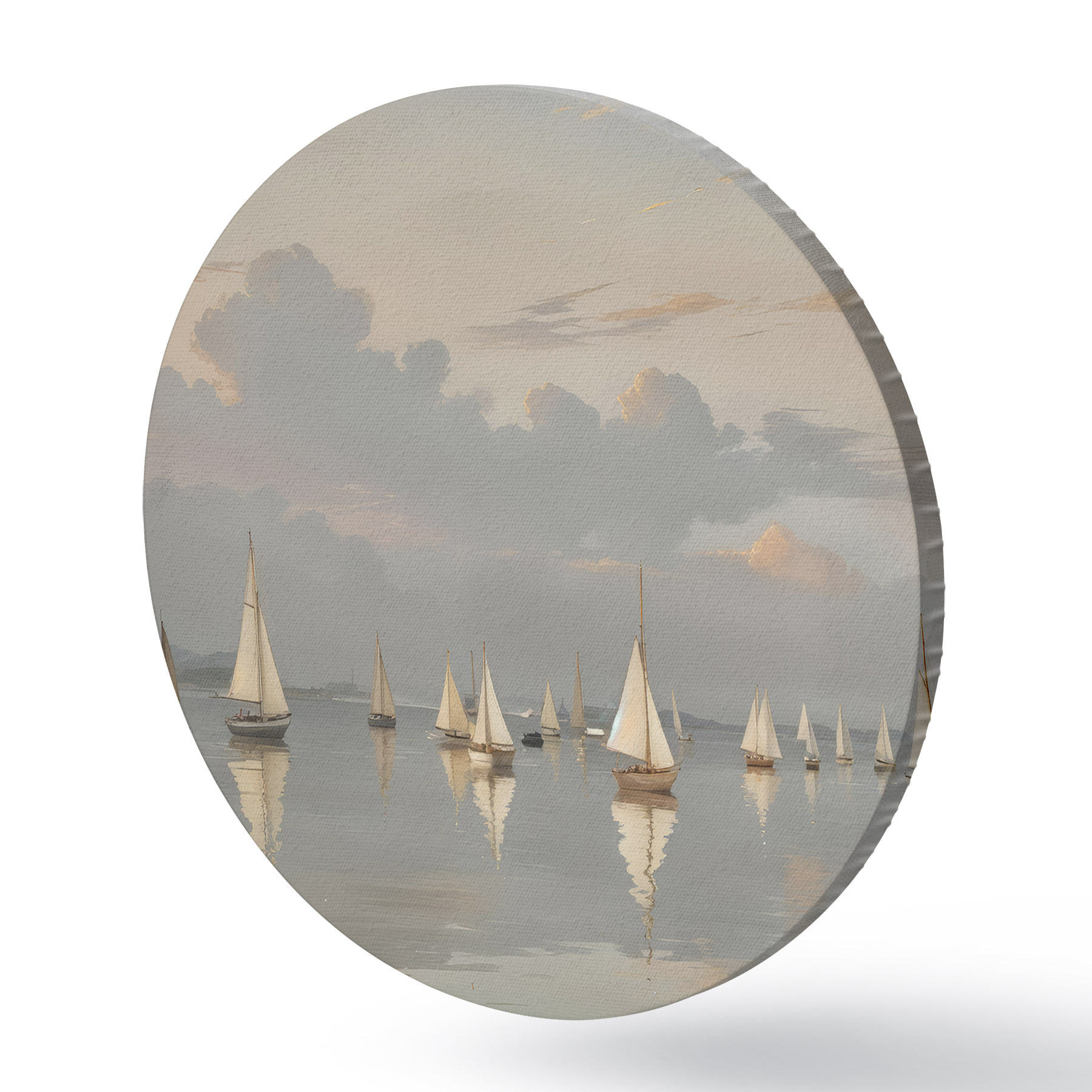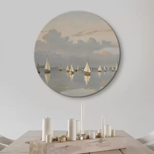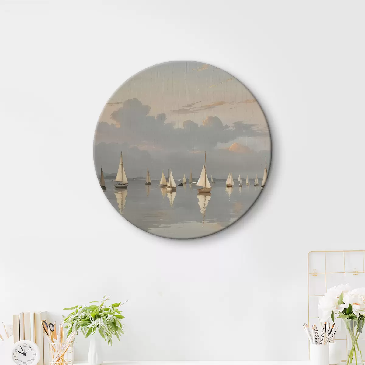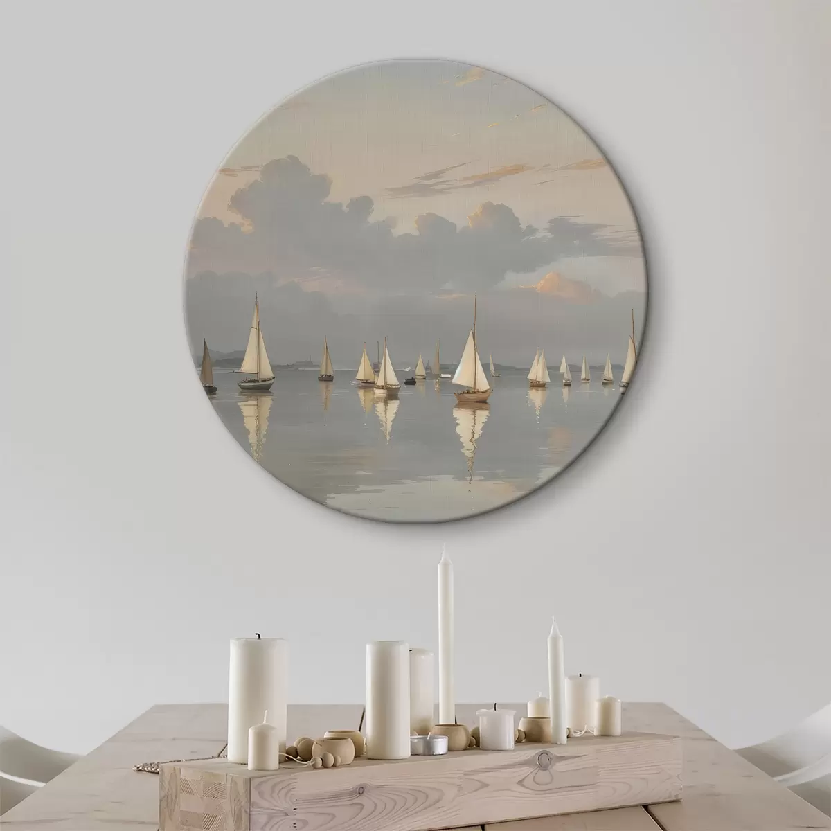 Cuadros redondos Una flota de veleros blancos en una masa de agua tranquila y reflectante al atardecer, con un cielo nublado de fondo r40615