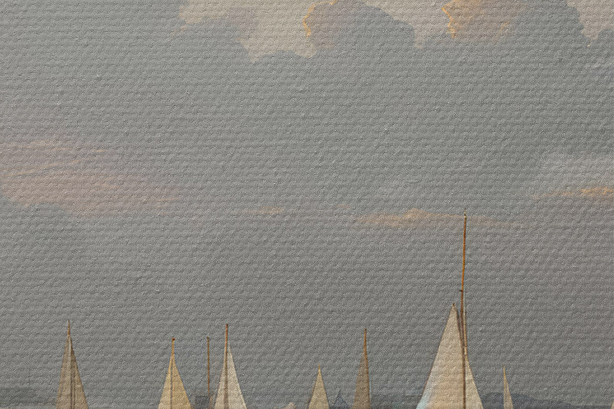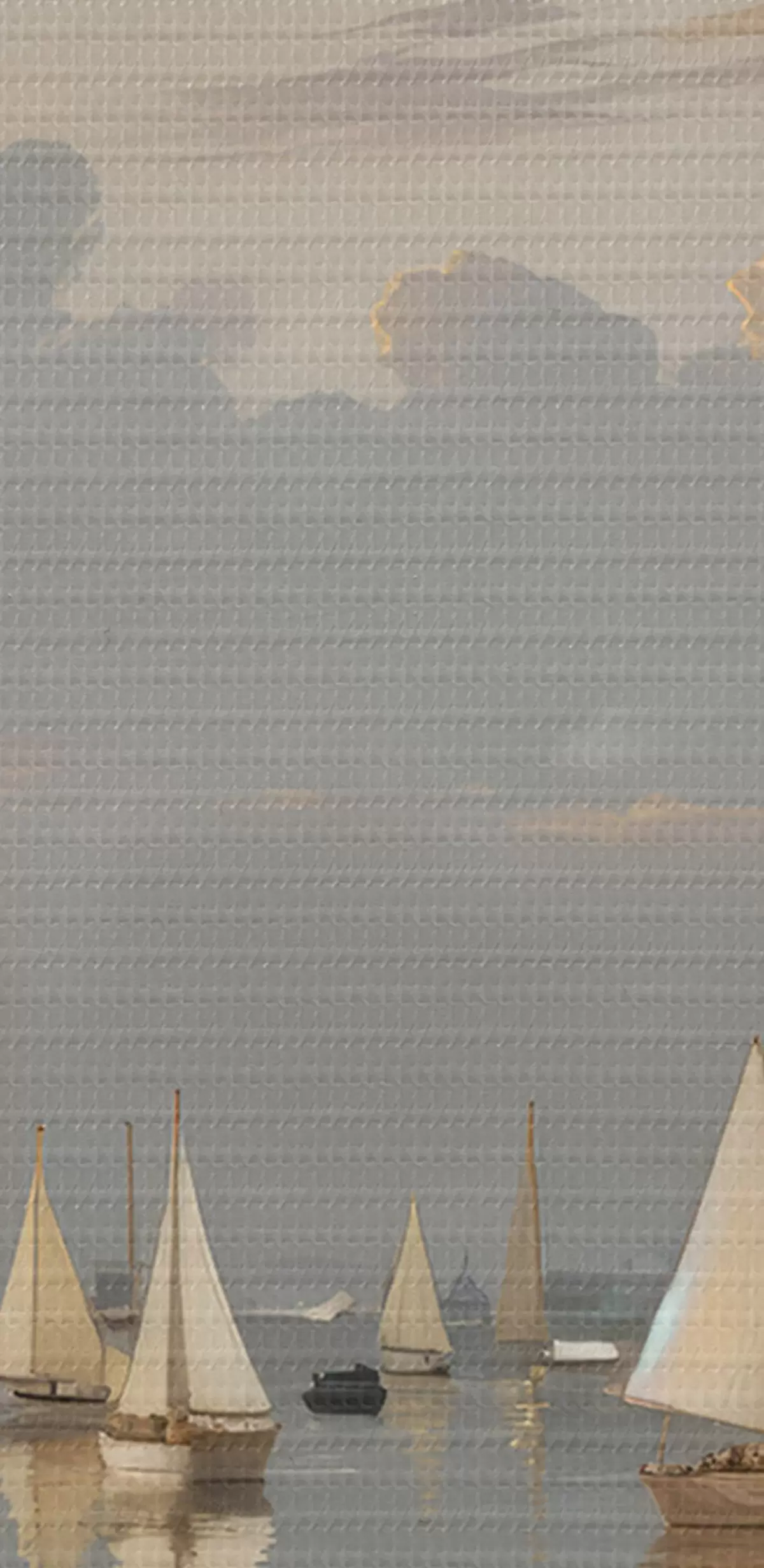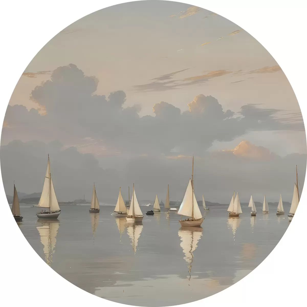 Cuadros redondos Una flota de veleros blancos en una masa de agua tranquila y reflectante al atardecer, con un cielo nublado de fondo r40615