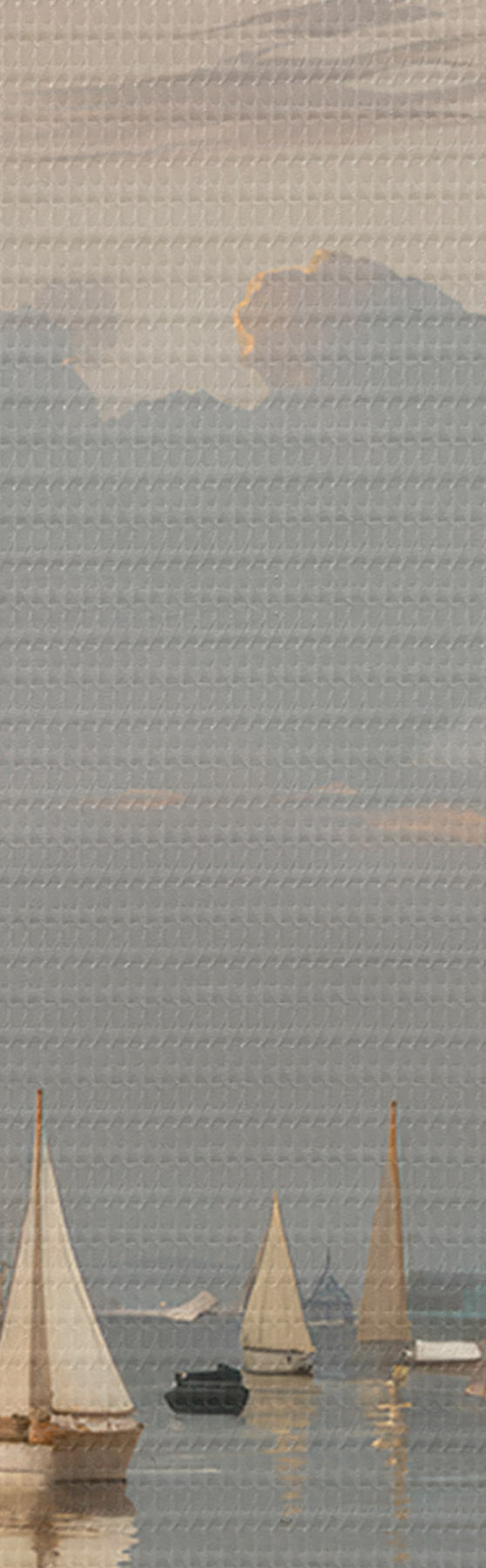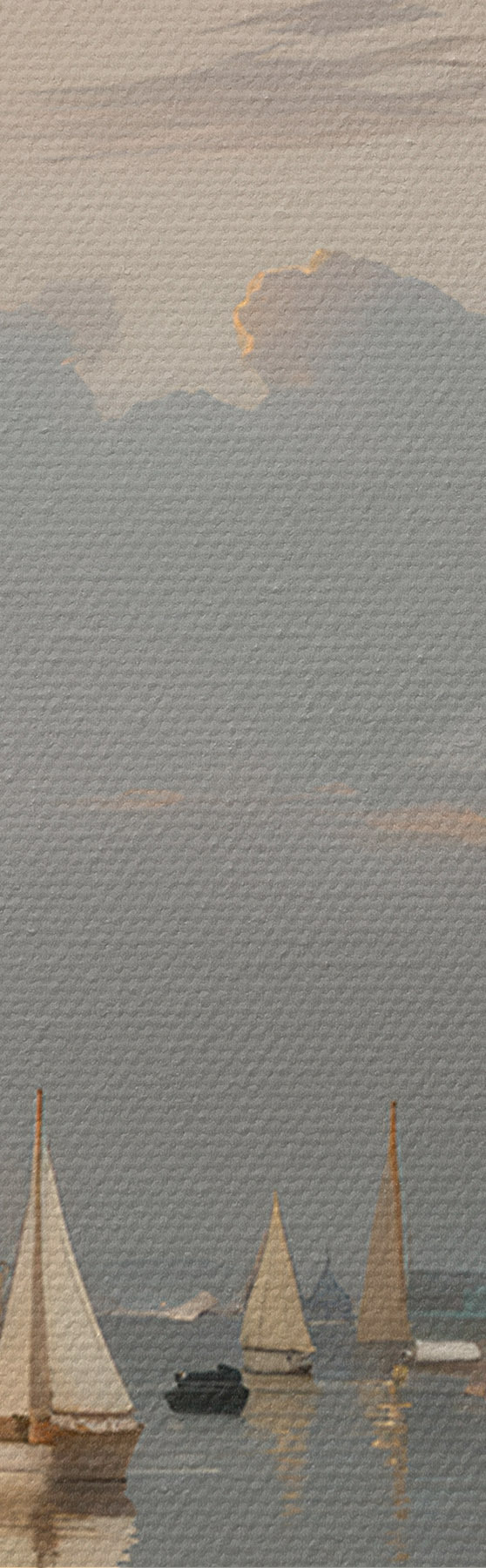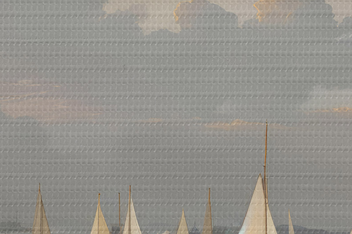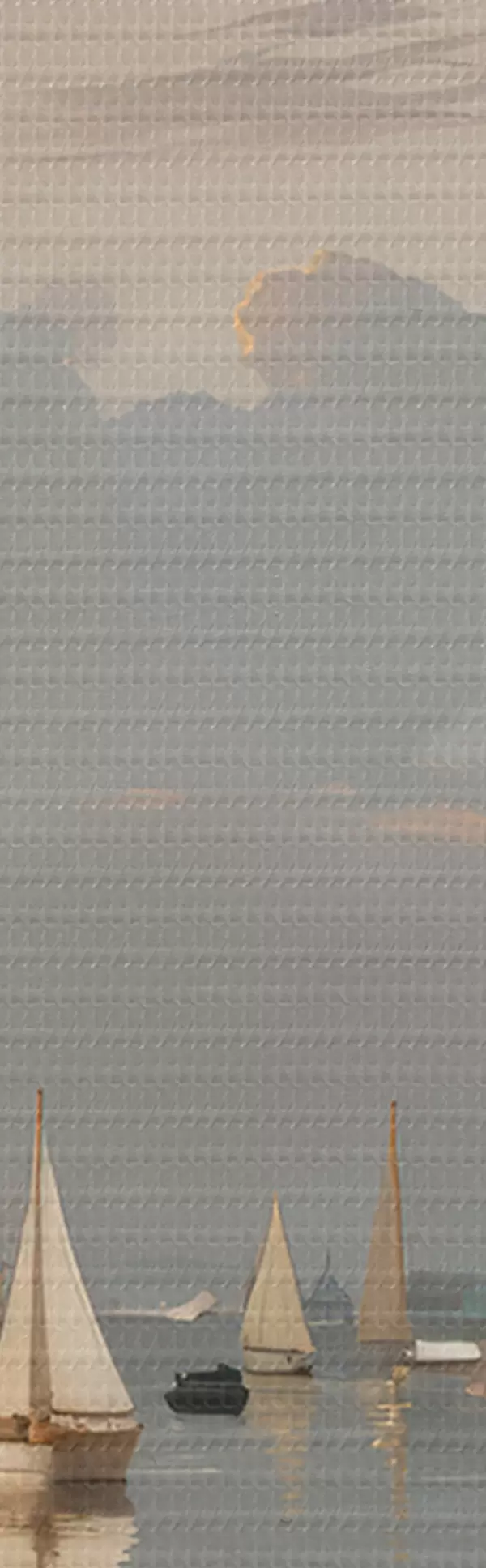 Foto Una flota de veleros blancos en una masa de agua tranquila y reflectante al atardecer, con un cielo nublado de fondo Nr r40615