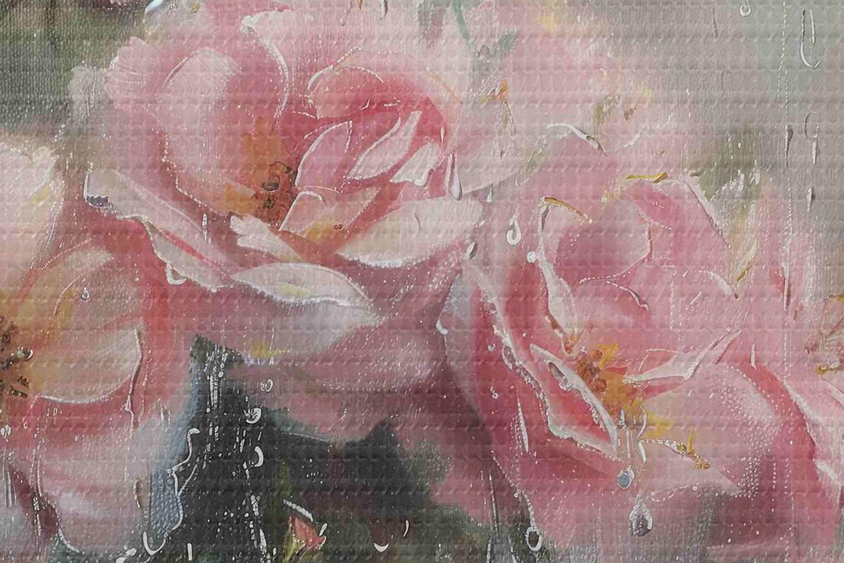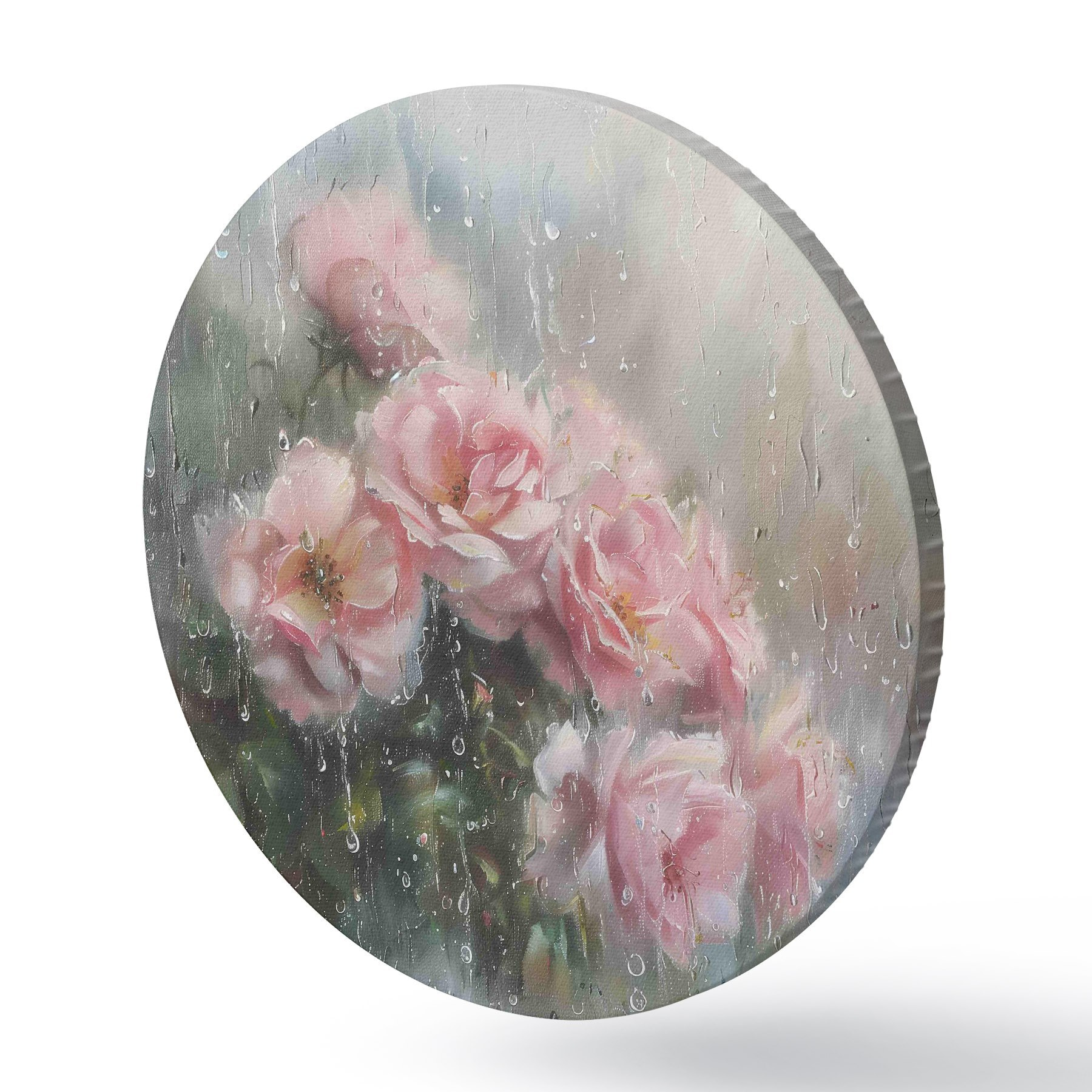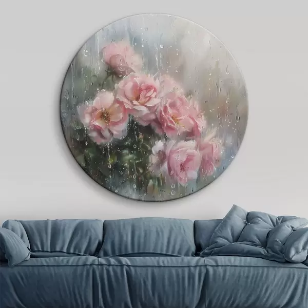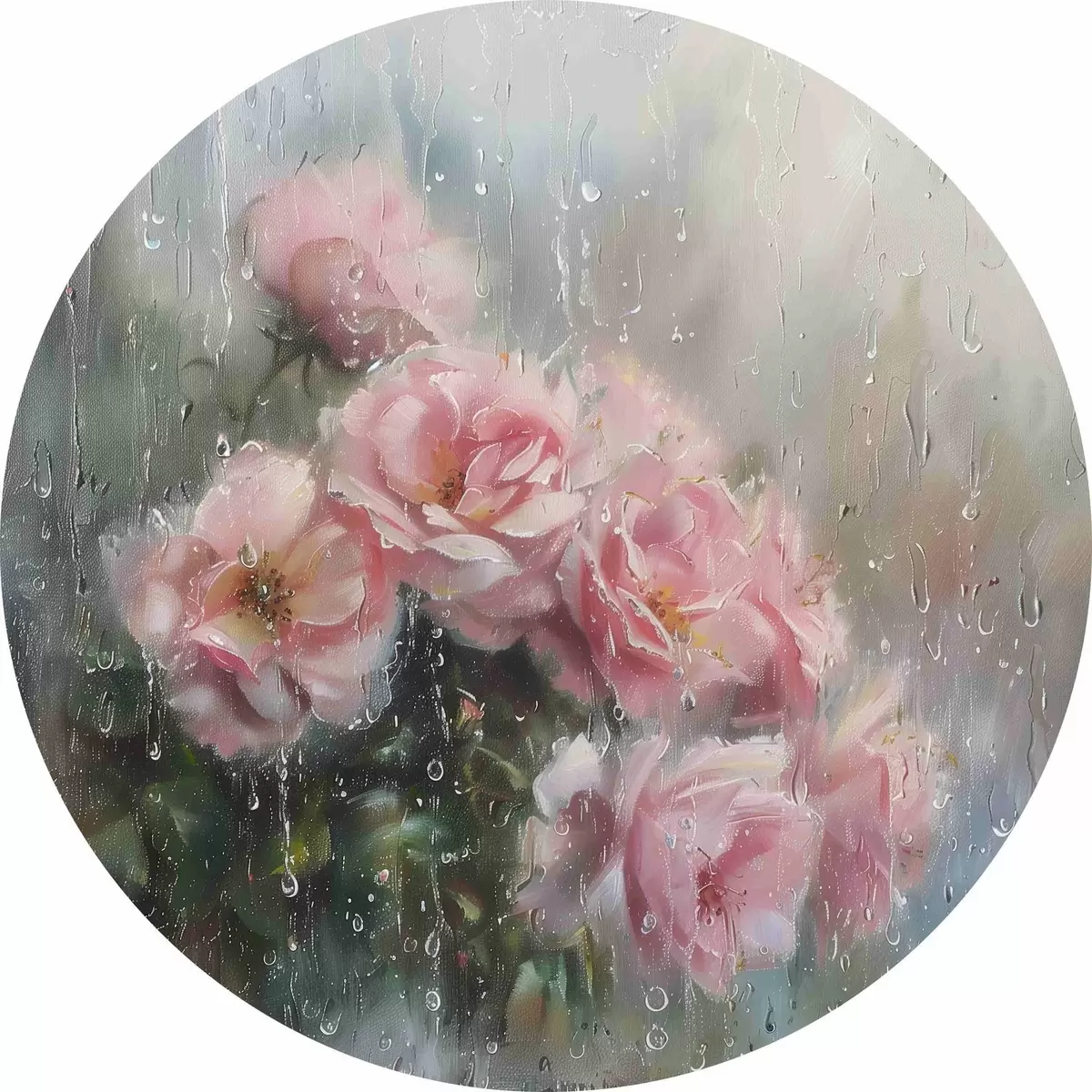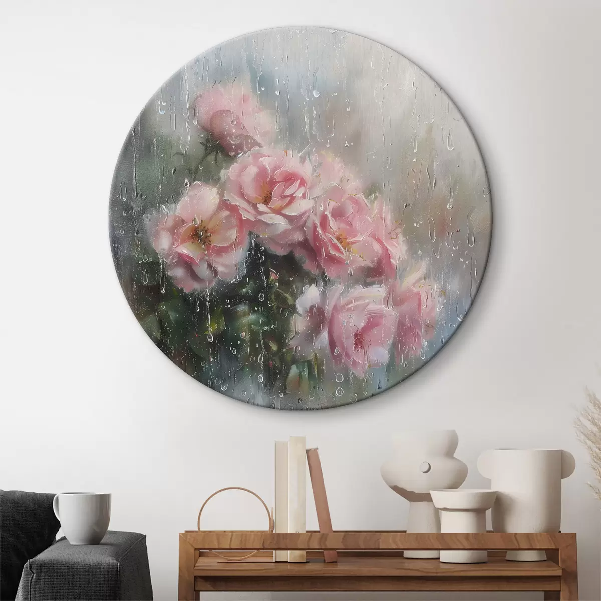 Cuadros redondos Un ramo de rosas rosas en la ventana cuando llueve r40656