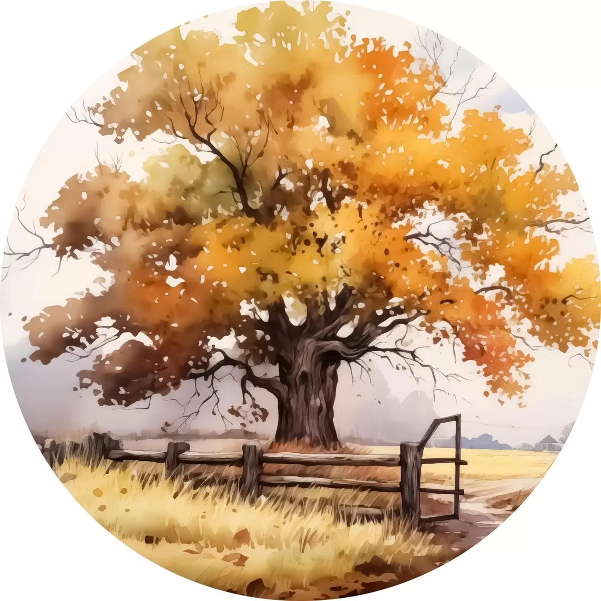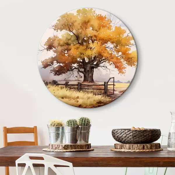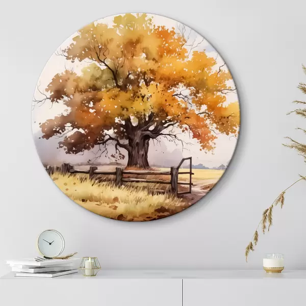 Cuadros redondos Árbol en el campo cerca de la valla con hojas amarillentas, paisaje de otoño r40680