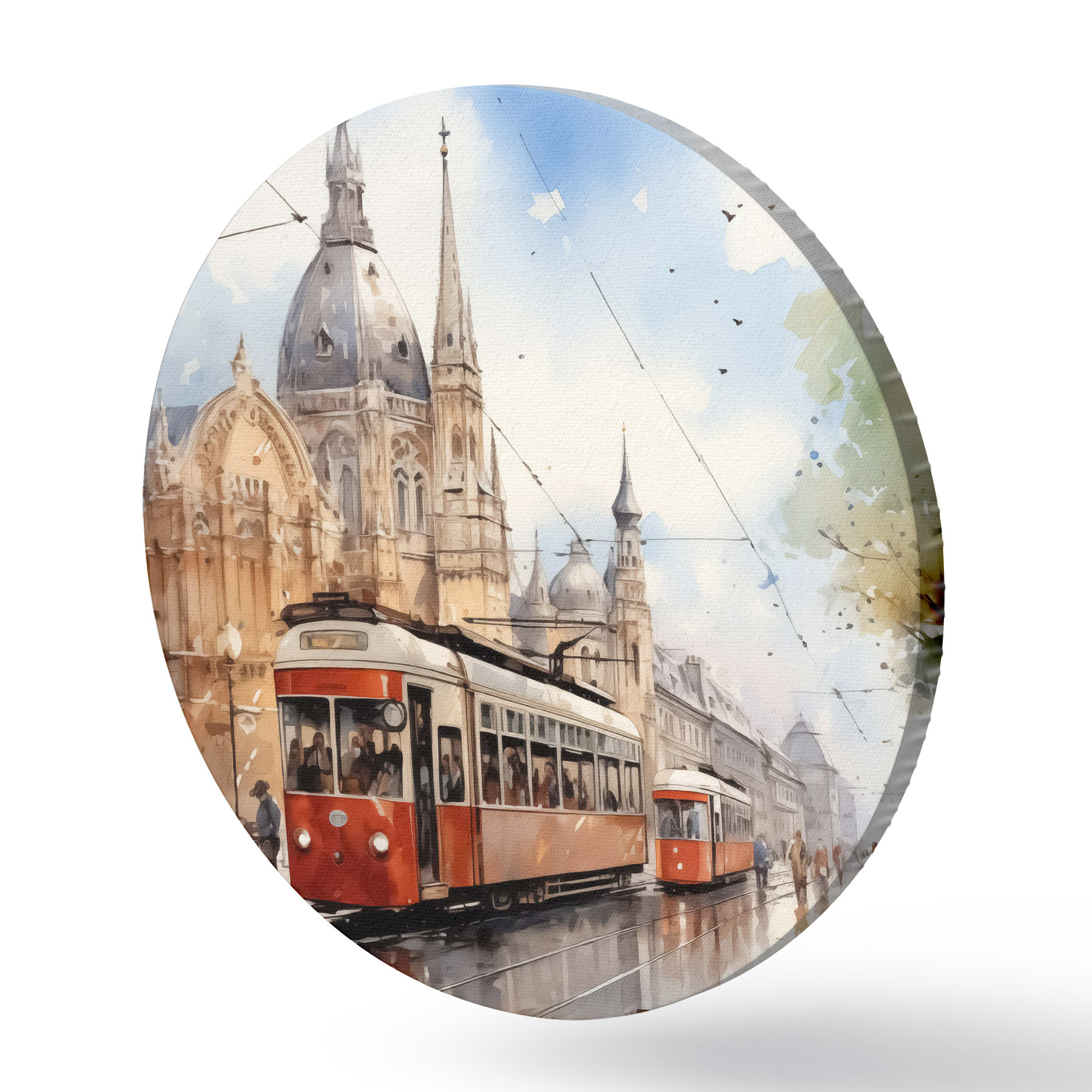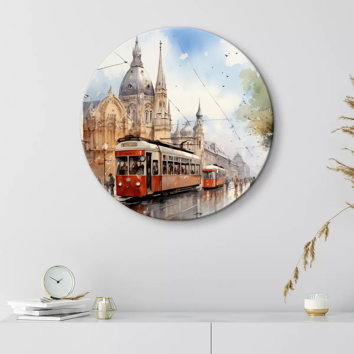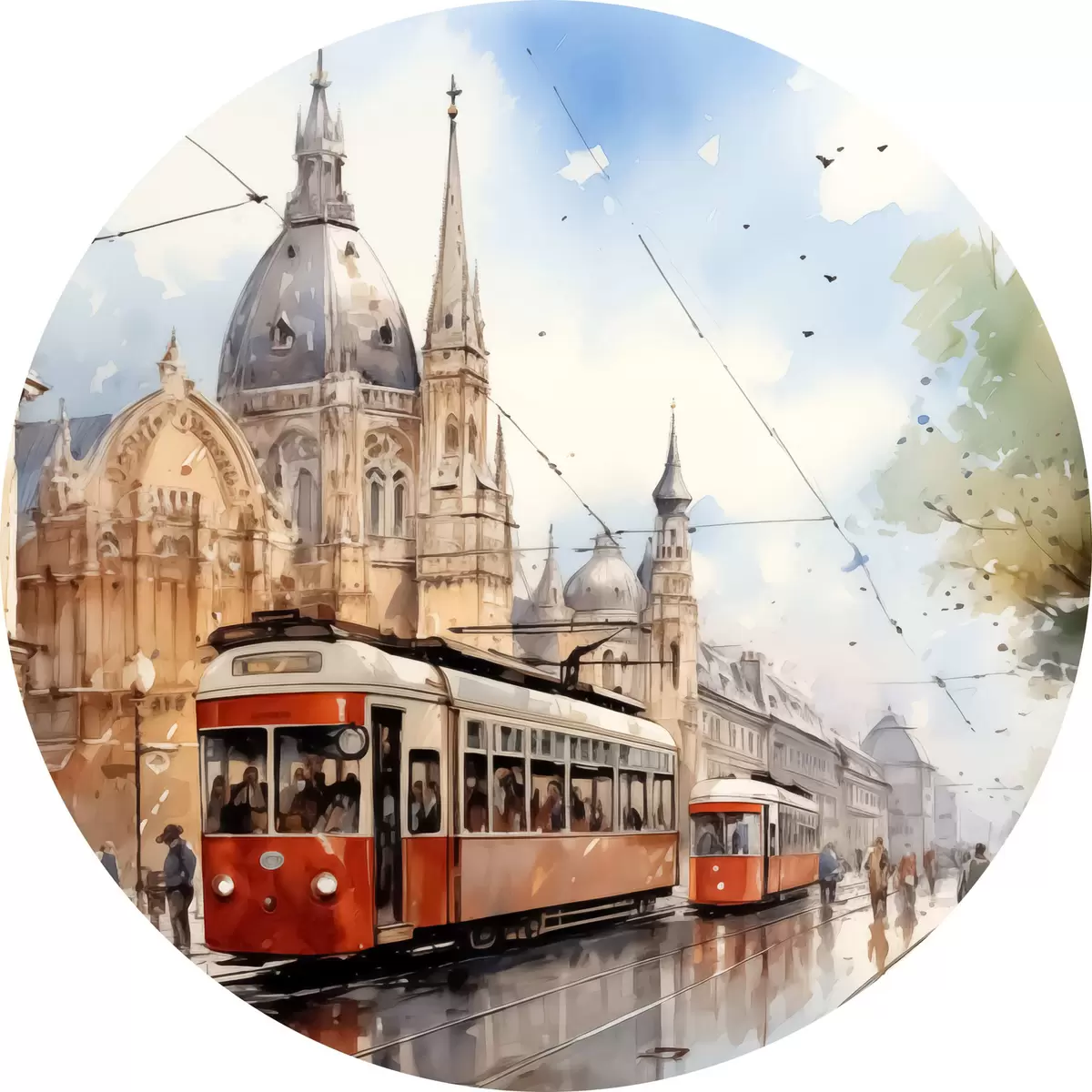 Cuadros redondos Tranvía rojo en una calle de Viena acuarela r40732