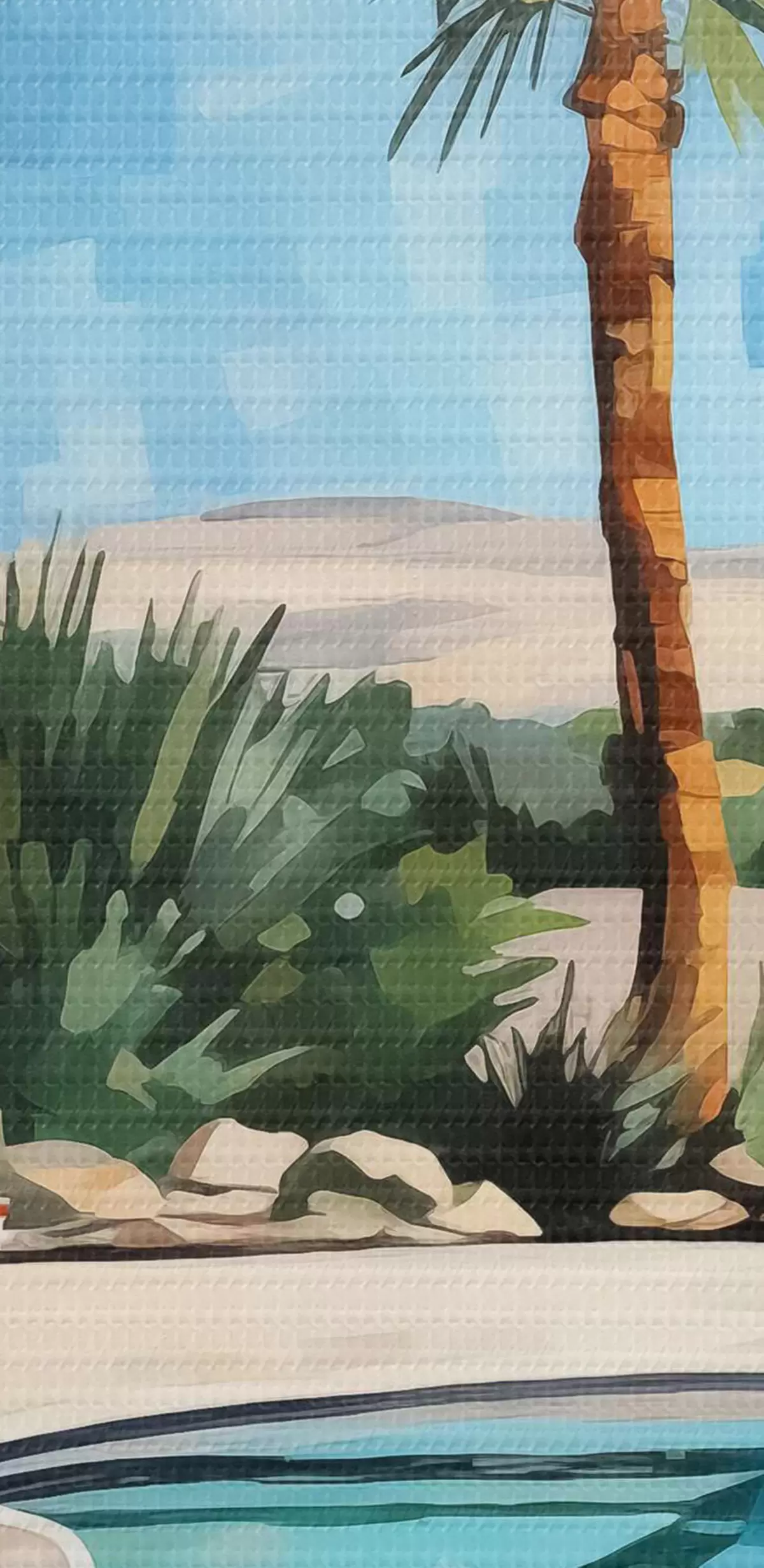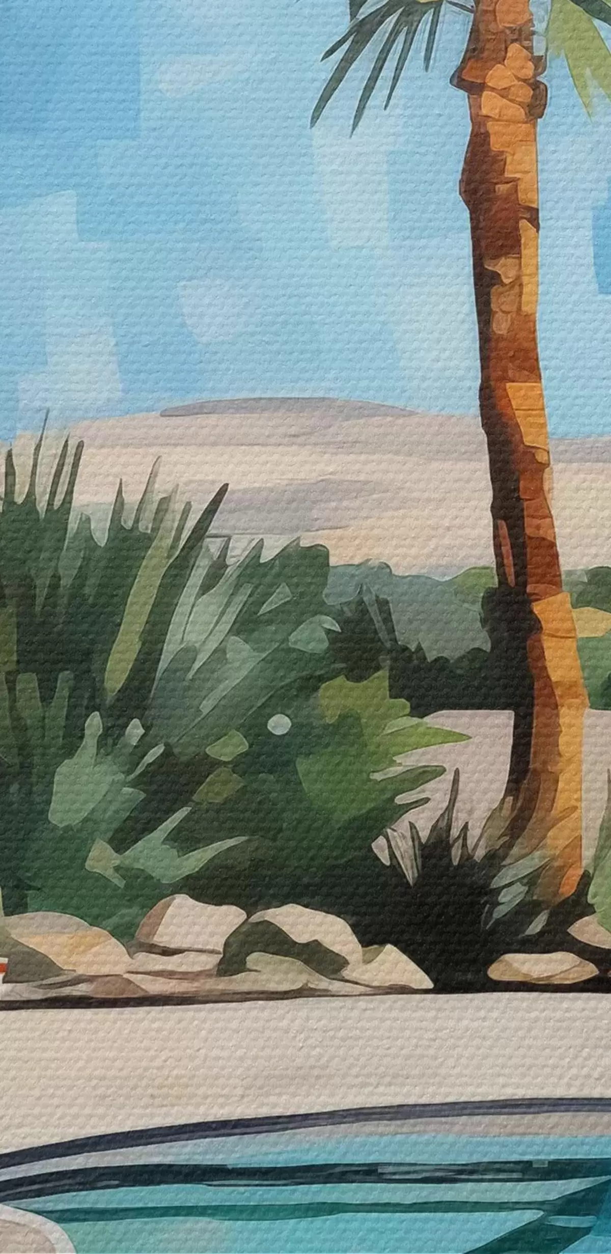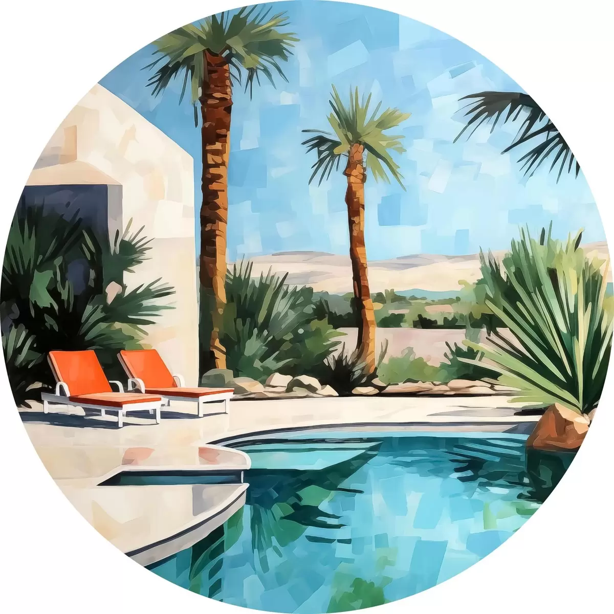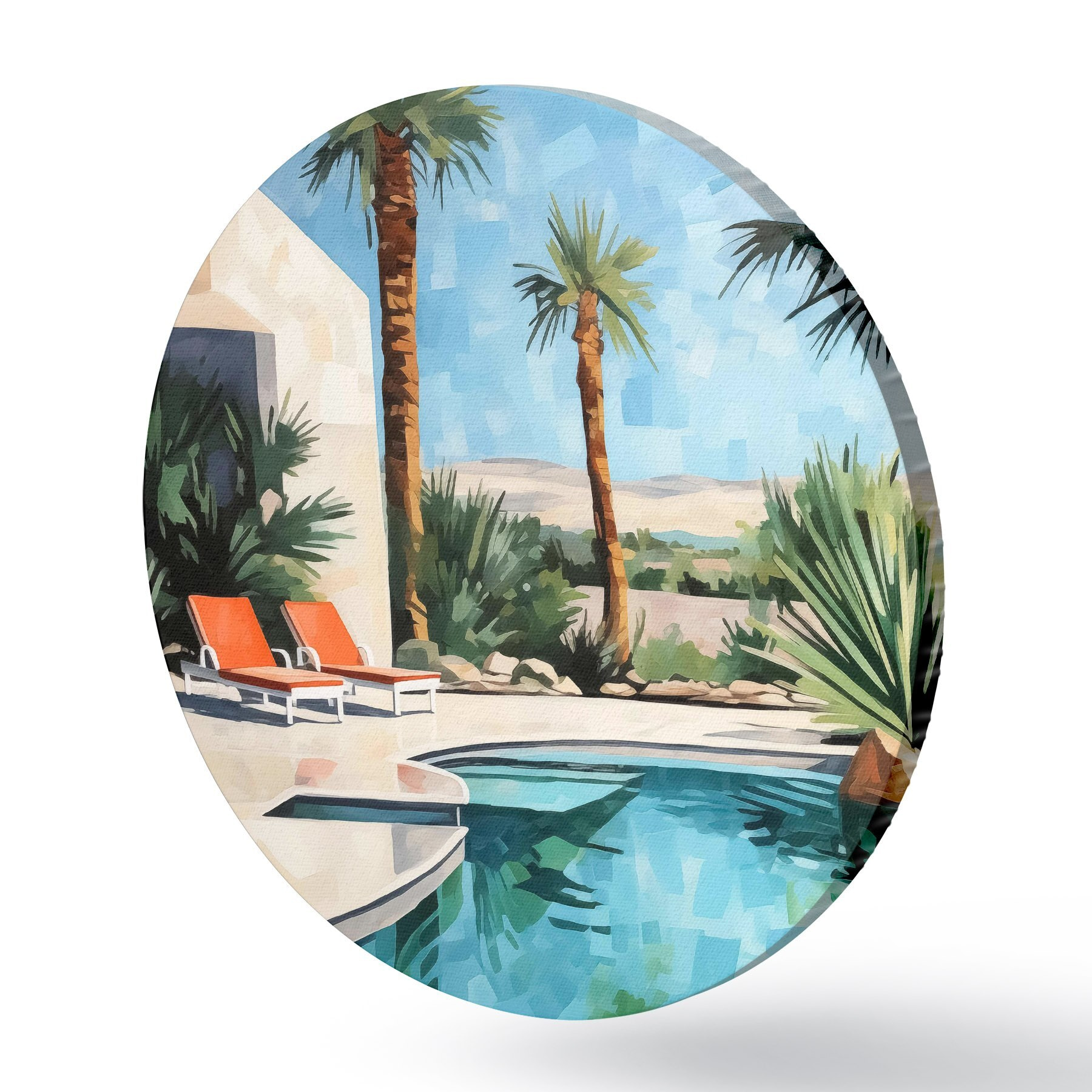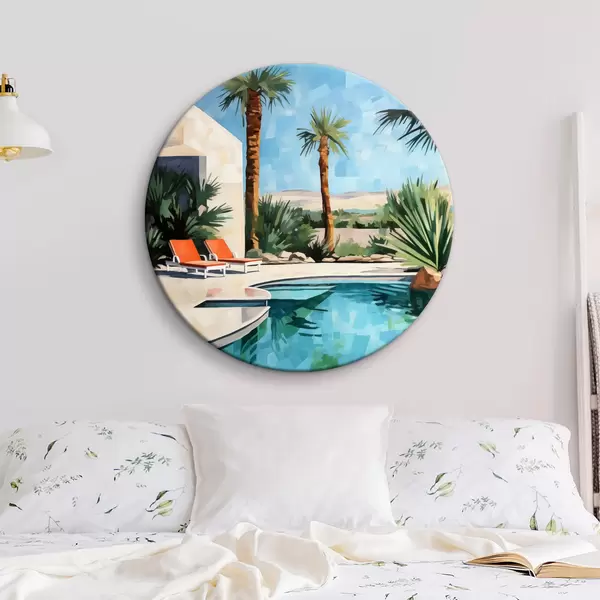 Cuadros redondos Palmeras cerca del hotel con una piscina cerca de las rocas, colores azul, verde, rojo r40748