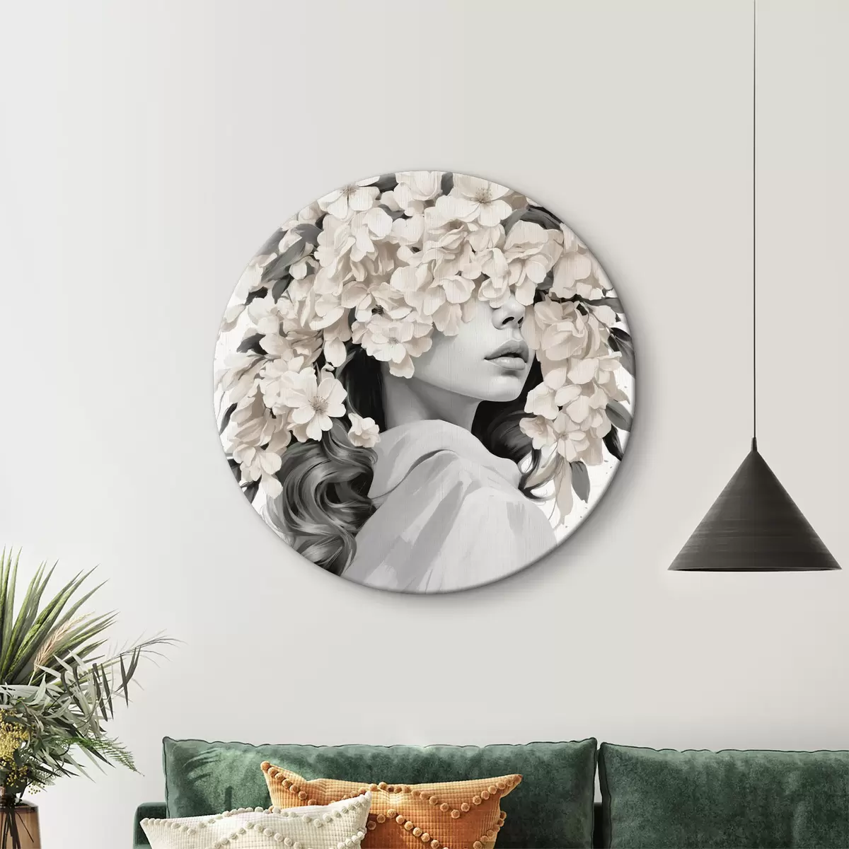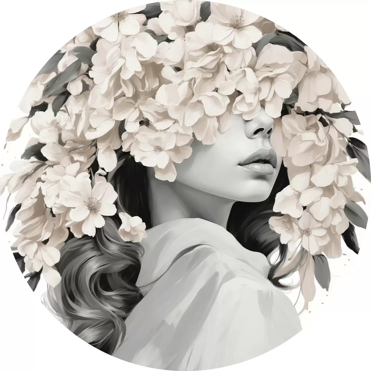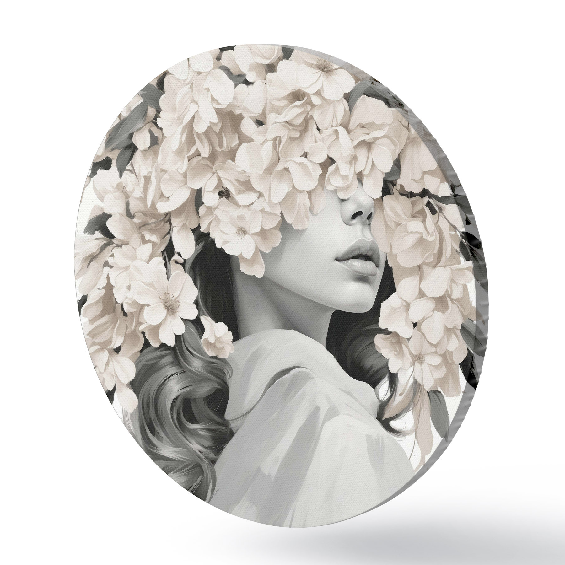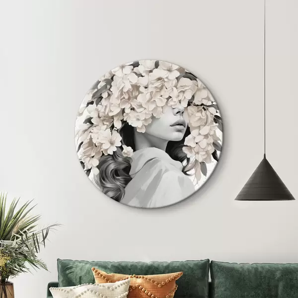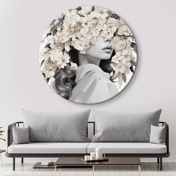 Cuadros redondos Chica con flores en la cara en colores blanco y negro r40849
