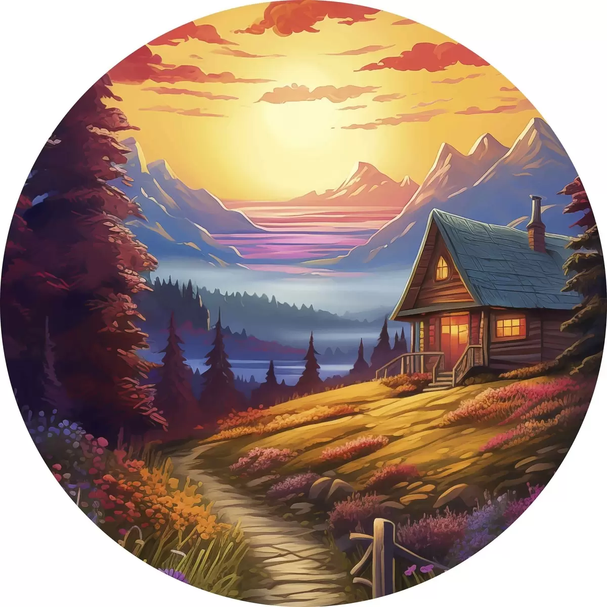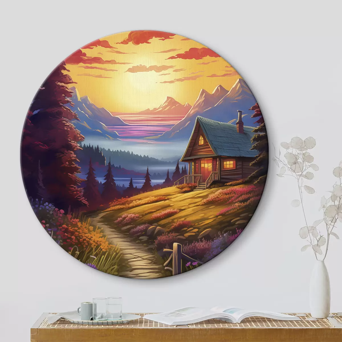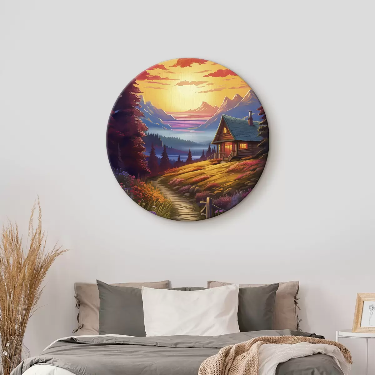 Cuadros redondos Paisaje caprichoso con montañas y casa de madera r40940