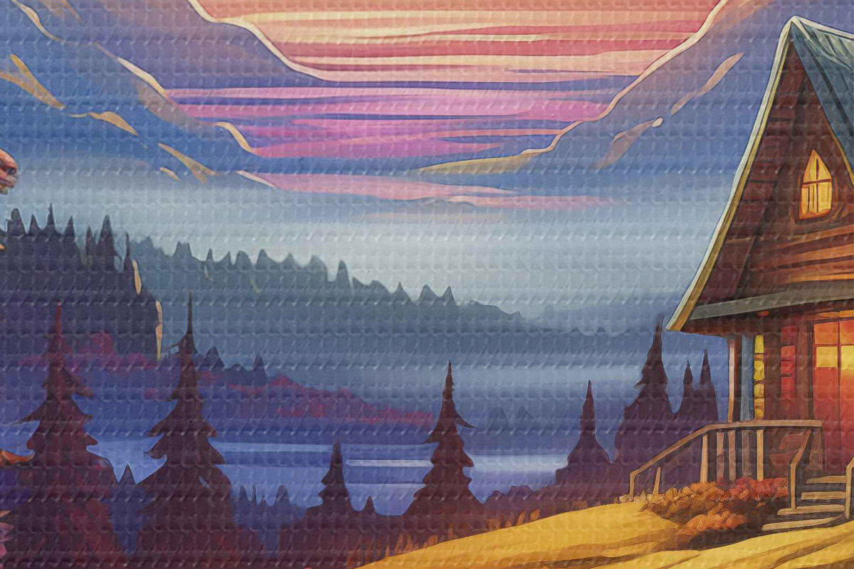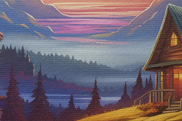 Foto Paisaje caprichoso con montañas y casa de madera Nr r40940