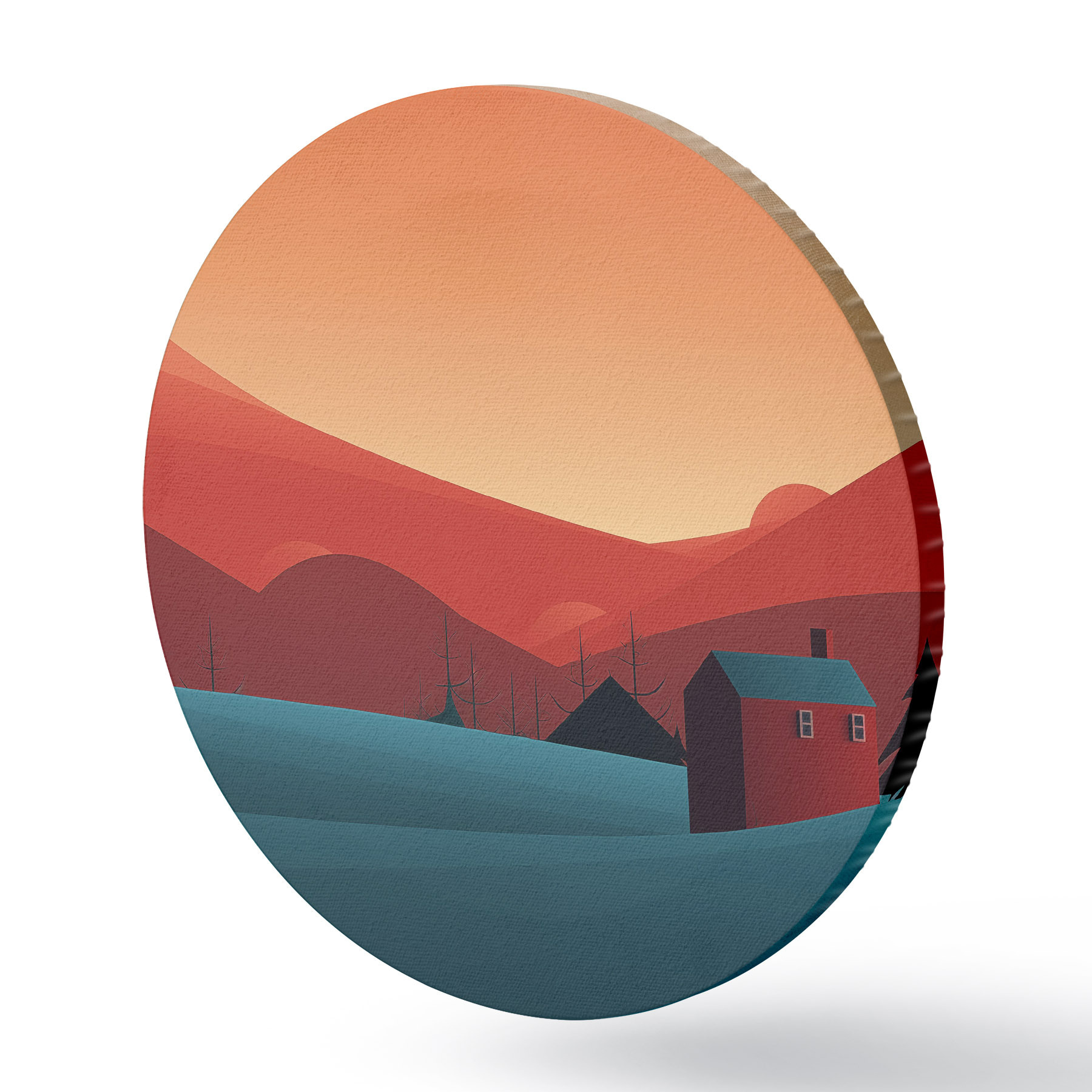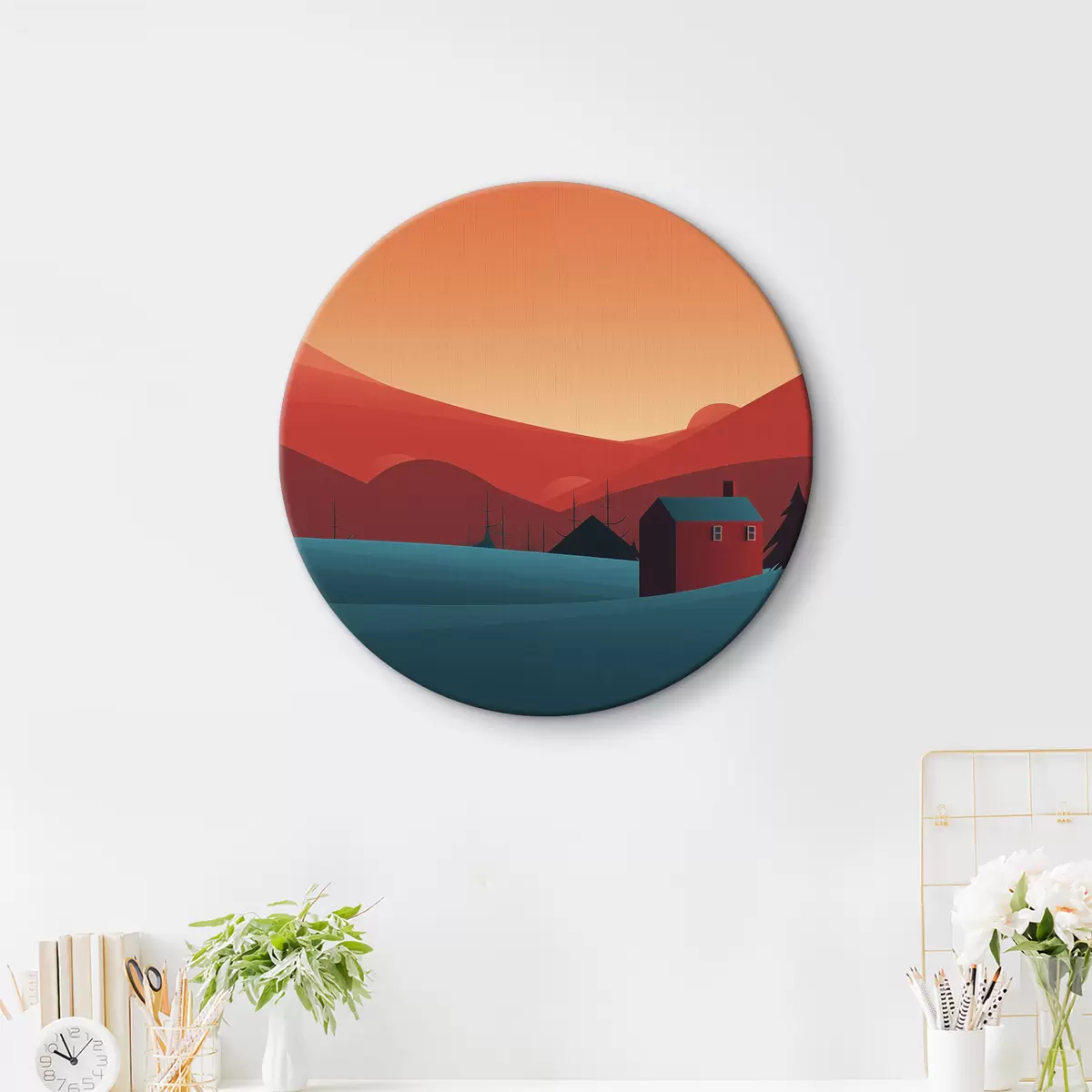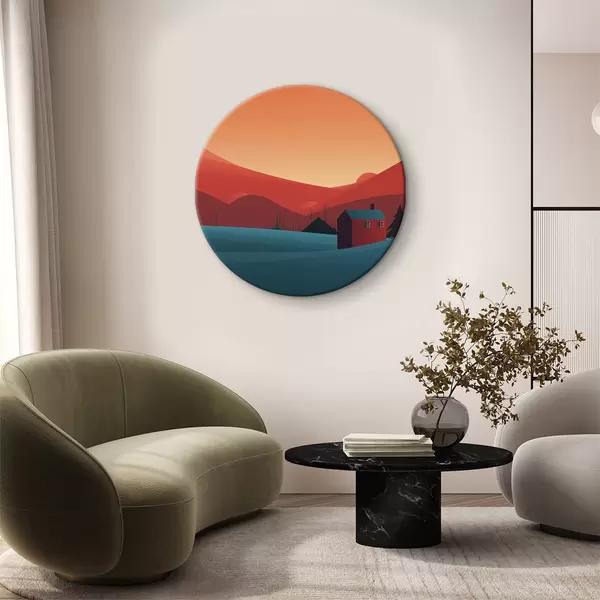 Cuadros redondos Paisaje minimalista con casa y bosque r40952