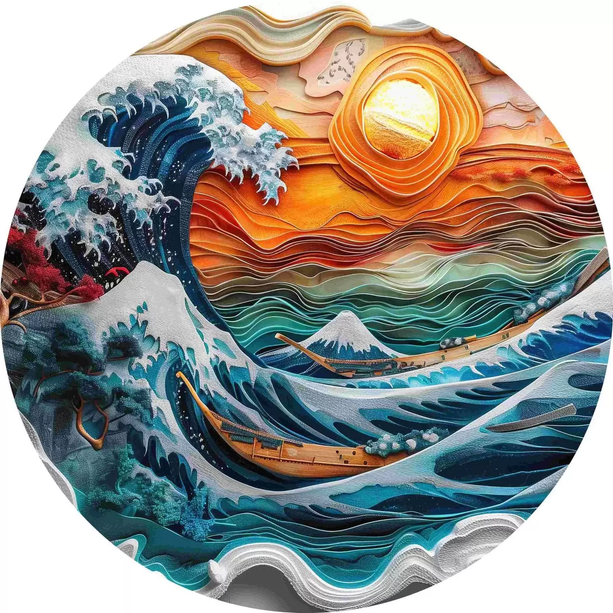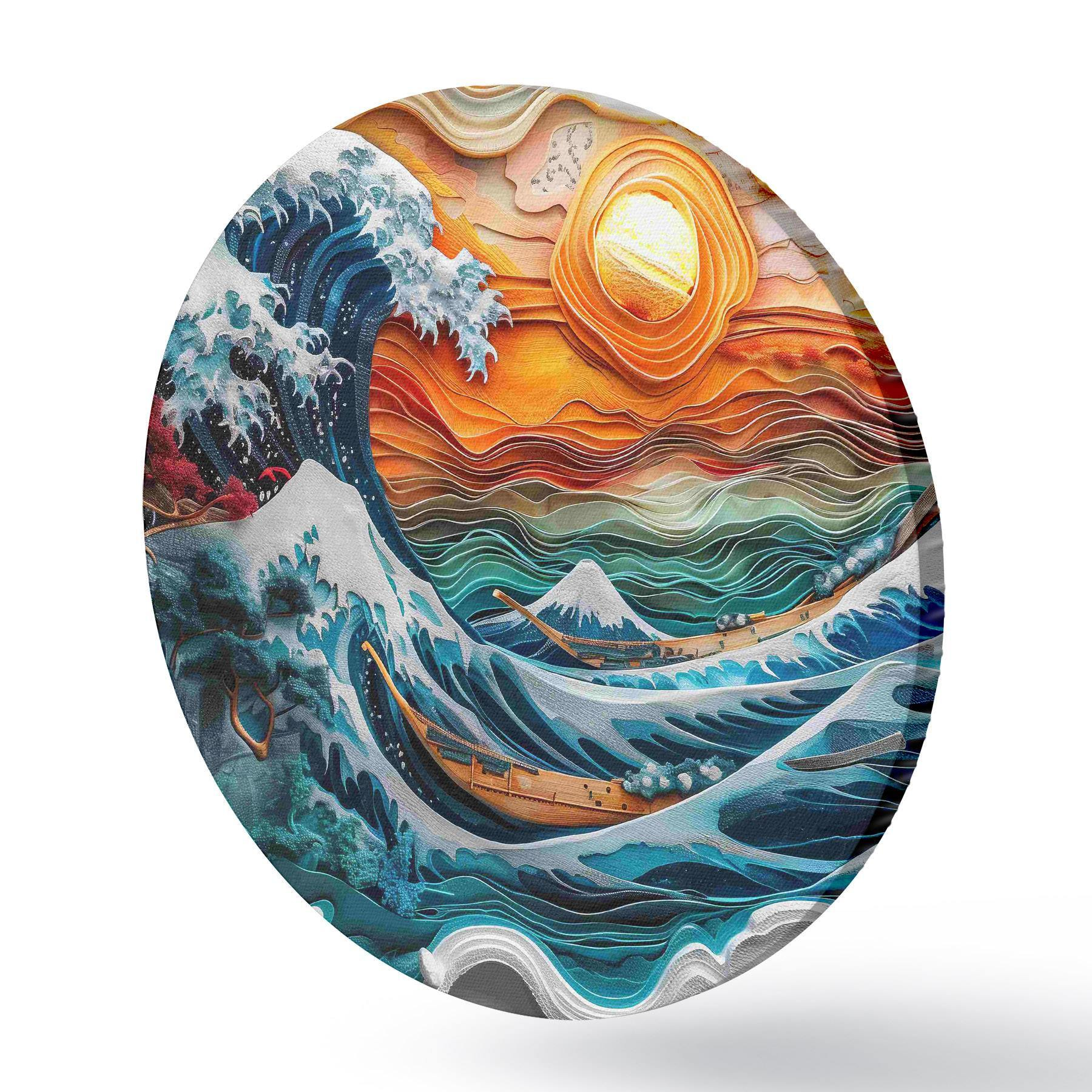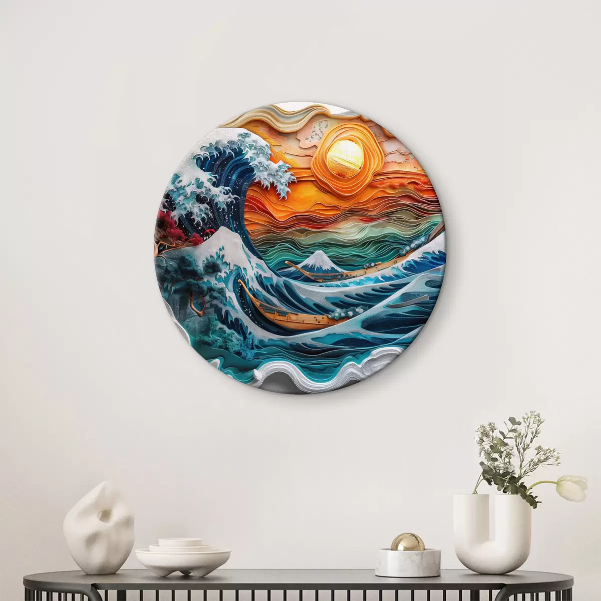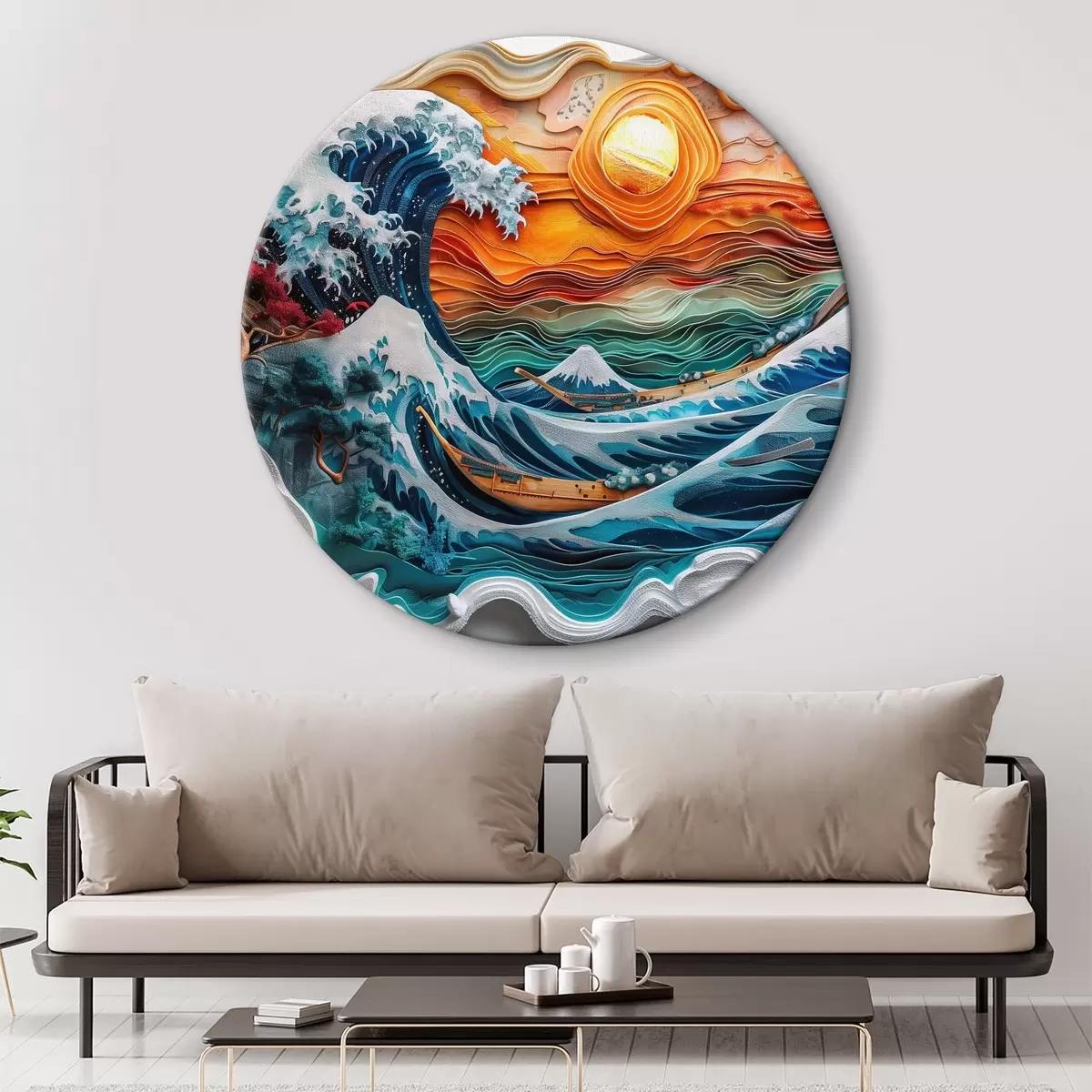 Cuadros redondos Imitación de un bajorrelieve: un océano embravecido con barcos y el sol r40976