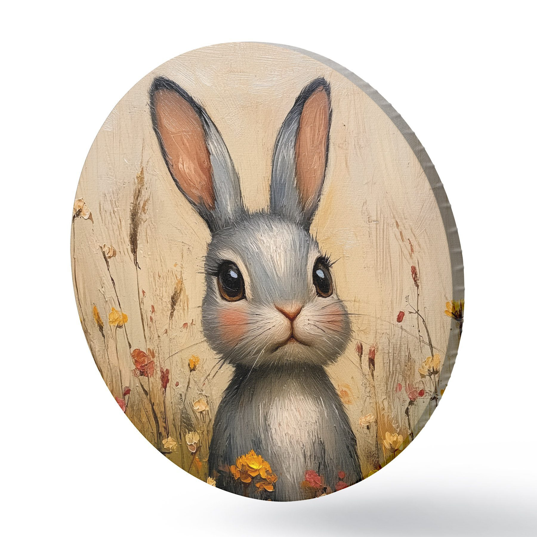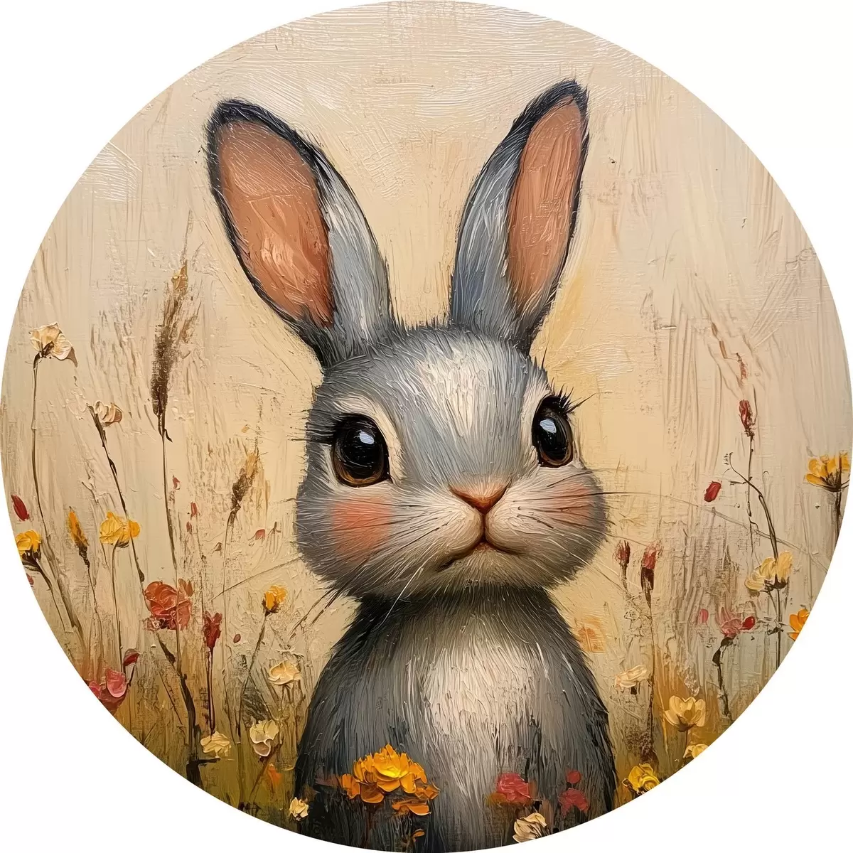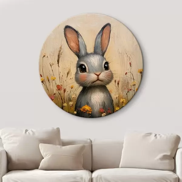 Cuadros redondos Conejo en el campo entre flores con pinceladas r40999