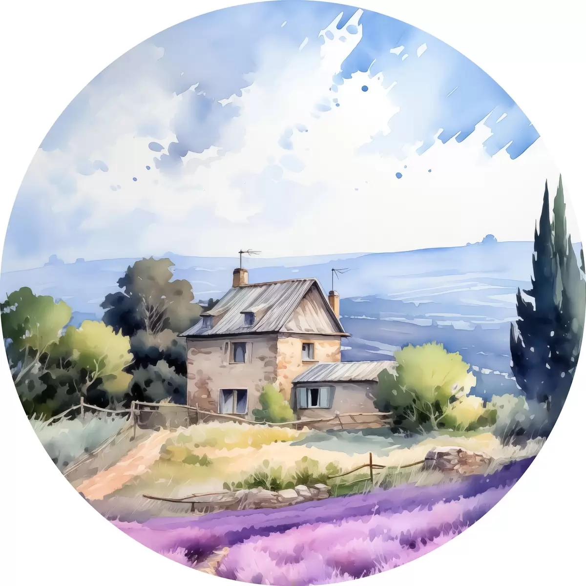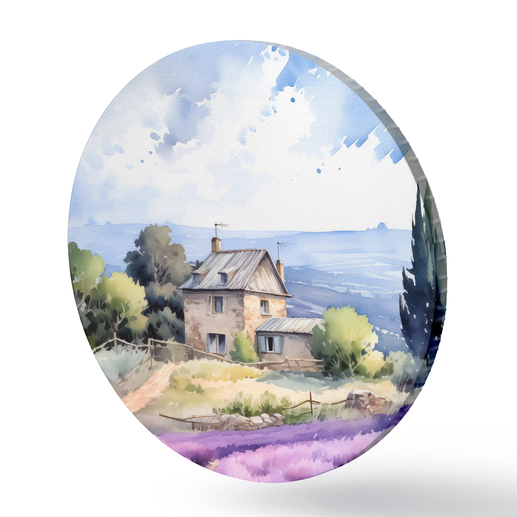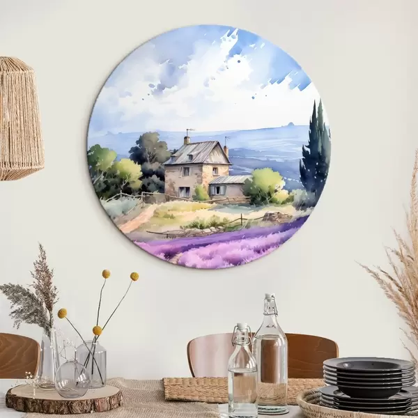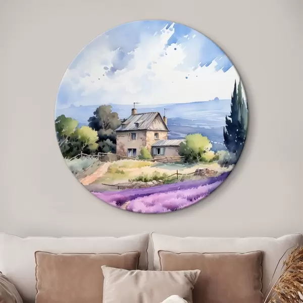 Cuadros redondos Casa de campo con montañas al fondo cerca de un campo de lavanda r41012