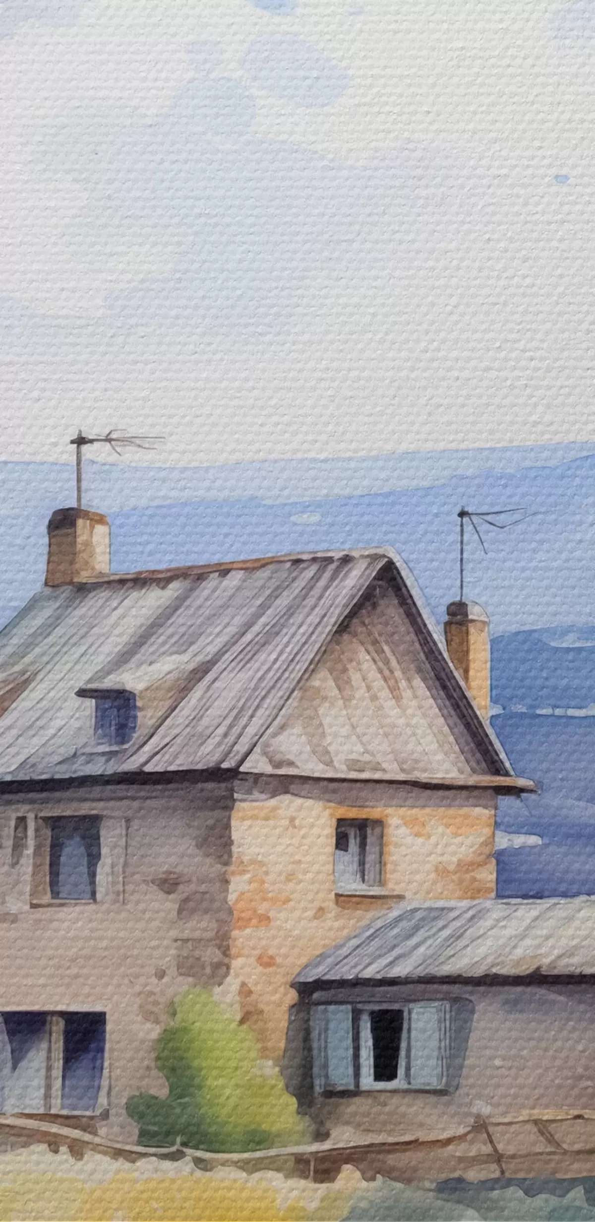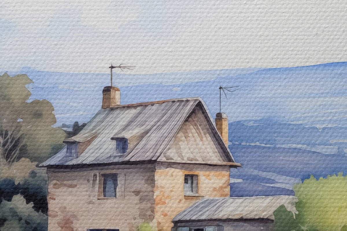 Foto Casa de campo con montañas al fondo cerca de un campo de lavanda Nr r41012