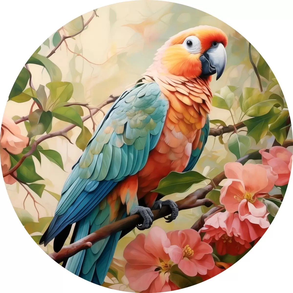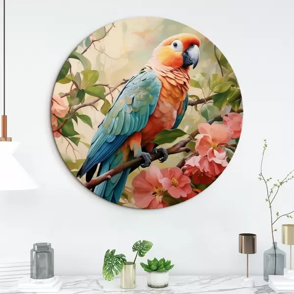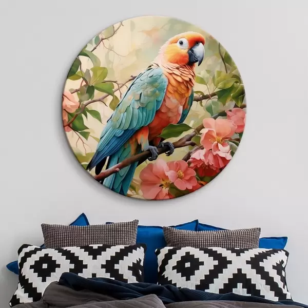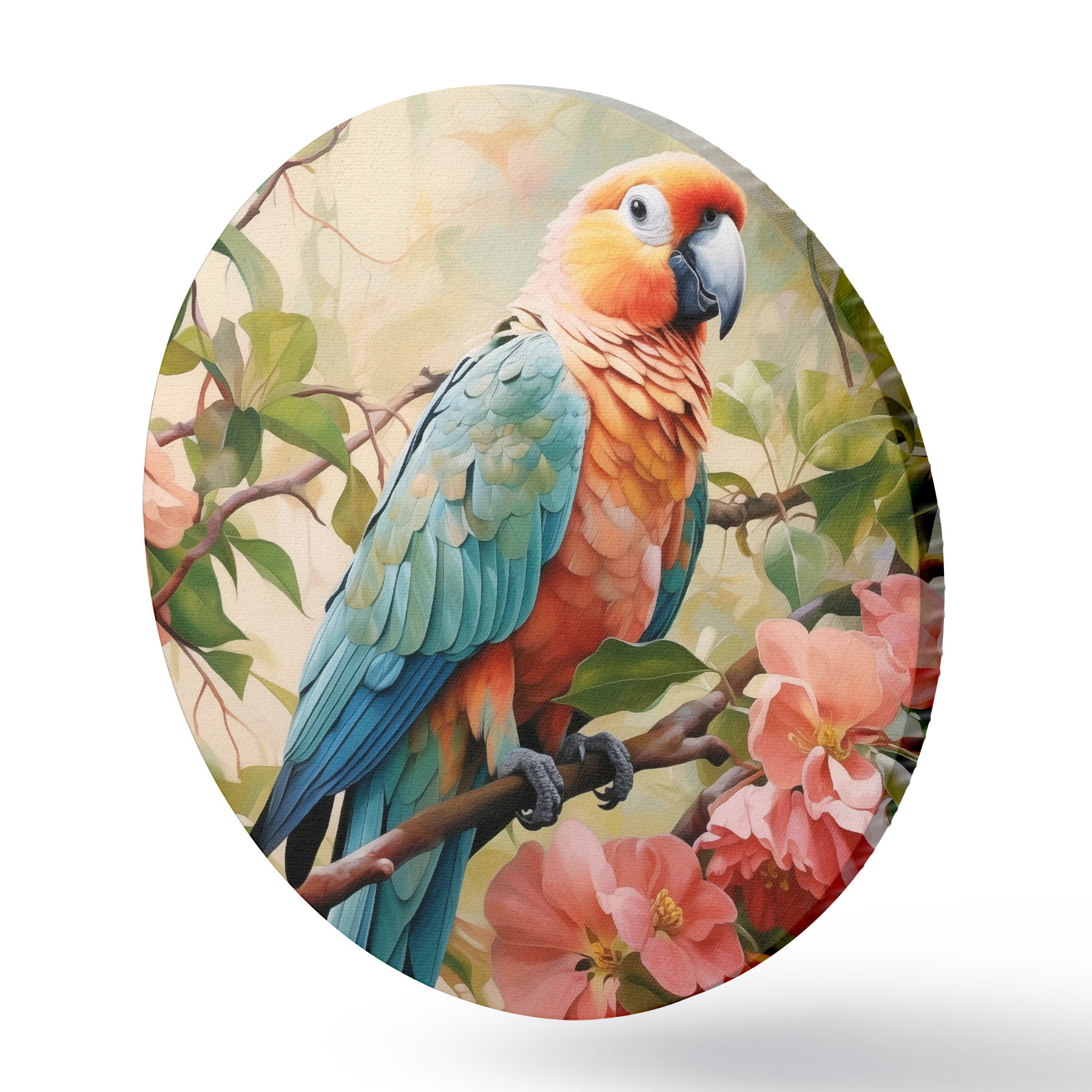 Cuadros redondos Loro pardillo sentado en una rama con flores rosas r41018