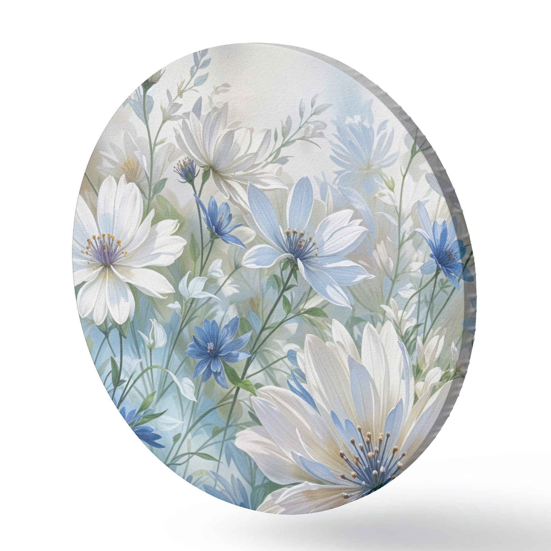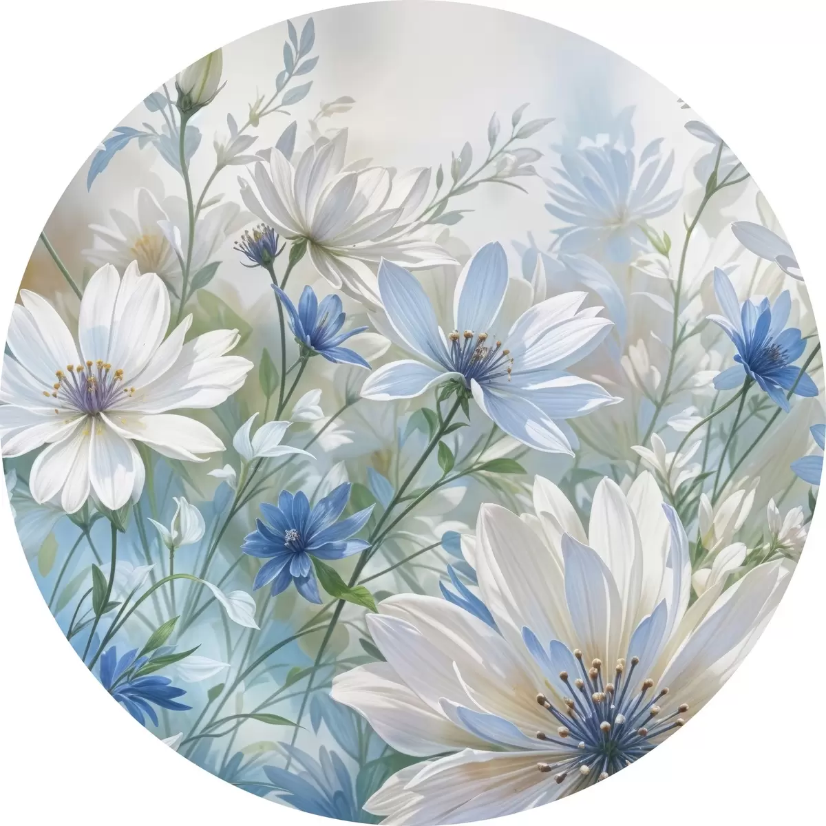Cuadros redondos Campo de flores blancas y azules parecidas a margaritas con hojas y tallos verdes sobre un fondo borroso suave r41086