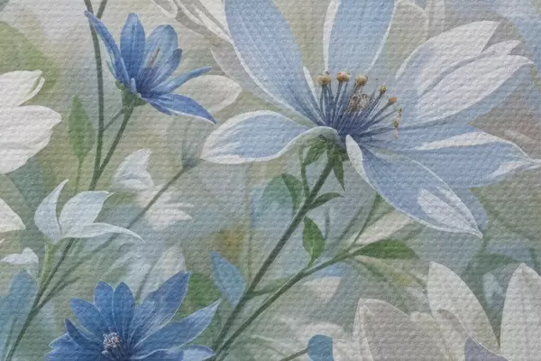 Foto Campo de flores blancas y azules parecidas a margaritas con hojas y tallos verdes sobre un fondo borroso suave Nr r41086