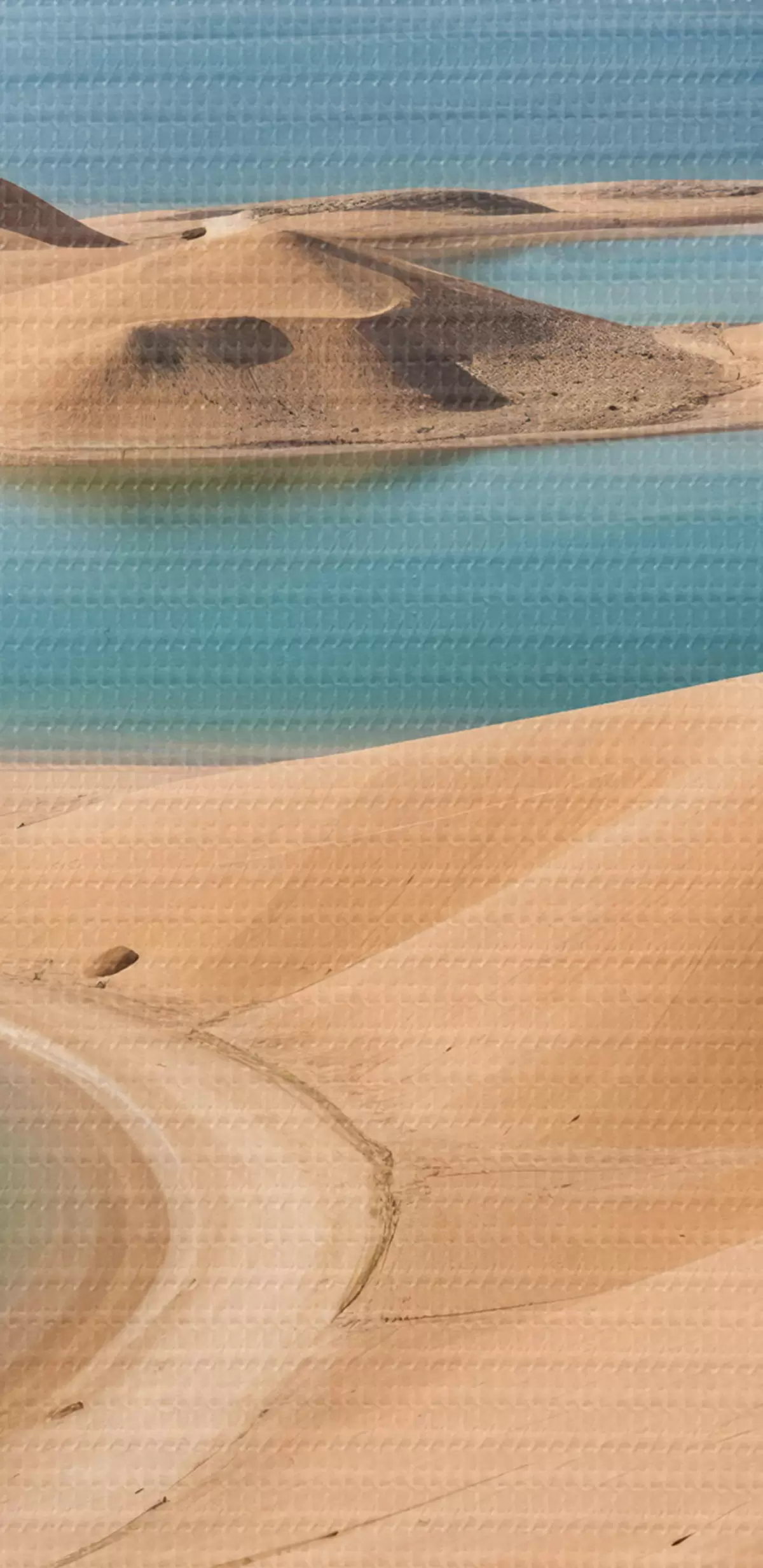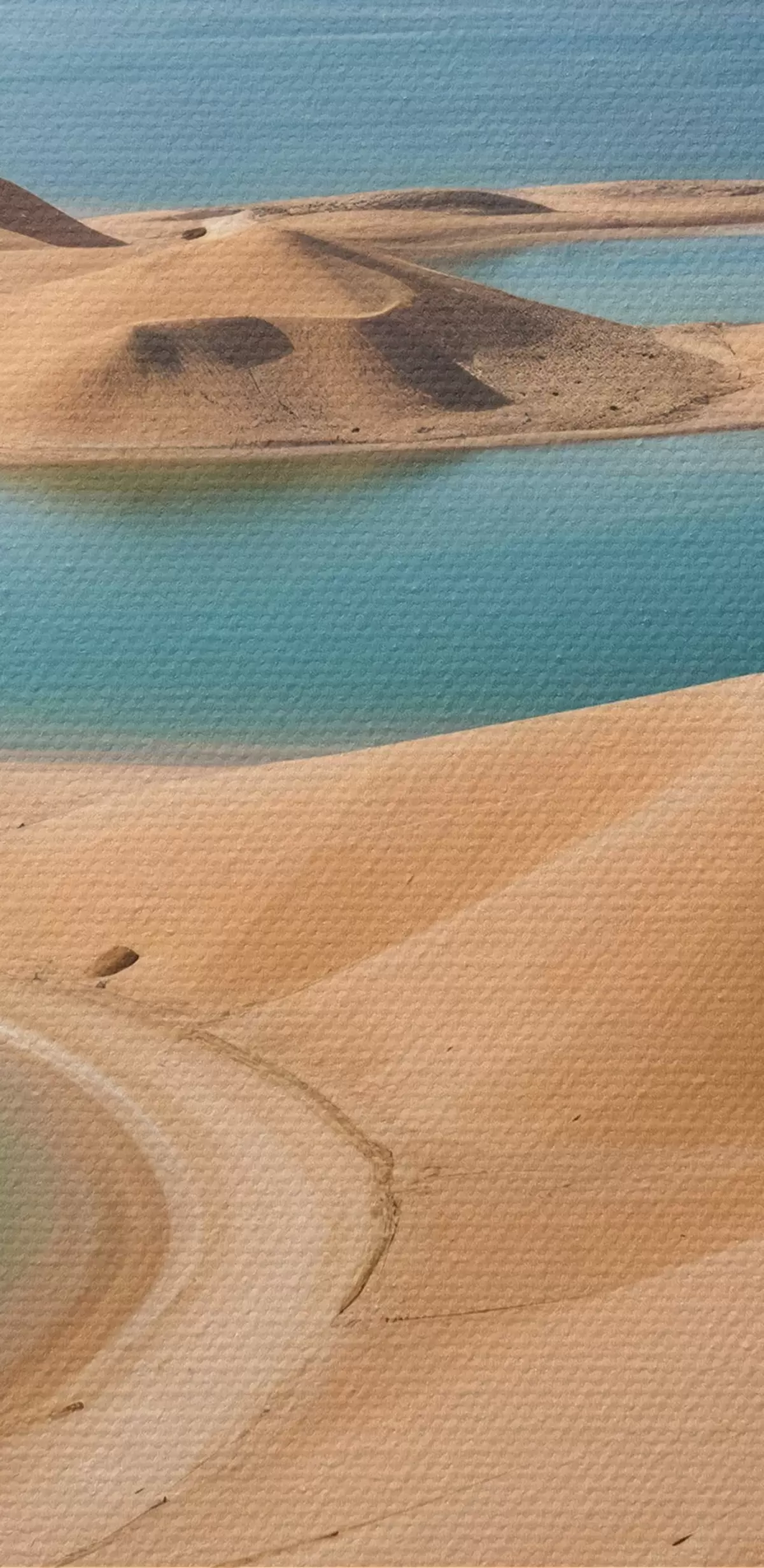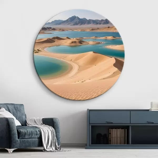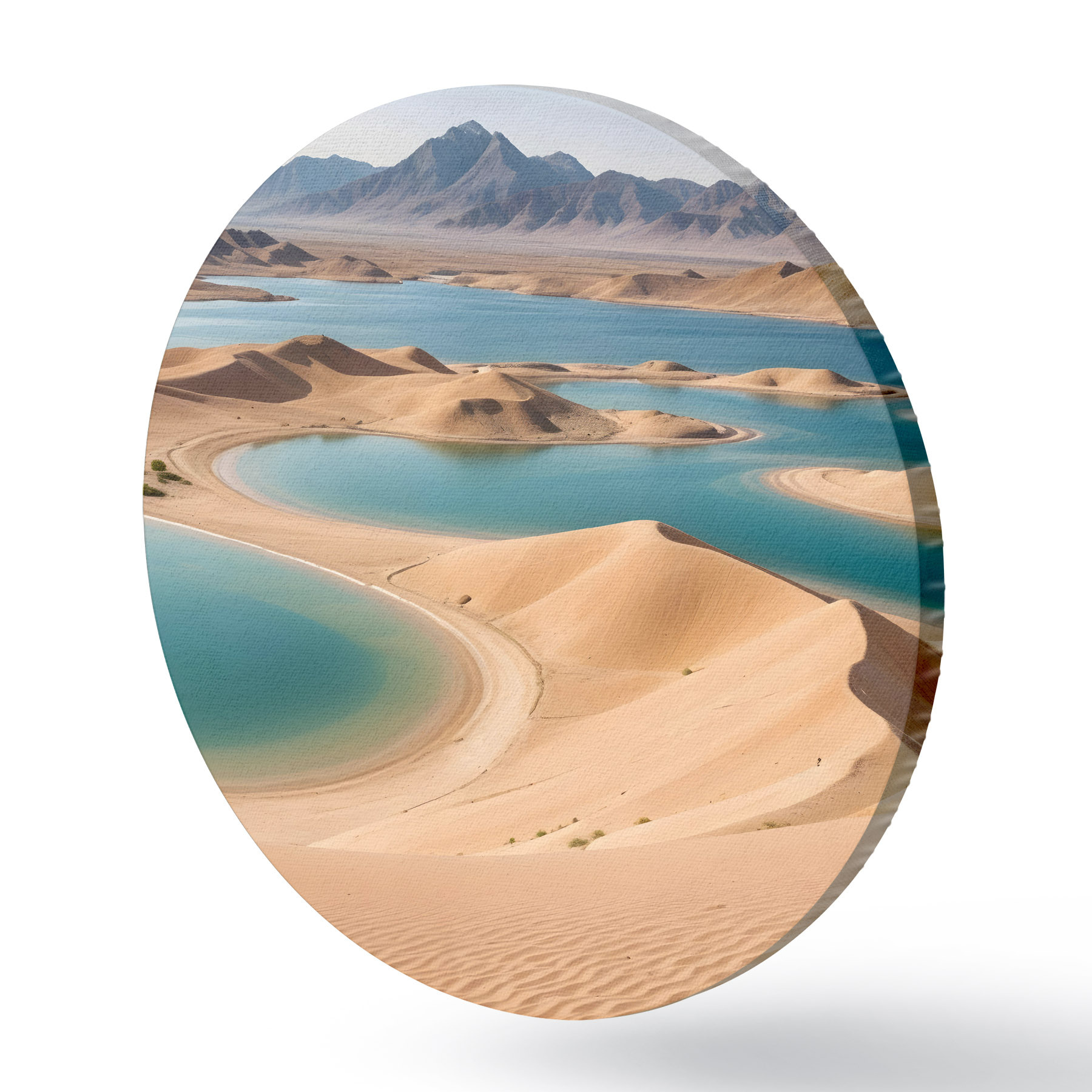 Cuadros redondos Un vasto paisaje desértico con dunas onduladas y lagos de color turquesa, rodeado de escarpadas montañas r41087