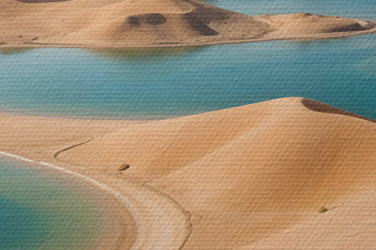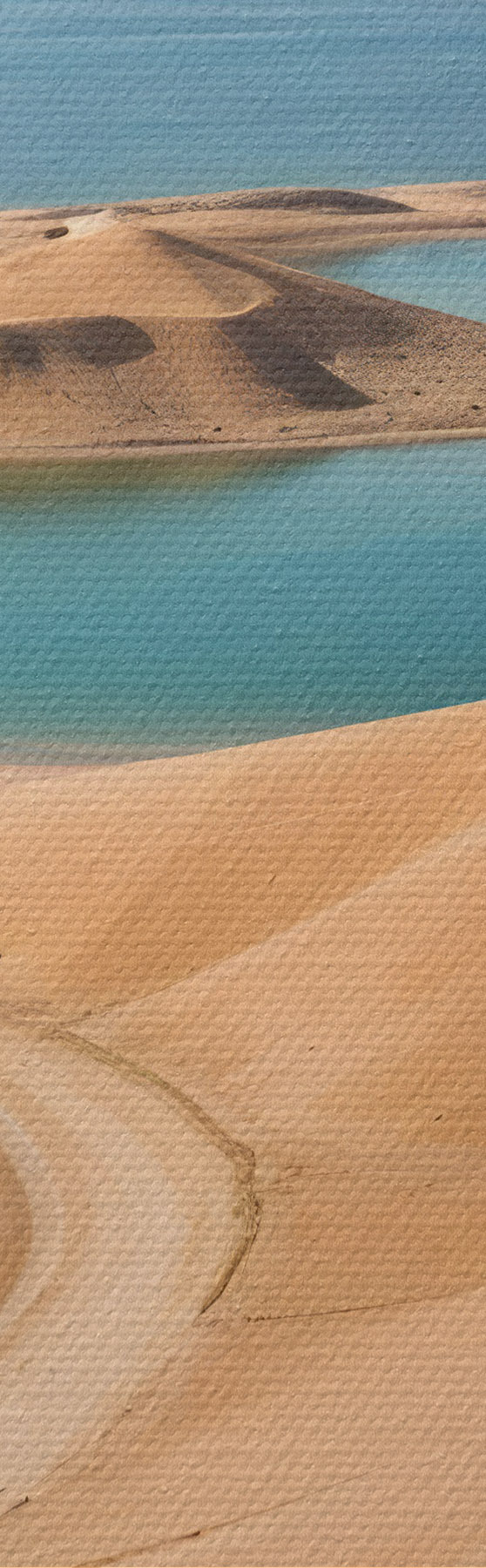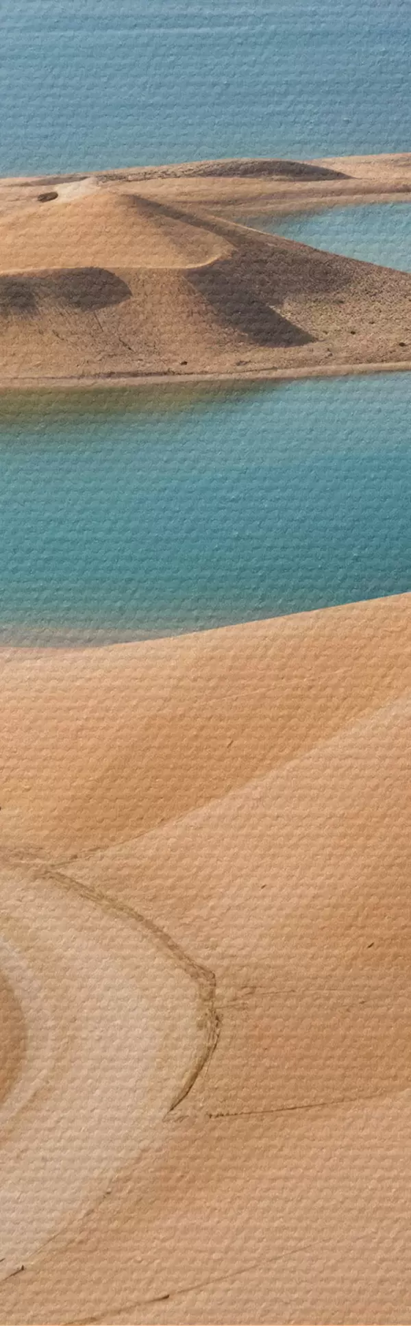 Cuadros redondos Un vasto paisaje desértico con dunas onduladas y lagos de color turquesa, rodeado de escarpadas montañas r41087