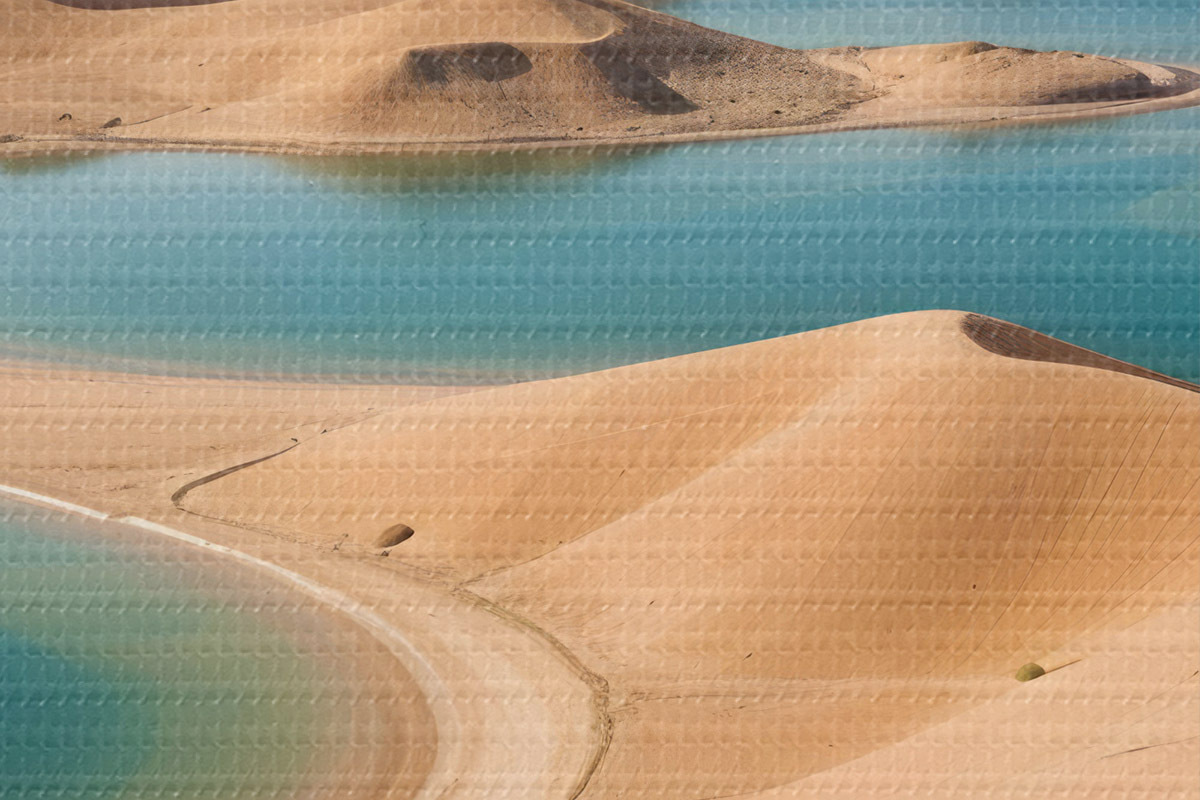 Foto Un vasto paisaje desértico con dunas onduladas y lagos de color turquesa, rodeado de escarpadas montañas Nr r41087