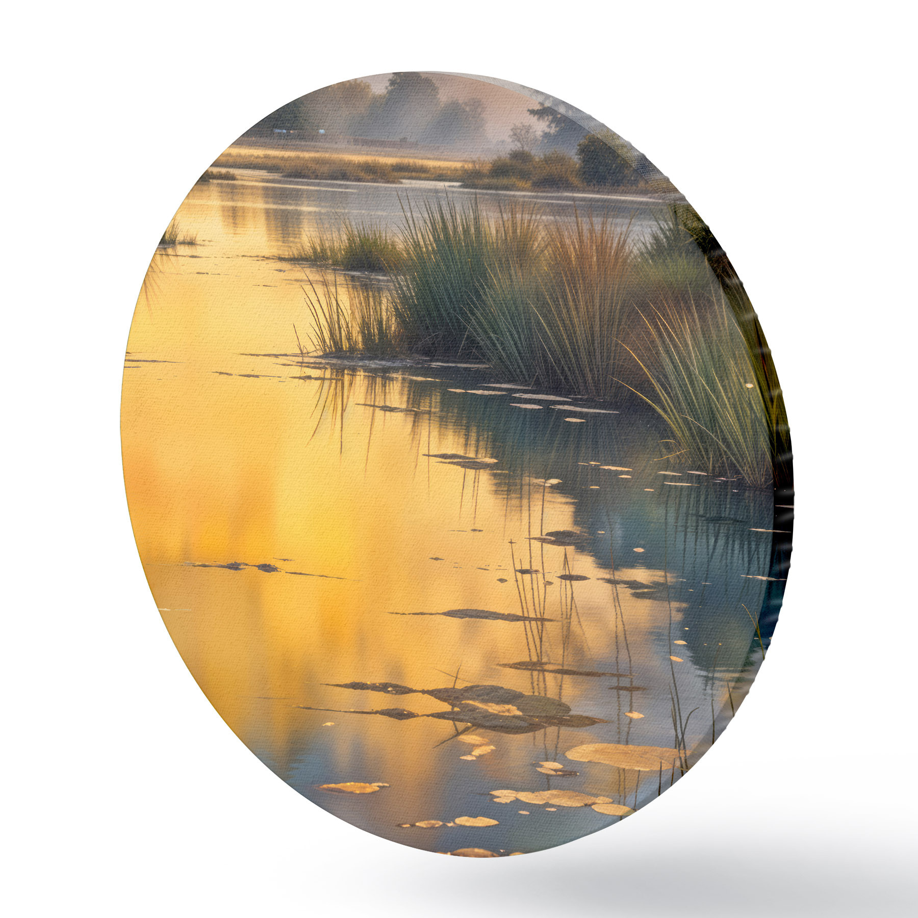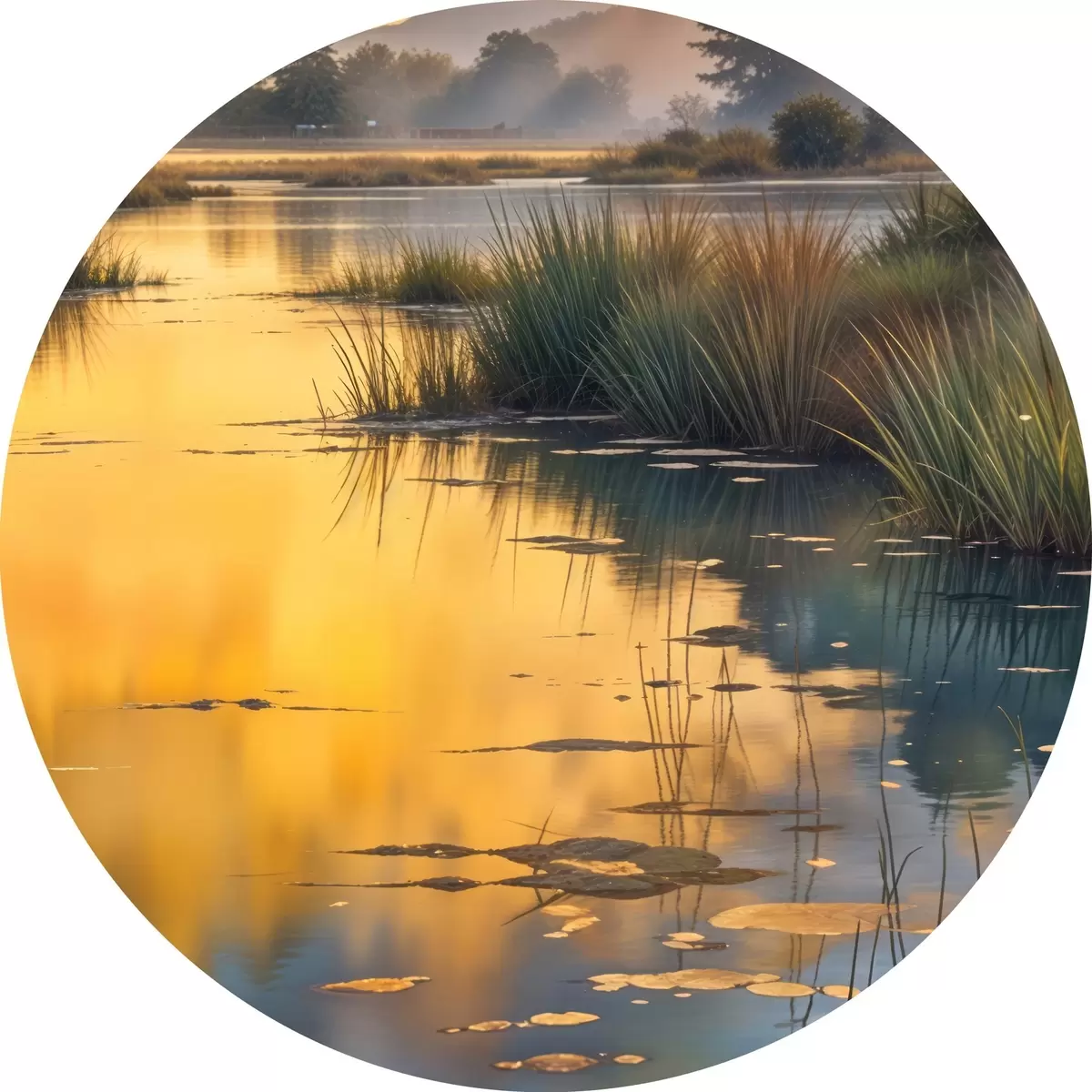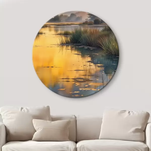 Cuadros redondos Lago tranquilo rodeado de pinos al atardecer, con niebla y aguas tranquilas r41088