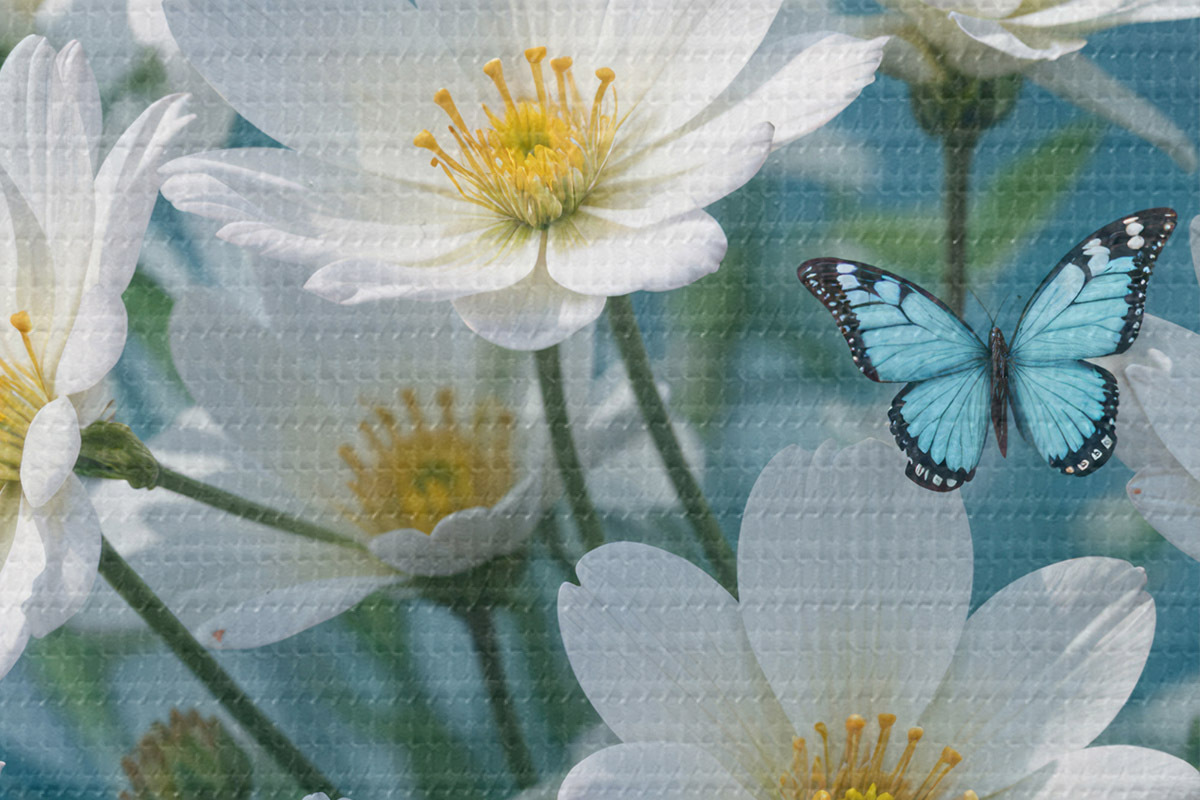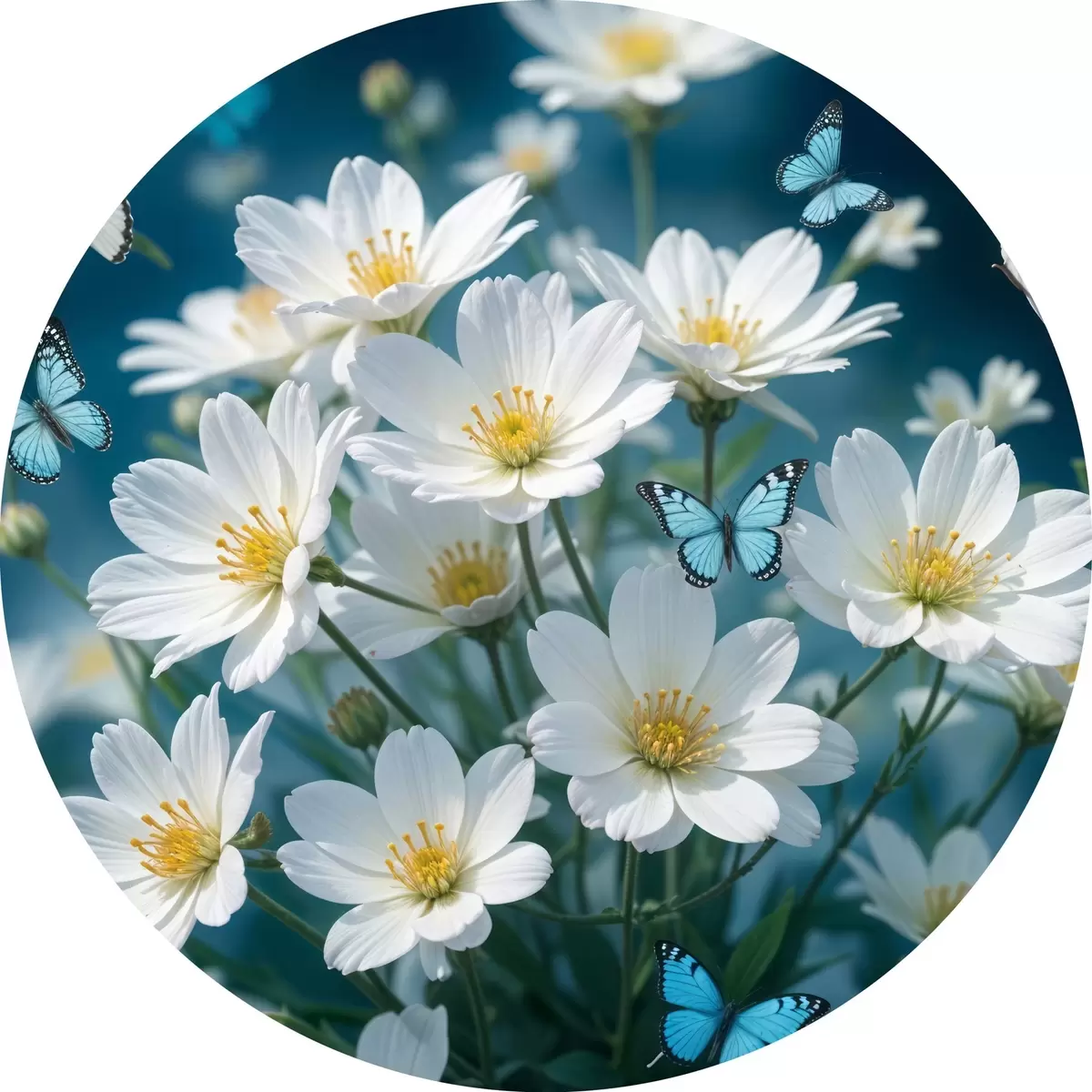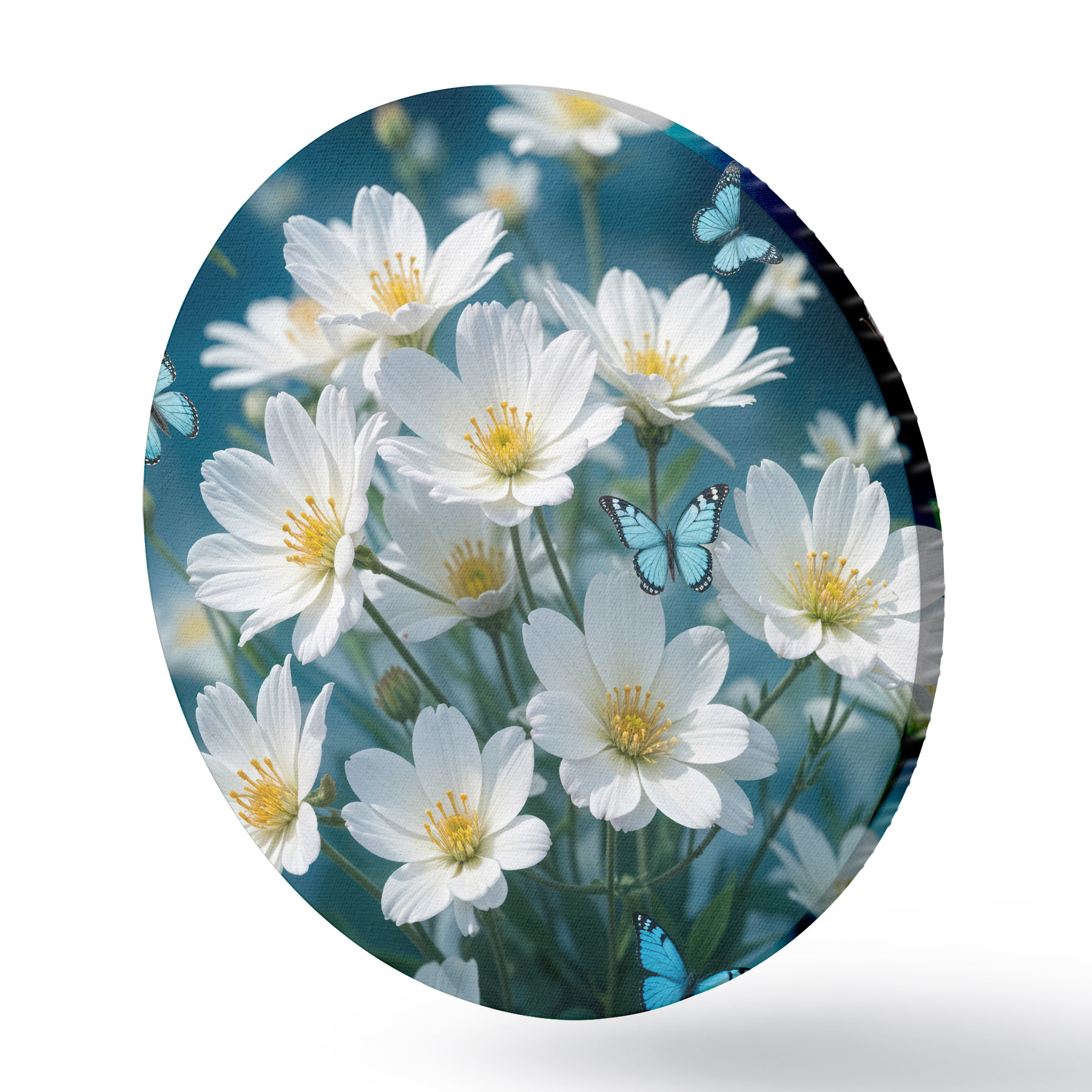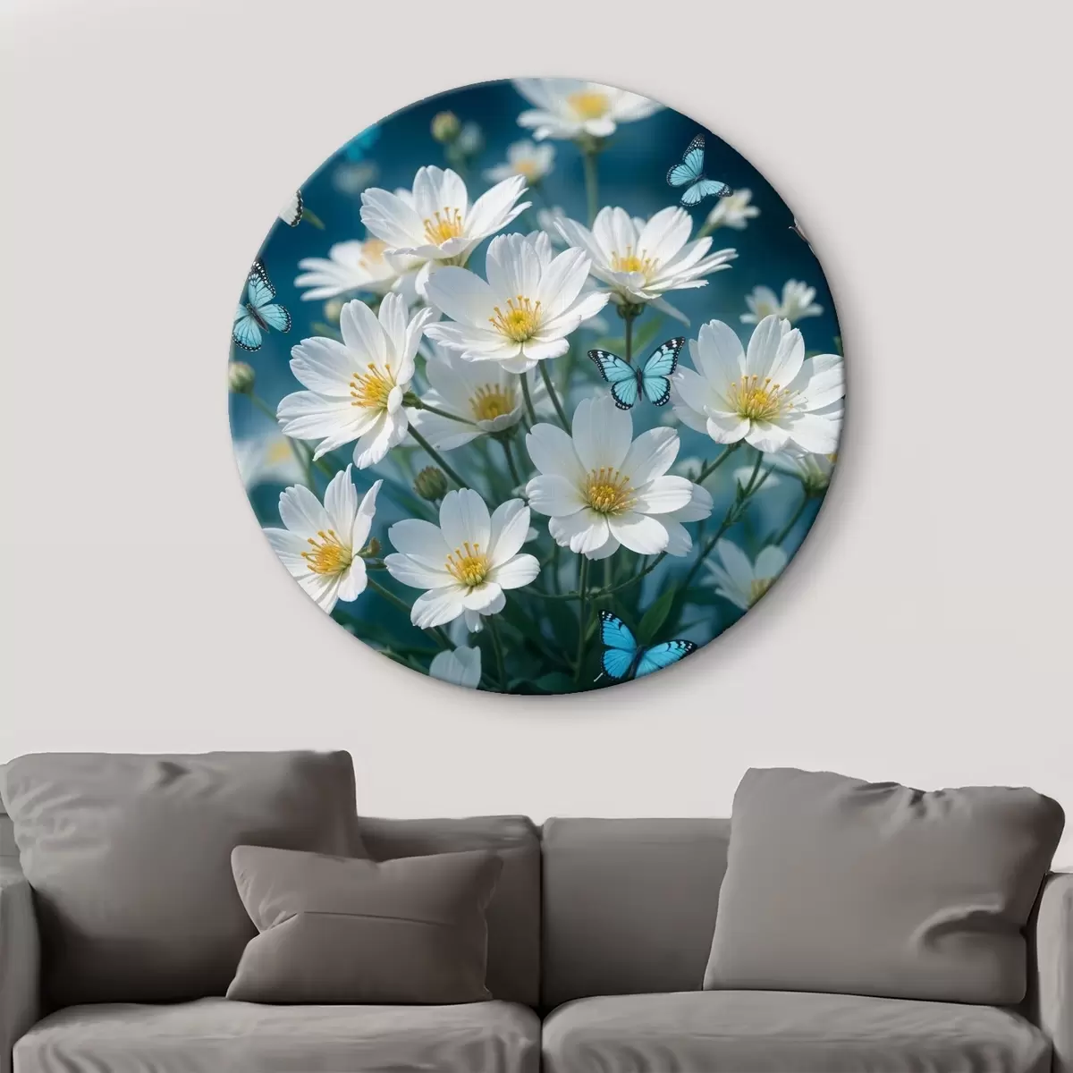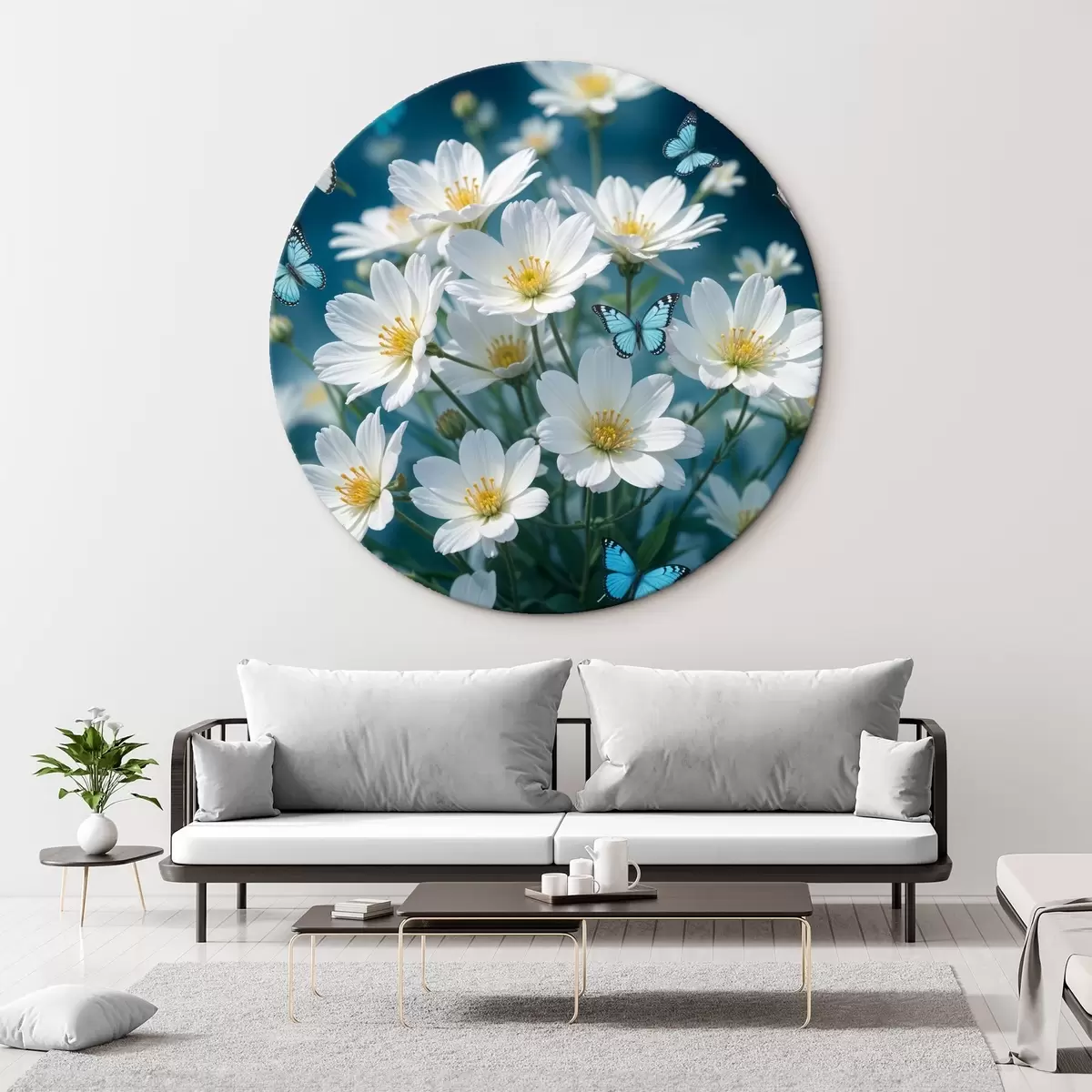 Cuadros redondos Un campo de flores de margaritas blancas con mariposas azules revoloteando entre ellas sobre un fondo azul borroso r41096