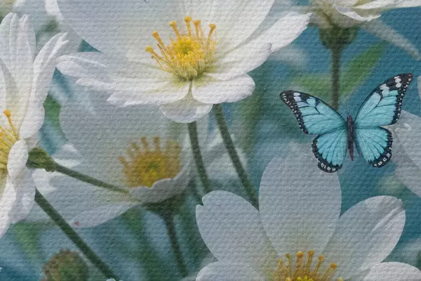 Foto Un campo de flores de margaritas blancas con mariposas azules revoloteando entre ellas sobre un fondo azul borroso Nr r41096
