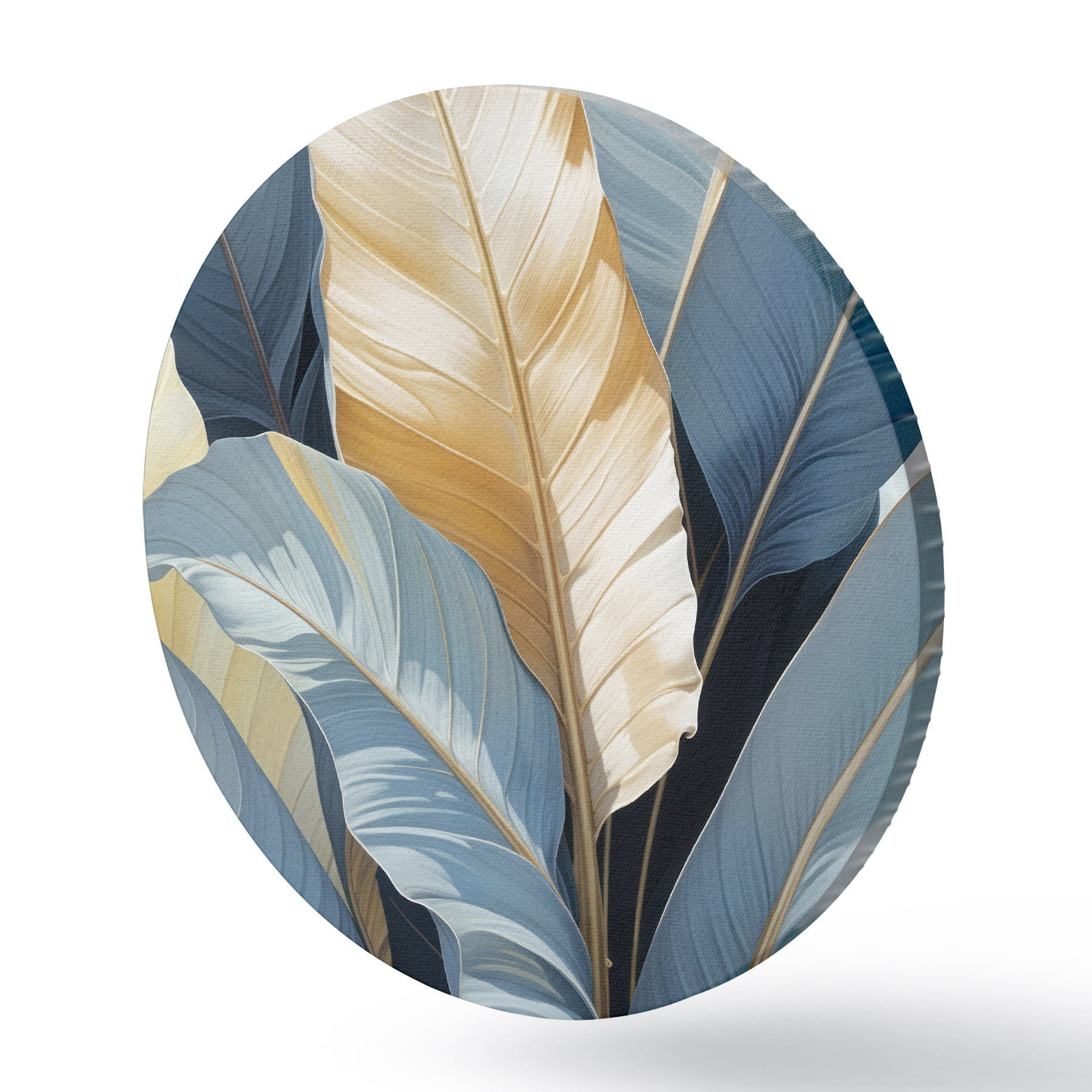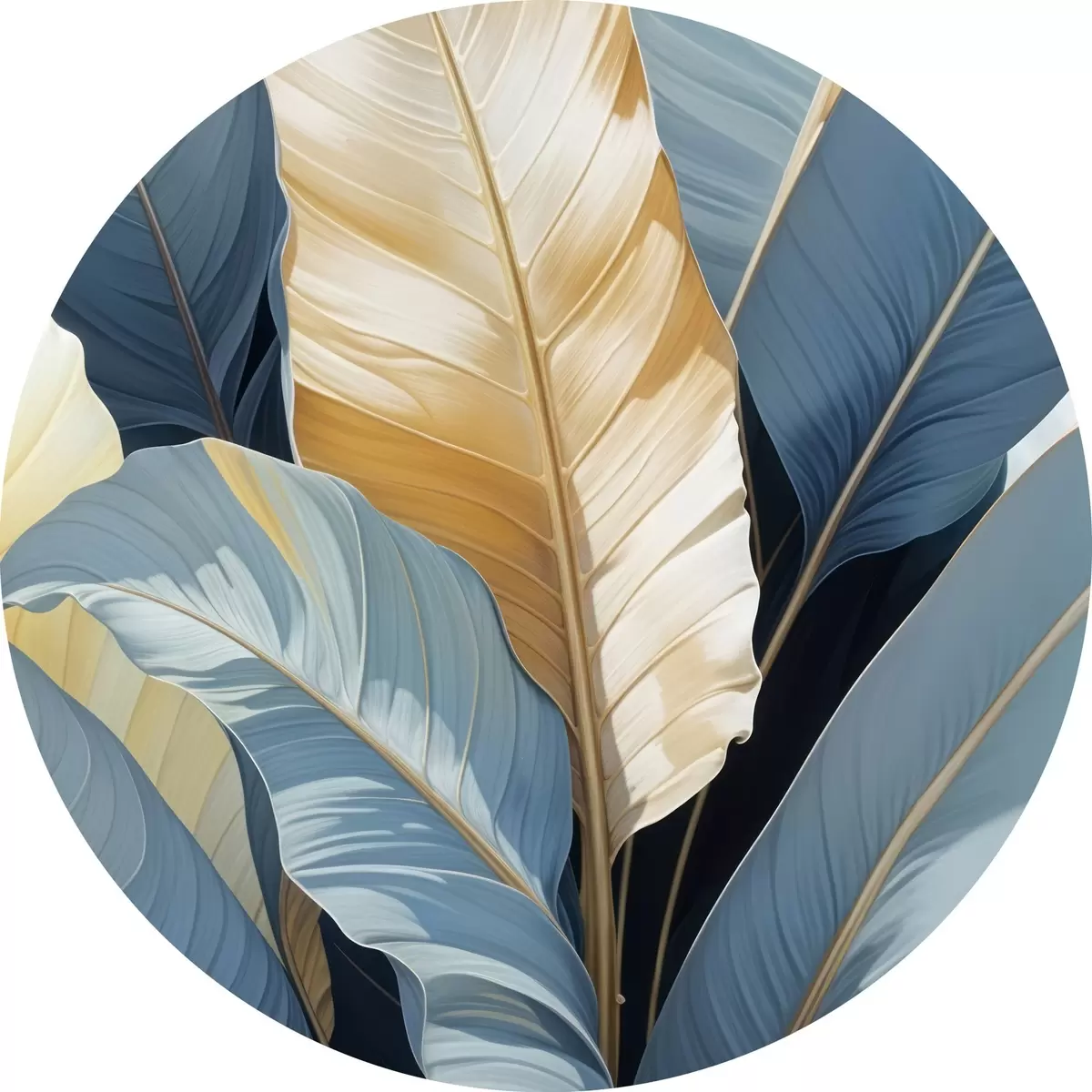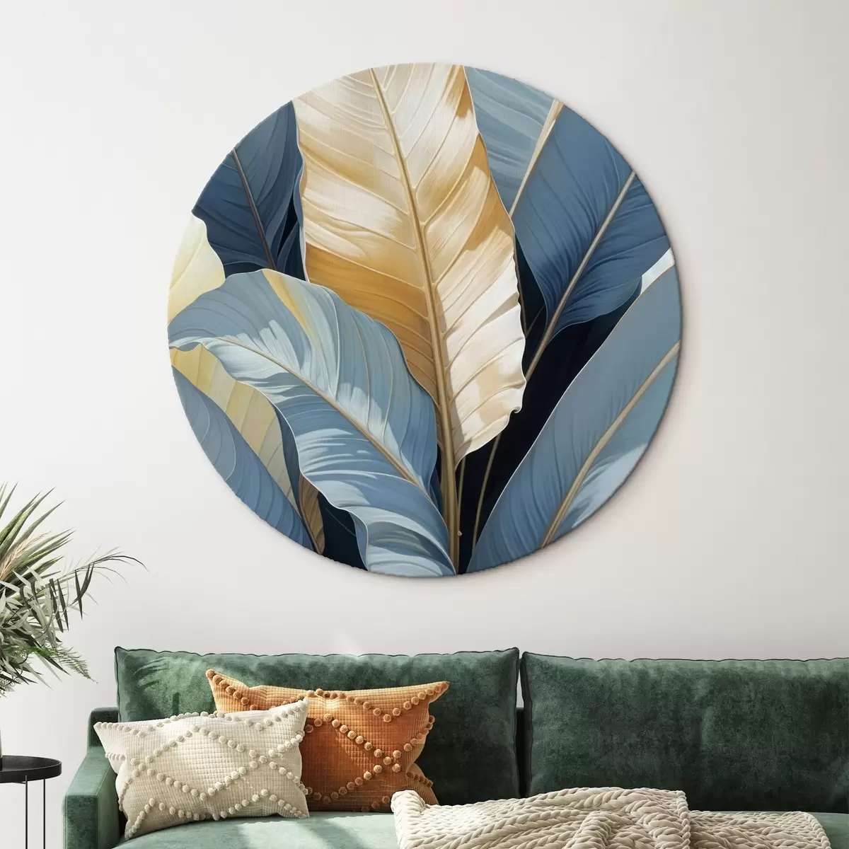 Cuadros redondos Hojas tropicales con tonos azules y amarillos, grandes hojas de palmera o plátano con un exuberante fondo natural r41097