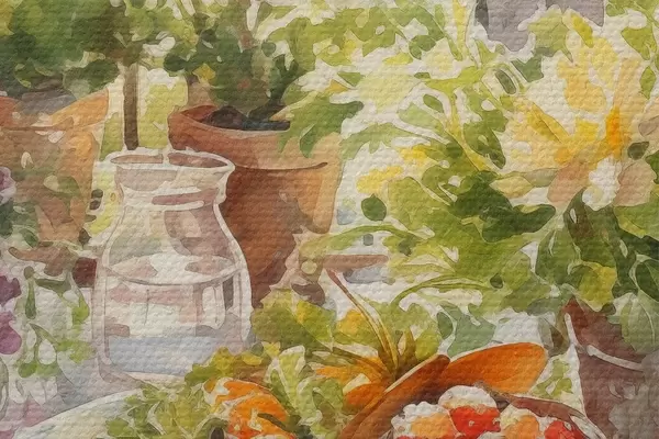 Foto Cena romántica con vistas a la ciudad, acuarela, flores Nr r41168