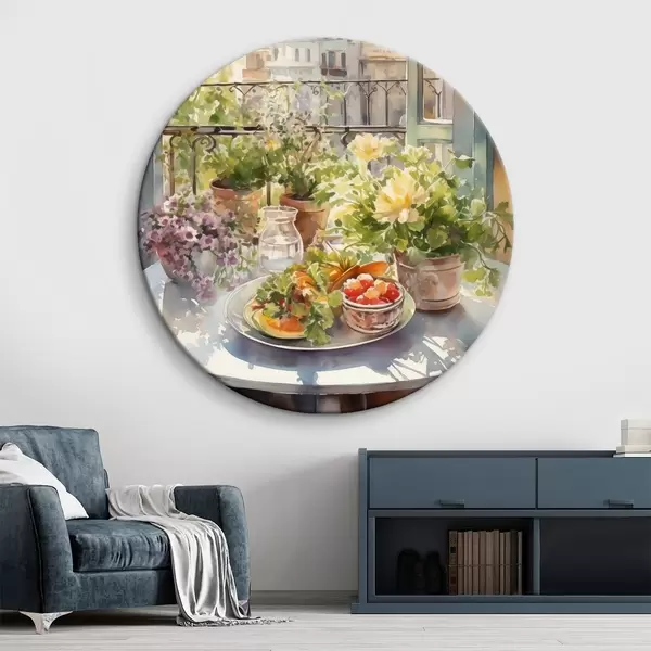 Cuadros redondos Cena romántica con vistas a la ciudad, acuarela, flores r41168