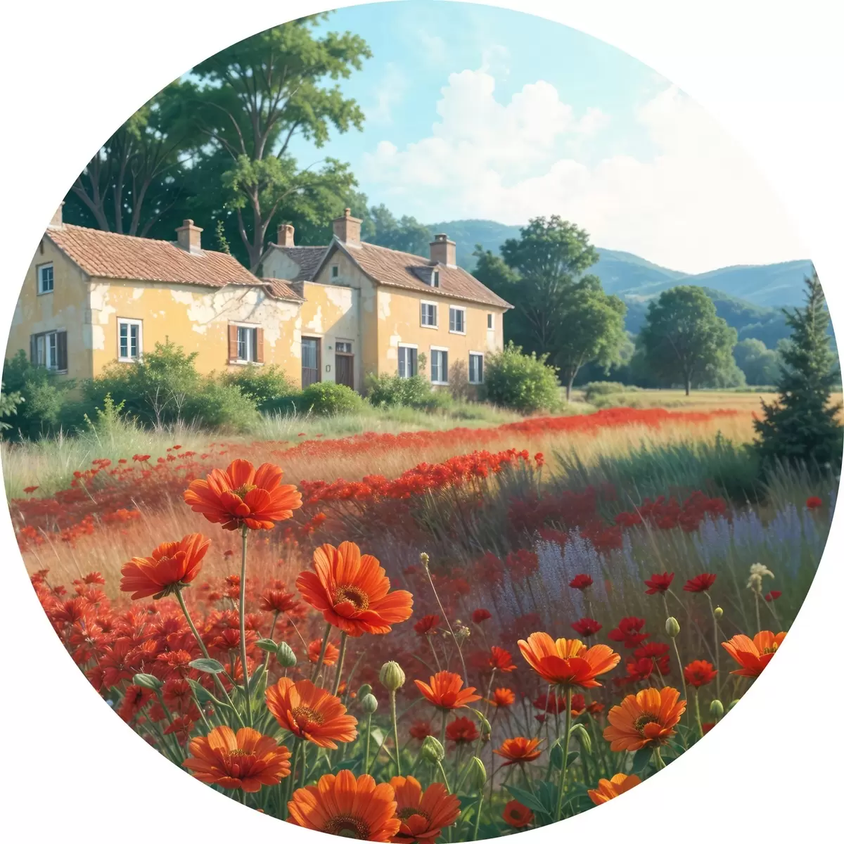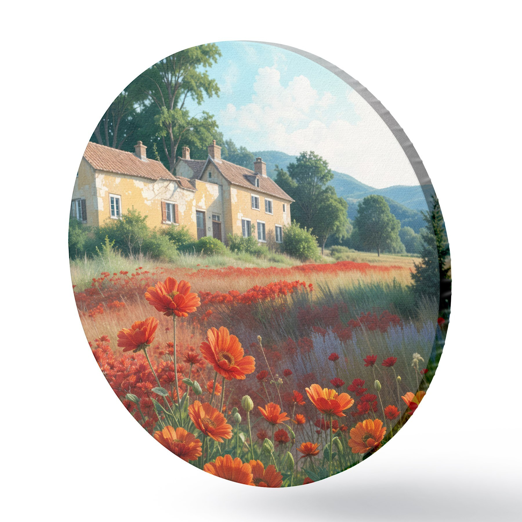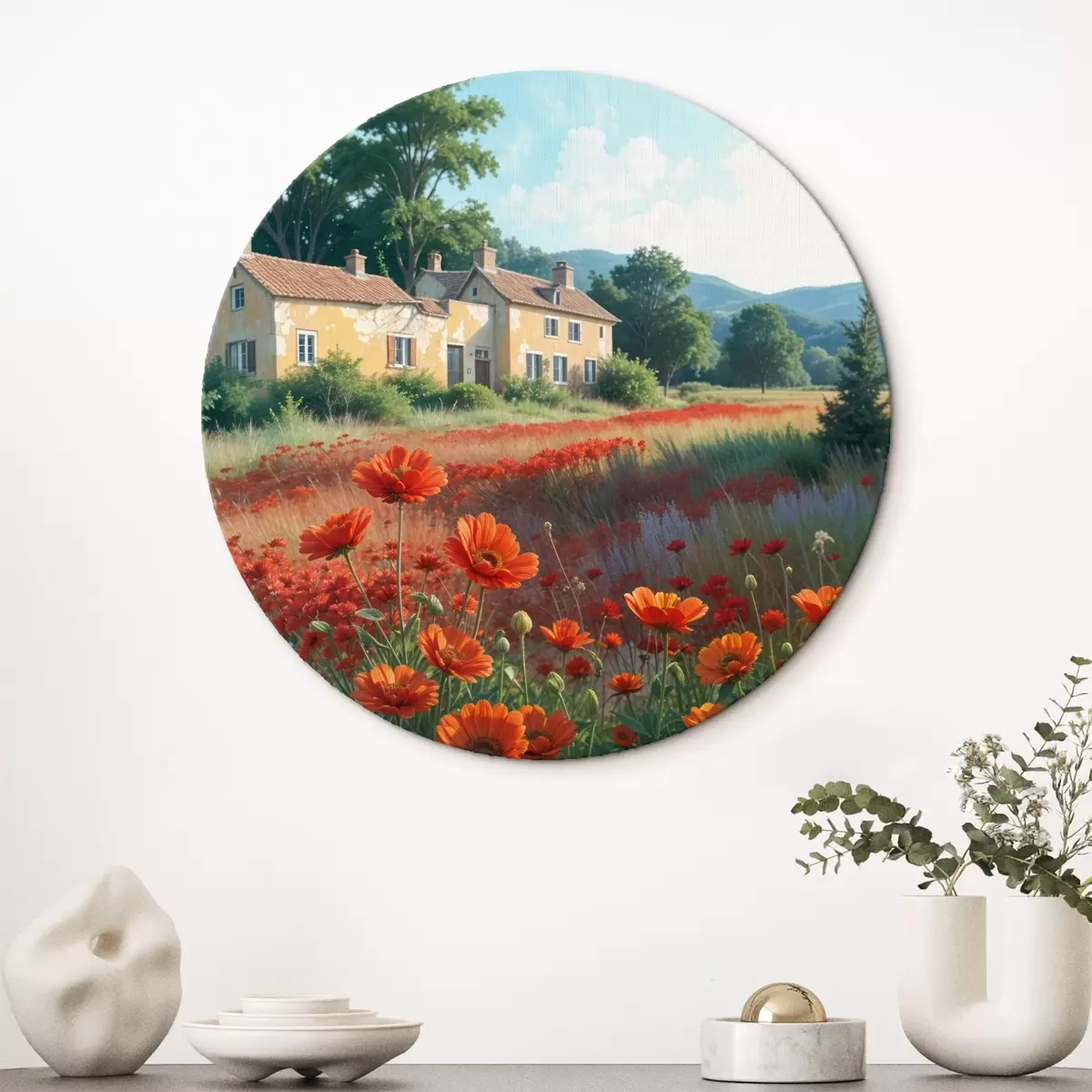 Cuadros redondos Un campo de vibrantes amapolas rojas en primer plano, con una hilera de encantadoras casas amarillas y blancas al fondo r41260