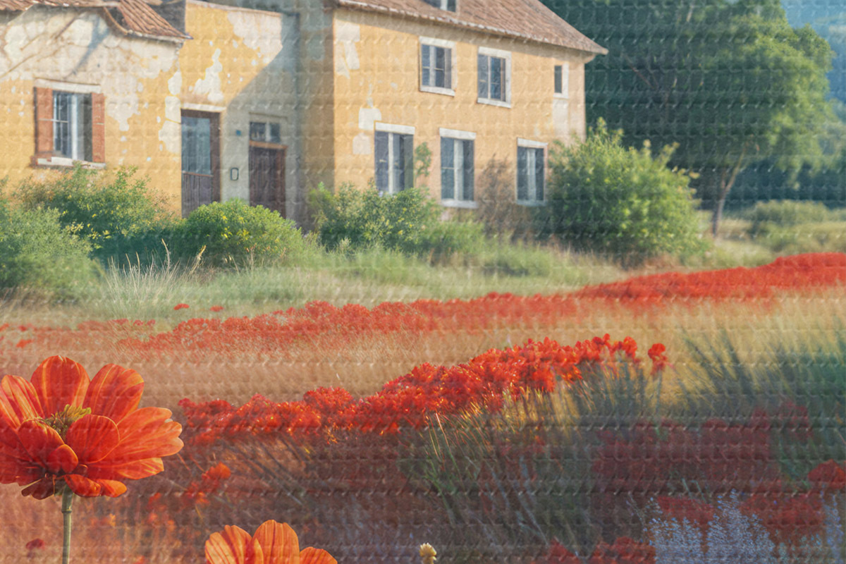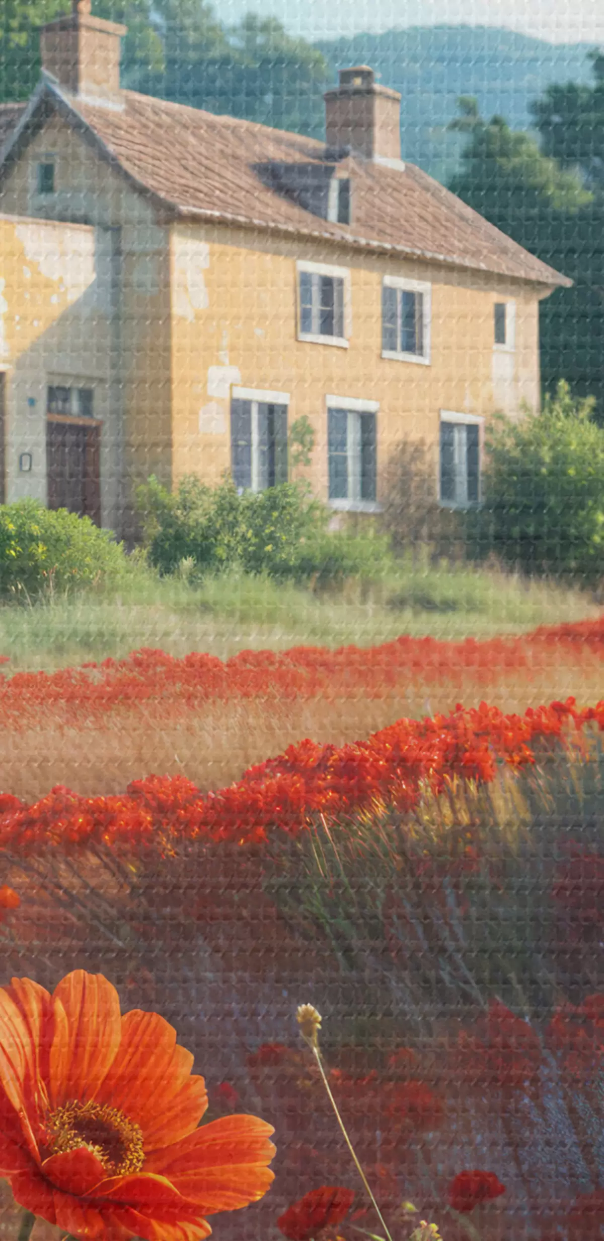 Foto Un campo de vibrantes amapolas rojas en primer plano, con una hilera de encantadoras casas amarillas y blancas al fondo Nr r41260
