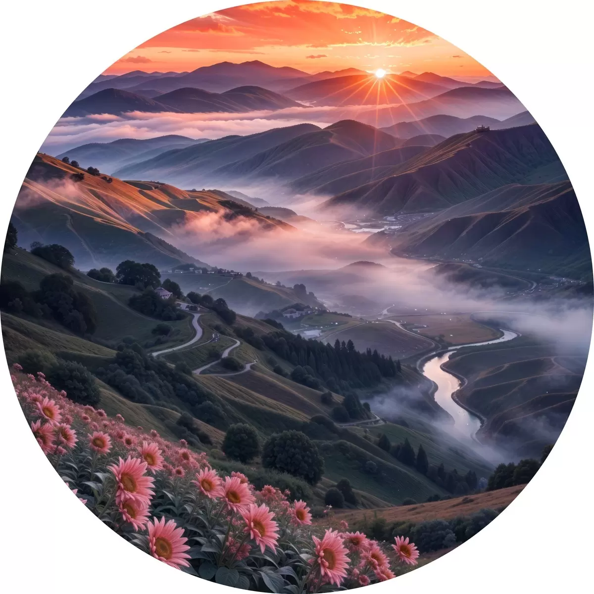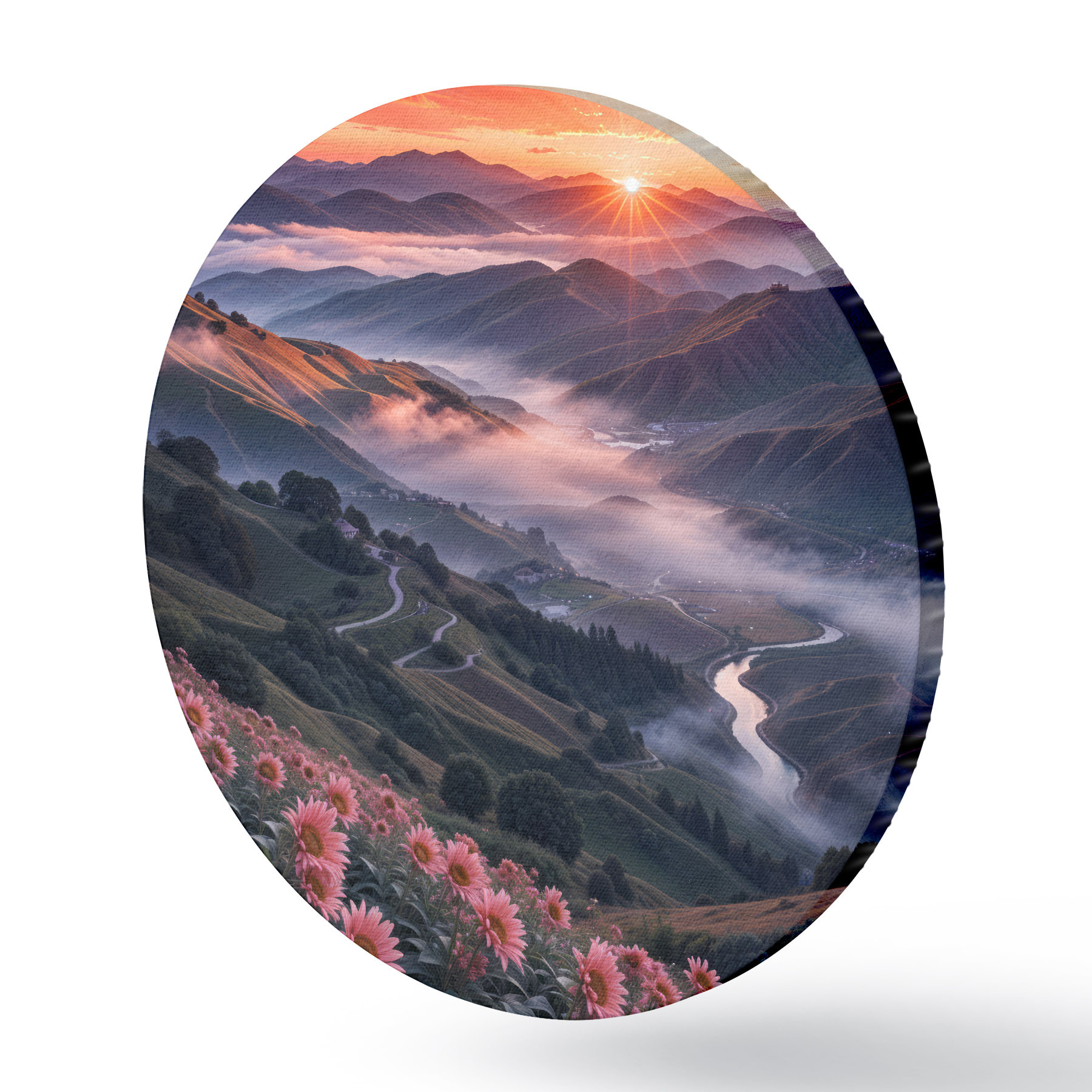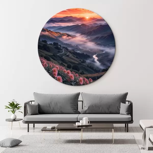 Cuadros redondos Impresionante paisaje con una vívida puesta de sol sobre una región montañosa con racimos de flores rosas r41263